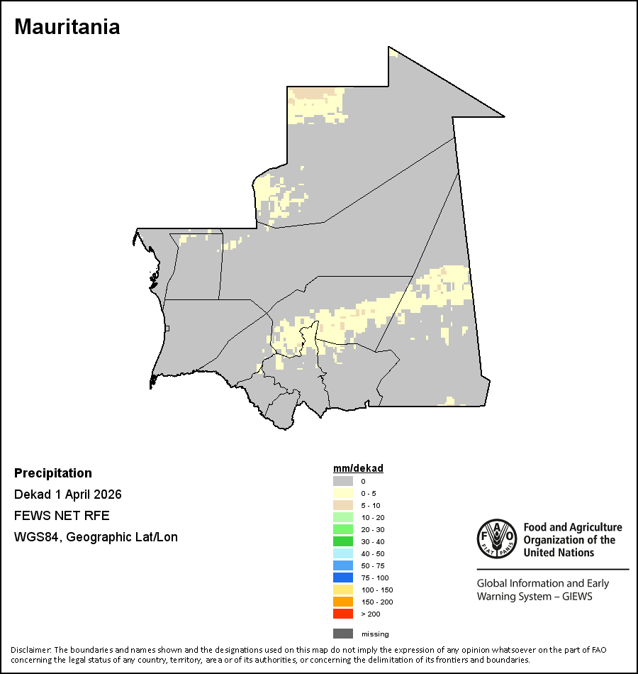 На карте изображены кумулятивные объемы осадков в декаду (10-дневный период). Оценки атмосферных осадков для всех африканских стран (за исключением Кабо-Верде и Маврикия) получены из системы NOAA/Системы раннего предупреждения об опасности голода, а по остальным странам данные получены из системы ECMWF.