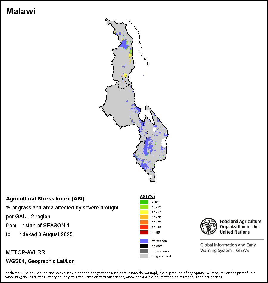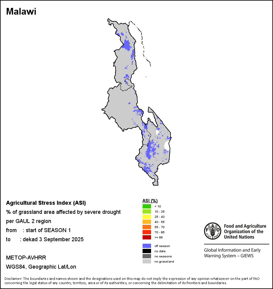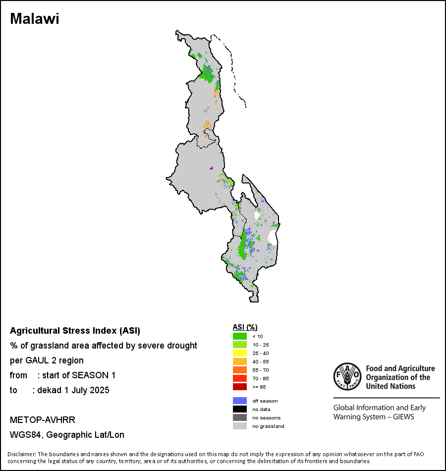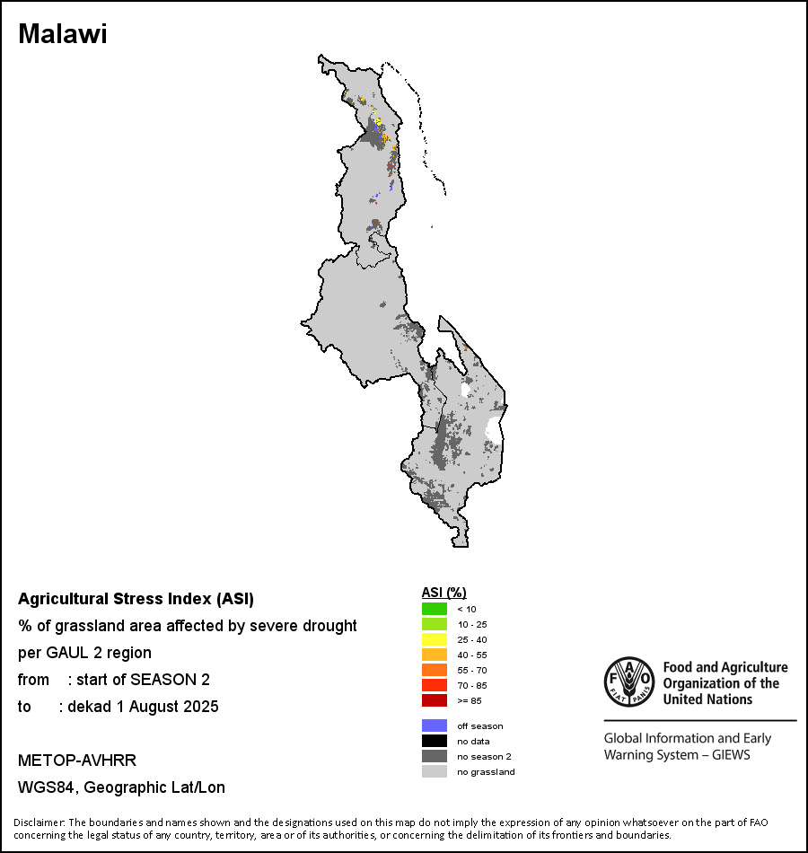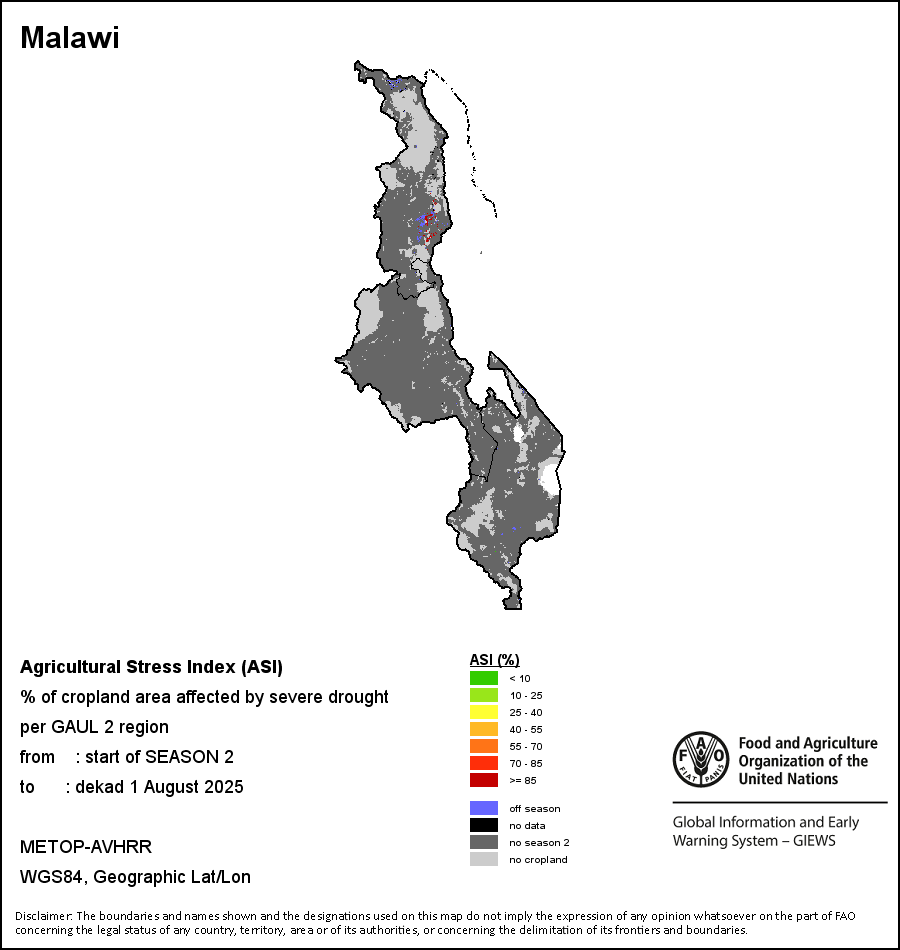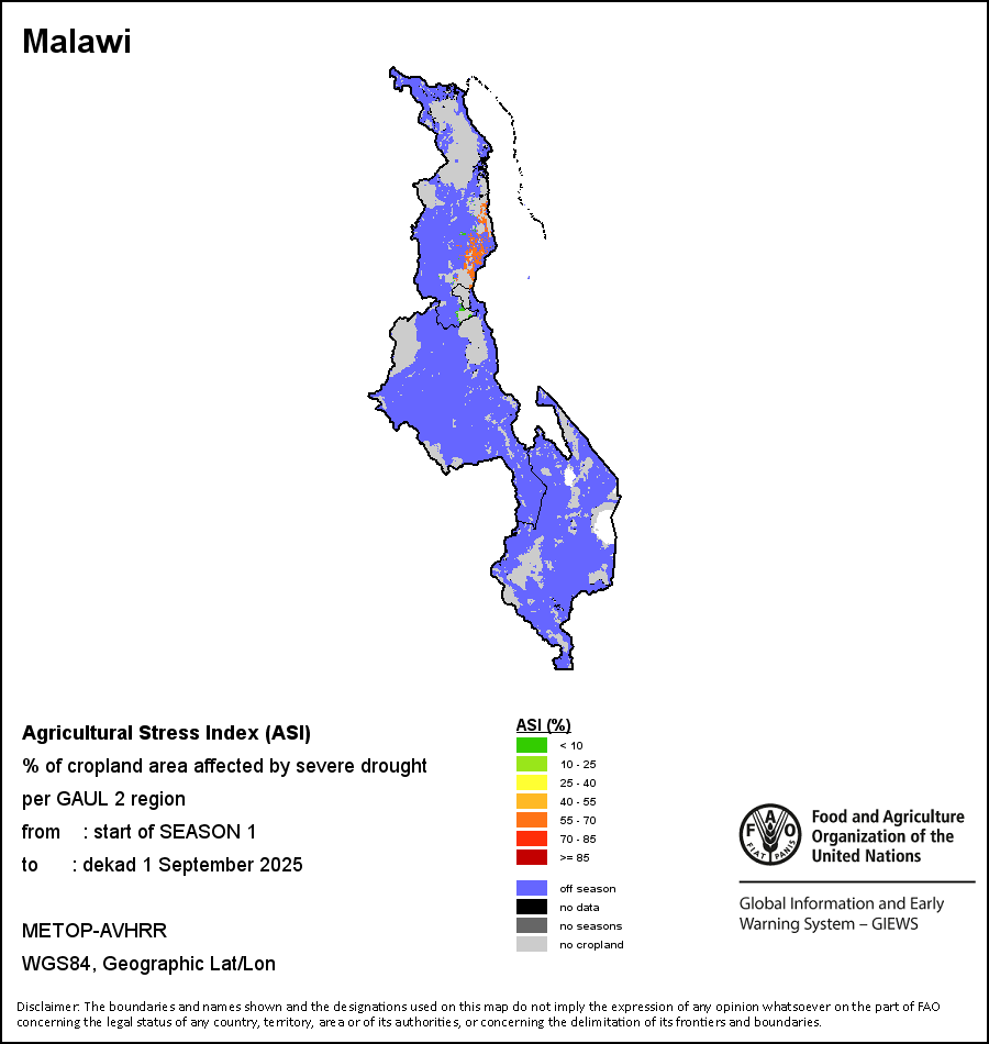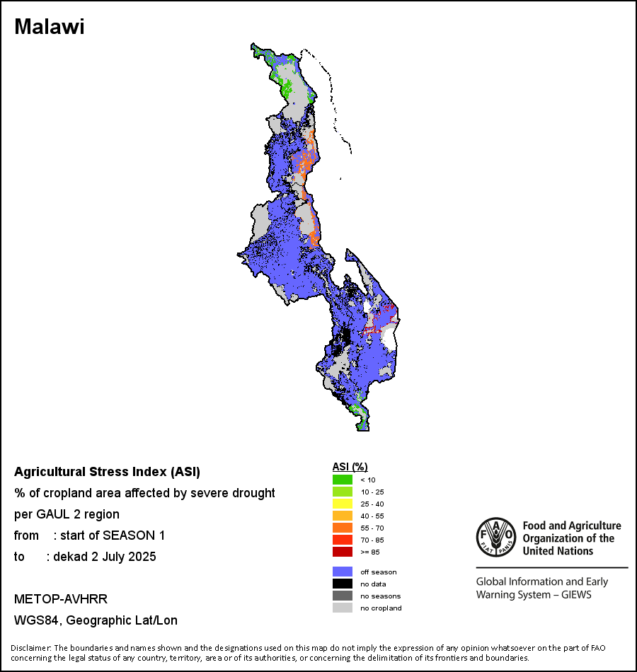 农业干旱胁迫指数(ASI)是一项速览指数,有助于在早期甄别较大可能发生水胁迫(干旱)的耕地。 该指数通过整合植被健康指数(VHI)在评估农业旱情方面具有关键意义的两个维度,即时间和空间维度,而得出。计算农业干旱胁迫指数的第一步是求植被健康指数的时间平均值,对作物周期内旱情的强度和时长进行像素级评估;这项计算包括采用作物系数衡量某种作物在各物候阶段对干旱胁迫的敏感度。第二步是确定旱情的空间广度,方法是计算植被健康指数值低于35%(Kogan前期研究将这一数值确定为评估干旱程度的临界值,1995年)的耕地的像素百分比。然后把各个行政区域根据受影响面积的百分比进行划分,便于对结果进行快速解读。