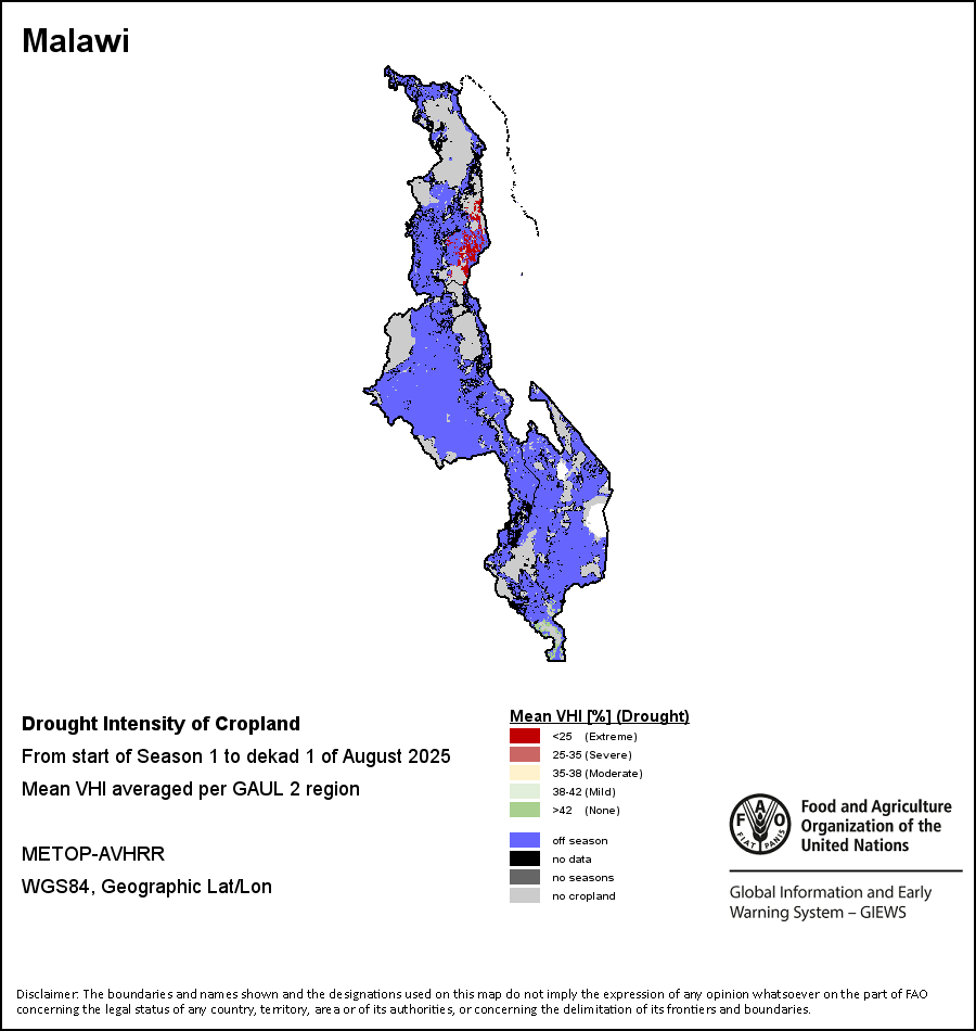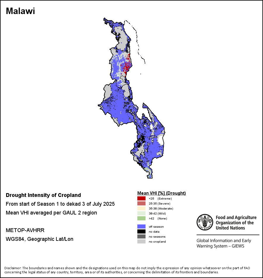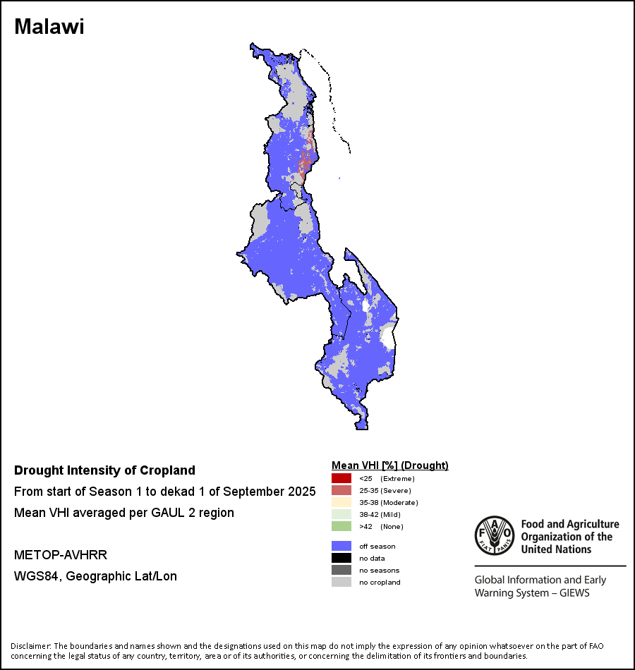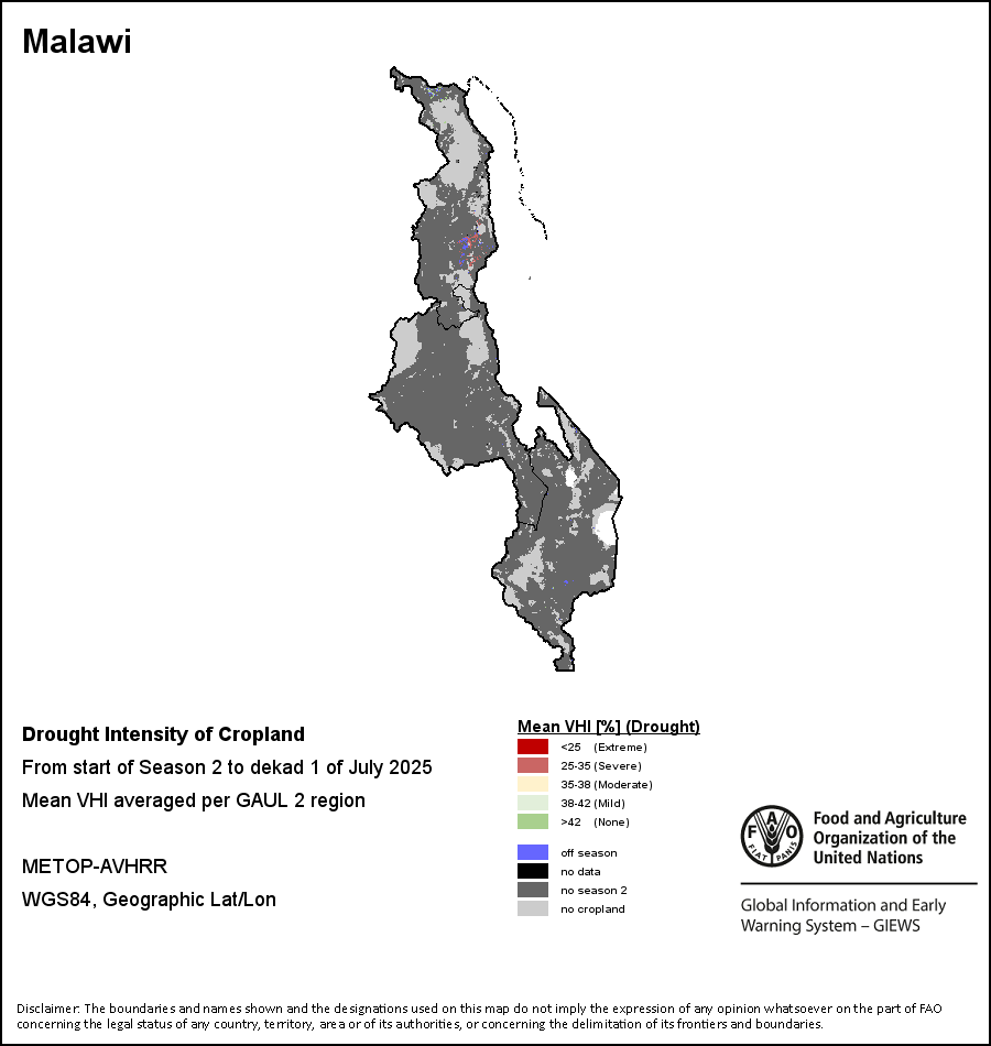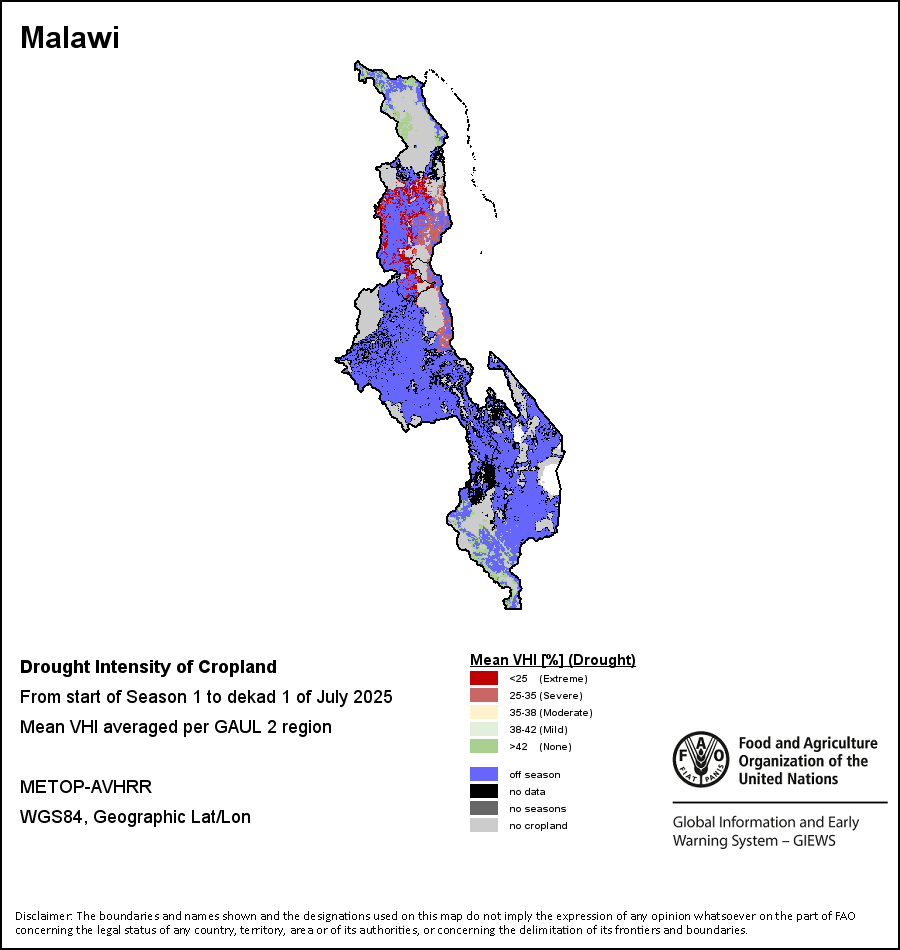 农业干旱依据其强度划分为四类:极端、严重、重度或轻度。干旱的强度通过各全球行政单位分层制度二级区域(GAUL 2)地区累积加权平均植被健康指数计算得出,意味着植被健康状况越差旱情就越严重。