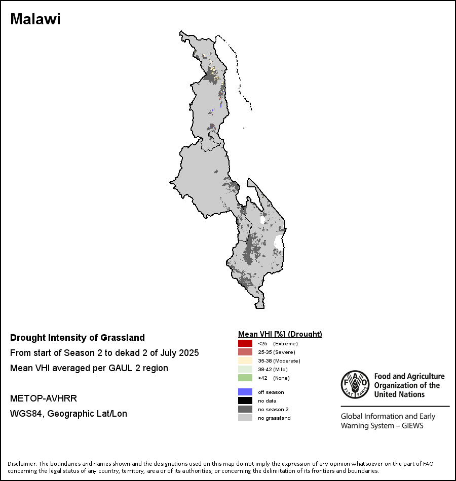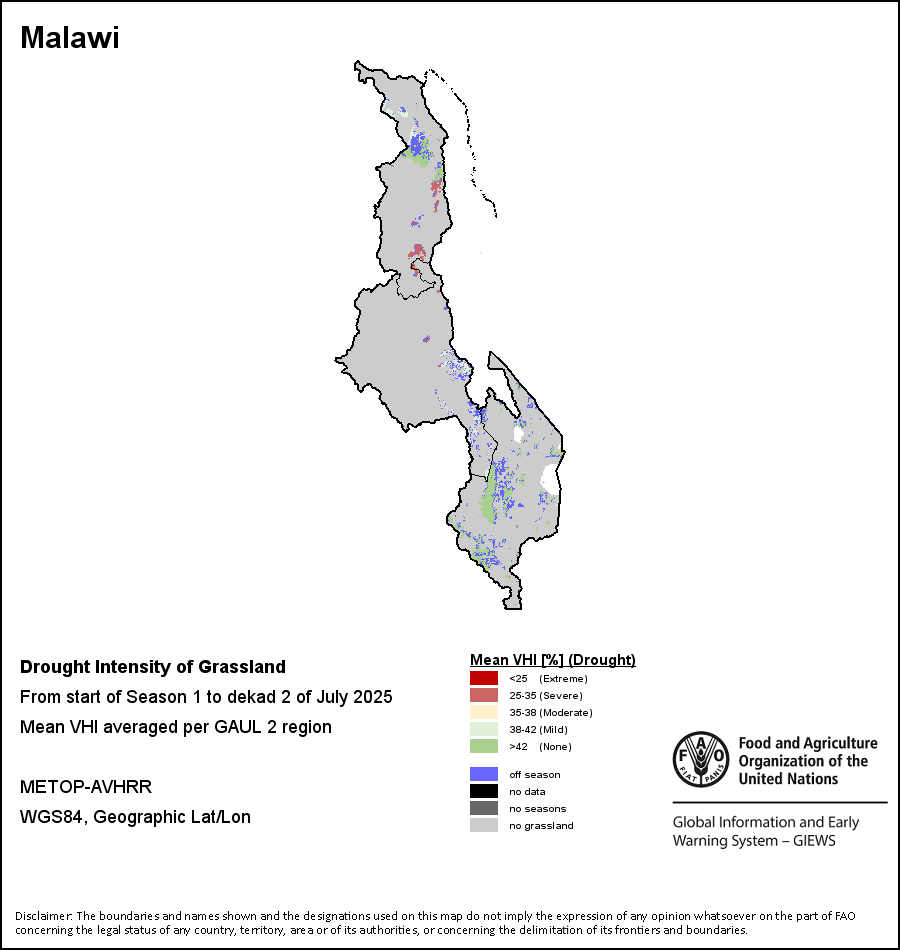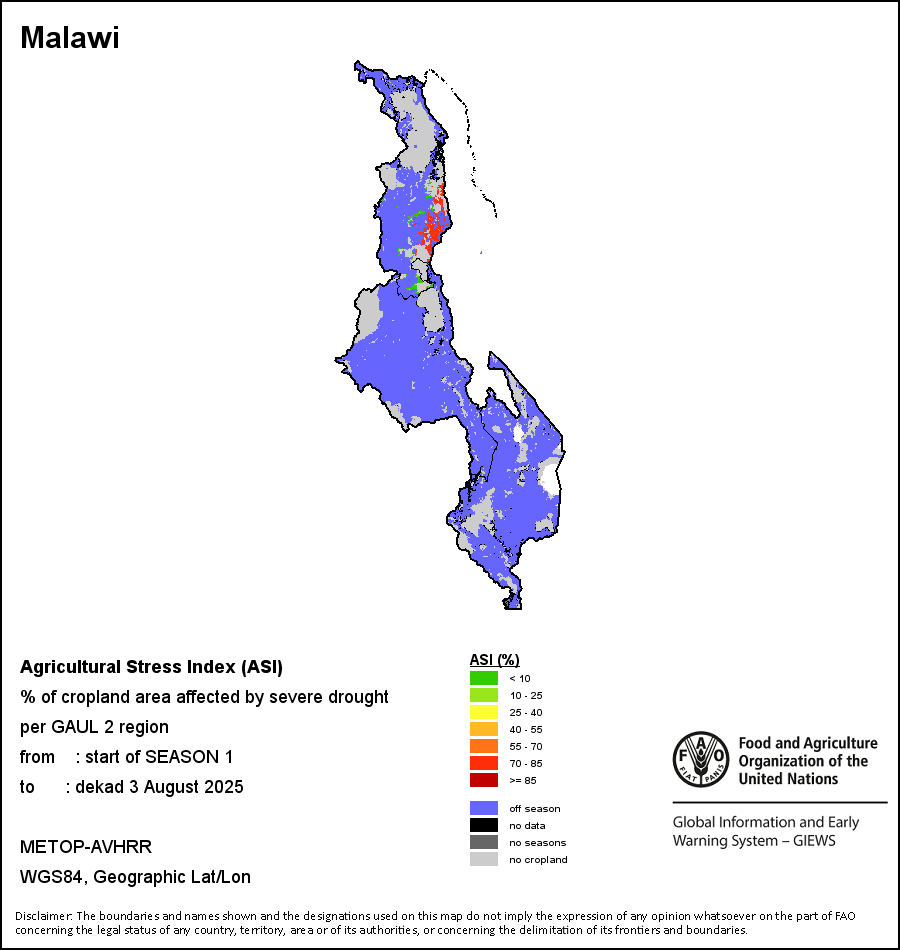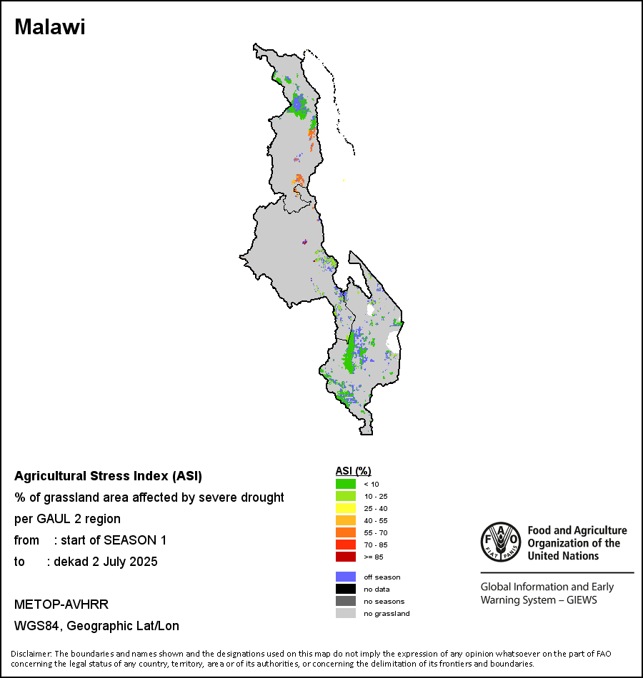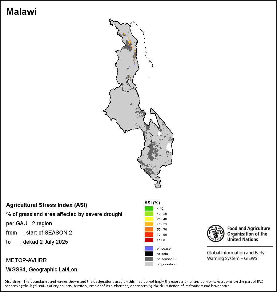 农业干旱依据其强度划分为四类:极端、严重、重度或轻度。干旱的强度通过各全球行政单位分层制度二级区域(GAUL 2)地区累积加权平均植被健康指数计算得出,意味着植被健康状况越差旱情就越严重。