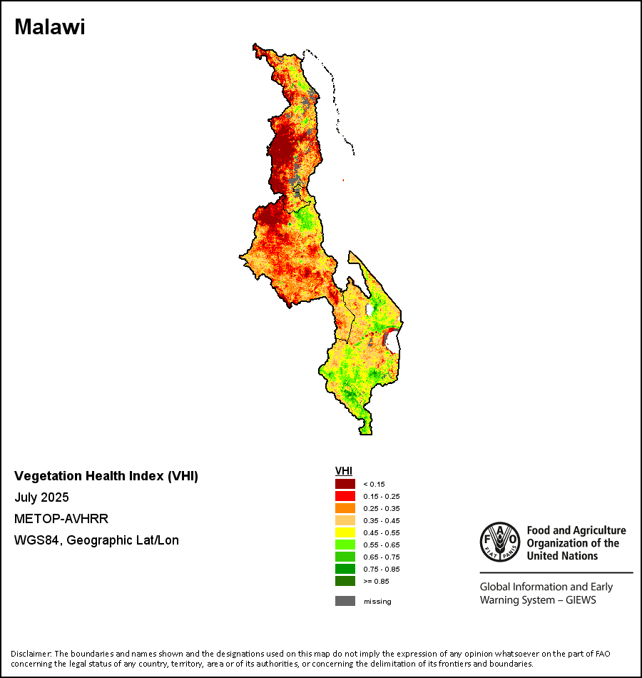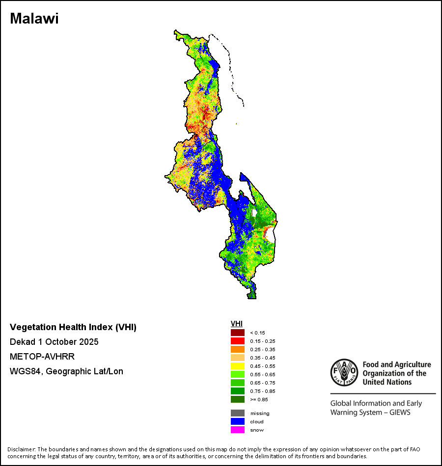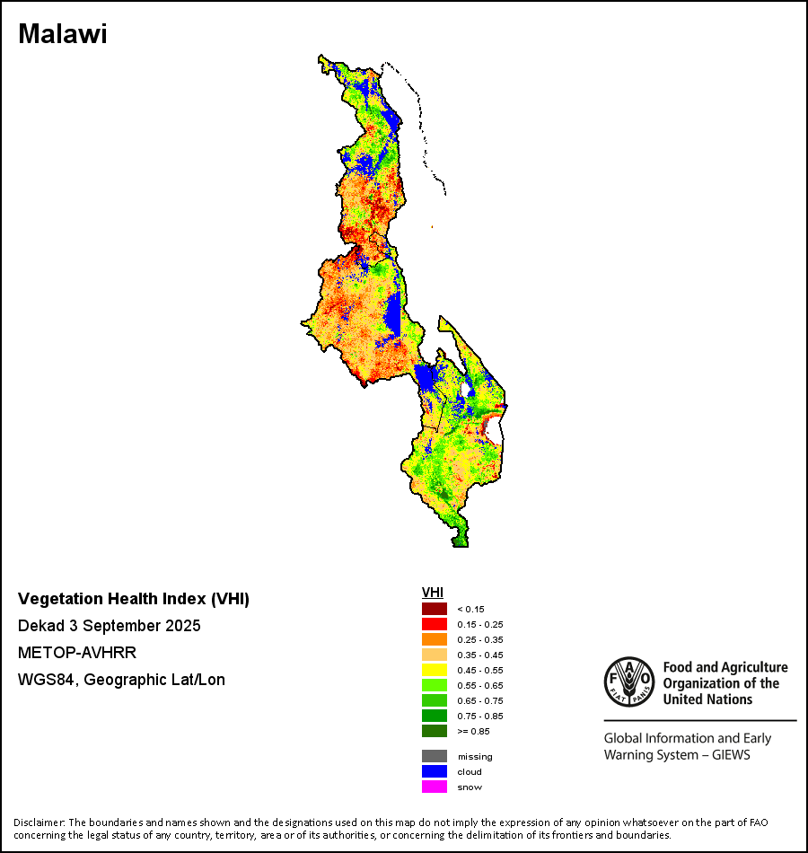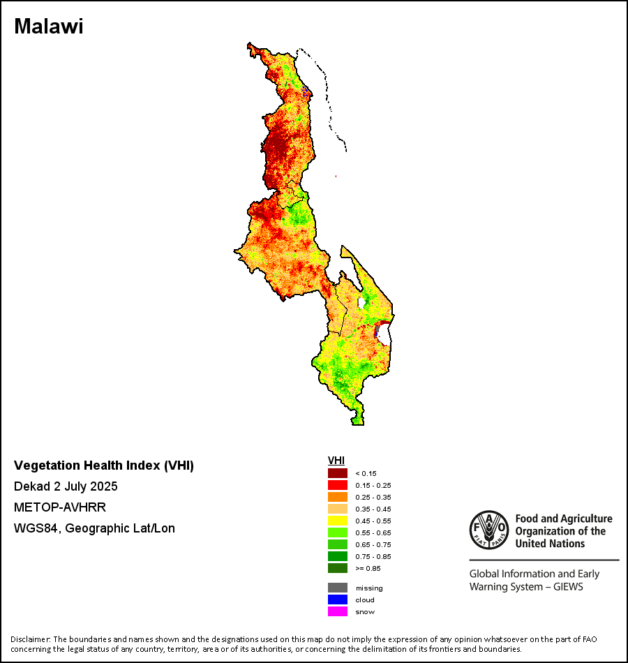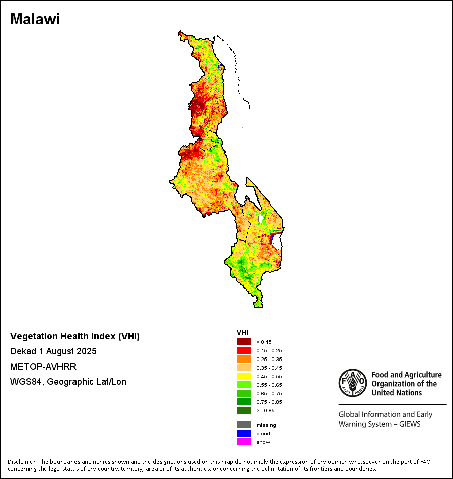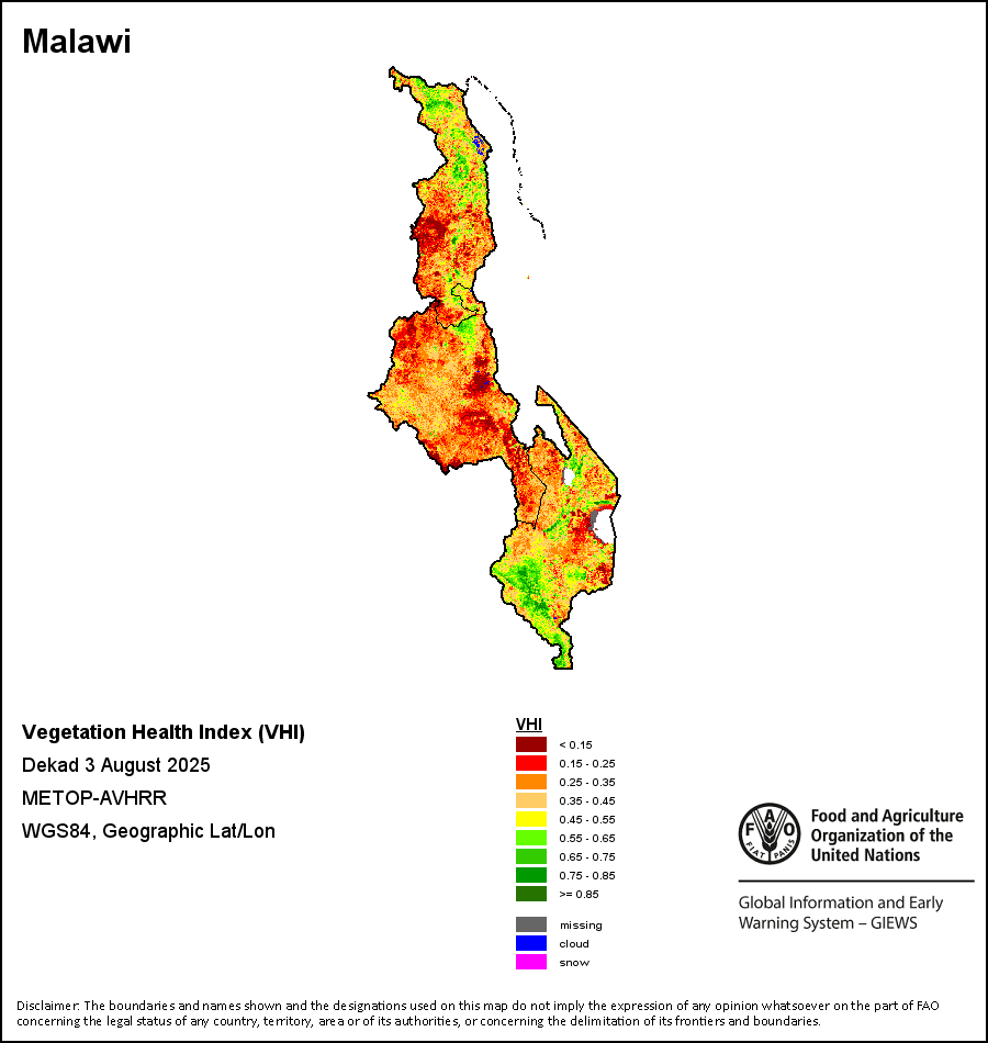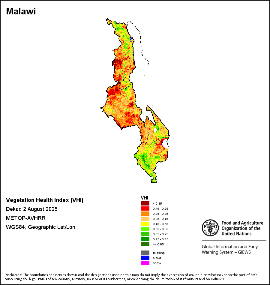 植被健康指数(VHI)根据植被健康状况以及气温对作物状况的影响情况显示干旱的严重程度。 VHI是一项综合指数,是用于计算ASI的基础性指标。它结合了植被状况指数(VCI)和气温状况指数(TCI)。TCI的计算采用了与VCI类似的方程,但它把当前气温与长期最高和最低值联系起来,因为一个假定前提是气温越高就倾向于造成植被状况恶化。比方说,VHI指数下降就意味着植被状况相对较差,而气温越高则意味着植被状况受到胁迫,较长时间延续则成为干旱的指征。VHI映像针对两个主要季节进行计算并分为三种时间模式:旬度、月度和年度。