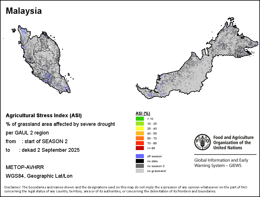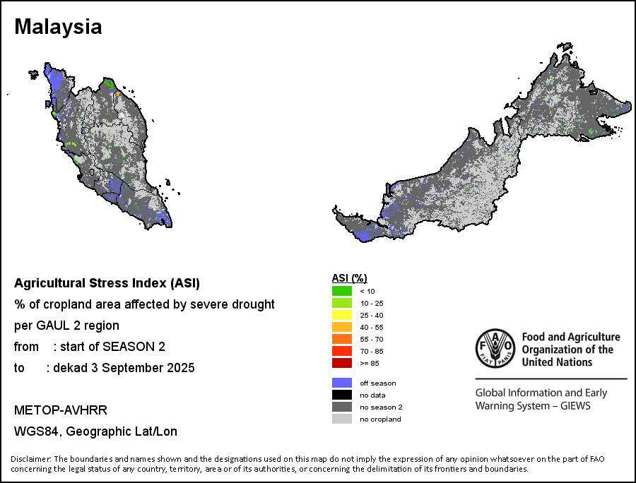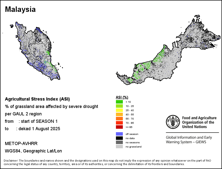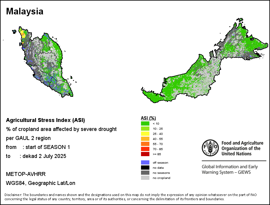 农业干旱胁迫指数(ASI)是一项速览指数,有助于在早期甄别较大可能发生水胁迫(干旱)的耕地。 该指数通过整合植被健康指数(VHI)在评估农业旱情方面具有关键意义的两个维度,即时间和空间维度,而得出。计算农业干旱胁迫指数的第一步是求植被健康指数的时间平均值,对作物周期内旱情的强度和时长进行像素级评估;这项计算包括采用作物系数衡量某种作物在各物候阶段对干旱胁迫的敏感度。第二步是确定旱情的空间广度,方法是计算植被健康指数值低于35%(Kogan前期研究将这一数值确定为评估干旱程度的临界值,1995年)的耕地的像素百分比。然后把各个行政区域根据受影响面积的百分比进行划分,便于对结果进行快速解读。