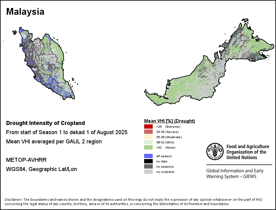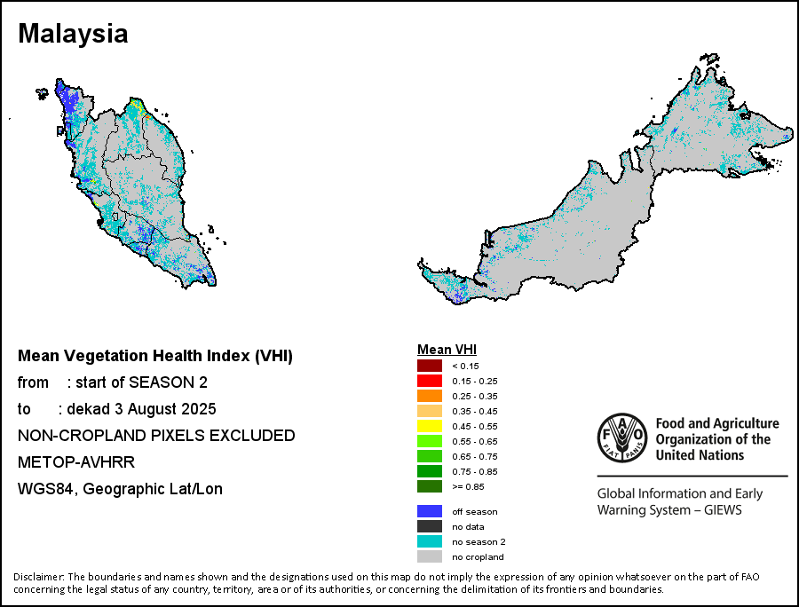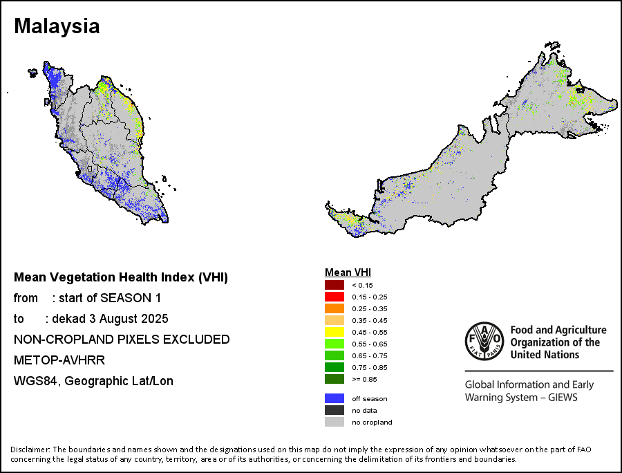 植被健康指数(VHI)根据植被健康状况以及气温对作物状况的影响情况显示干旱的严重程度。 VHI是一项综合指数,是用于计算ASI的基础性指标。它结合了植被状况指数(VCI)和气温状况指数(TCI)。TCI的计算采用了与VCI类似的方程,但它把当前气温与长期最高和最低值联系起来,因为一个假定前提是气温越高就倾向于造成植被状况恶化。比方说,VHI指数下降就意味着植被状况相对较差,而气温越高则意味着植被状况受到胁迫,较长时间延续则成为干旱的指征。VHI映像针对两个主要季节进行计算并分为三种时间模式:旬度、月度和年度。