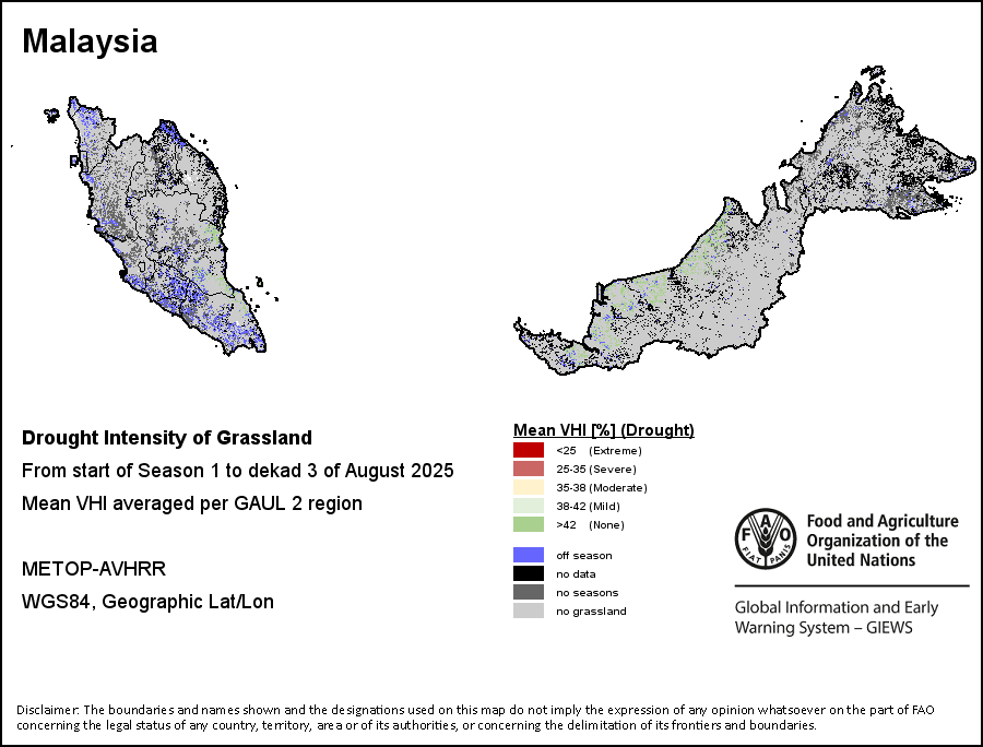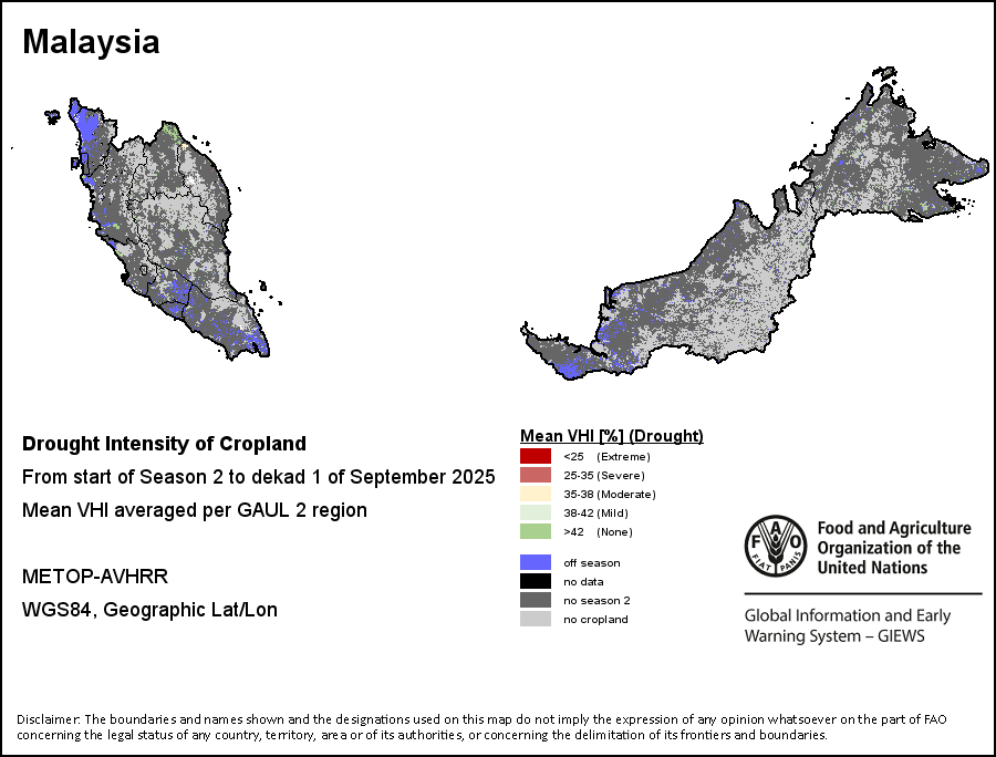 农业干旱依据其强度划分为四类:极端、严重、重度或轻度。干旱的强度通过各全球行政单位分层制度二级区域(GAUL 2)地区累积加权平均植被健康指数计算得出,意味着植被健康状况越差旱情就越严重。