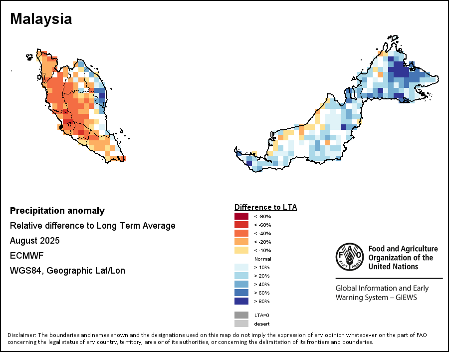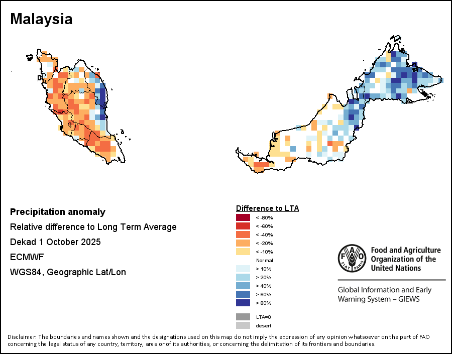 该图谱显示了当前降水量与平均水平之间的差异。 由降水量水平与长期平均值(LTA)进行比较得出,长期平均值系指1989-2015年期间的数值。暖色调指示的是降水量低于平均水平的地区,而冷色调指示的则是降水量高于平均水平的地区。降雨量估算数据来自欧洲中期天气预报这些(ECMWF)。