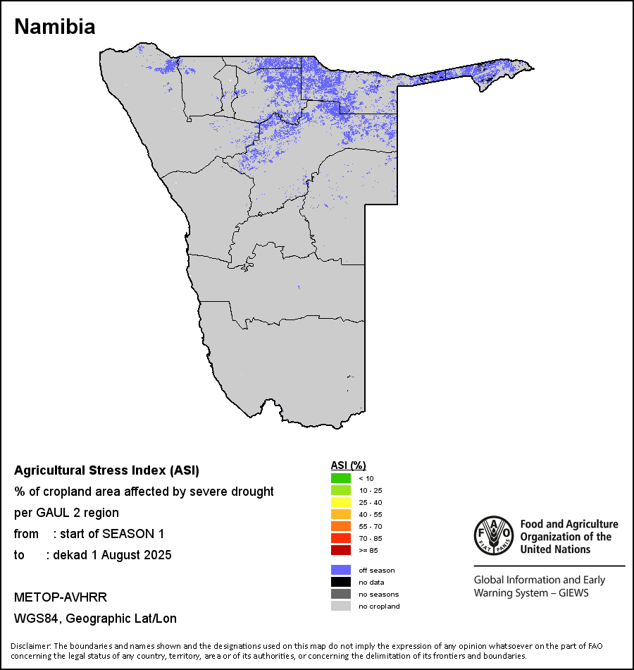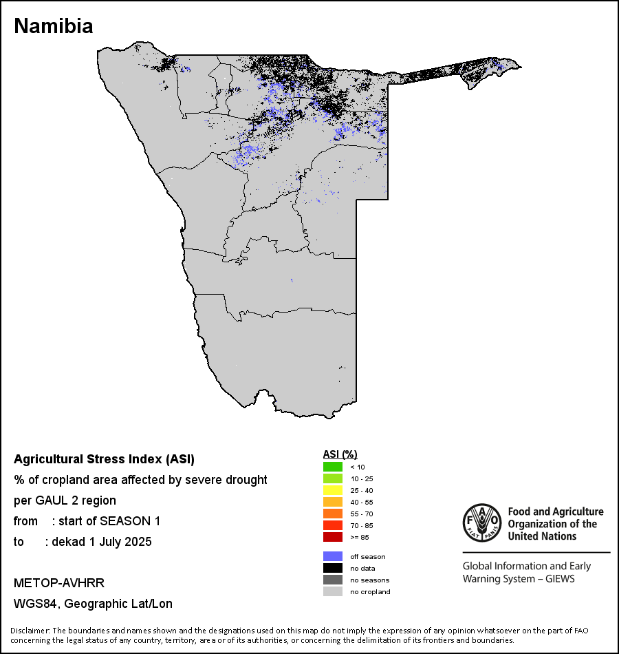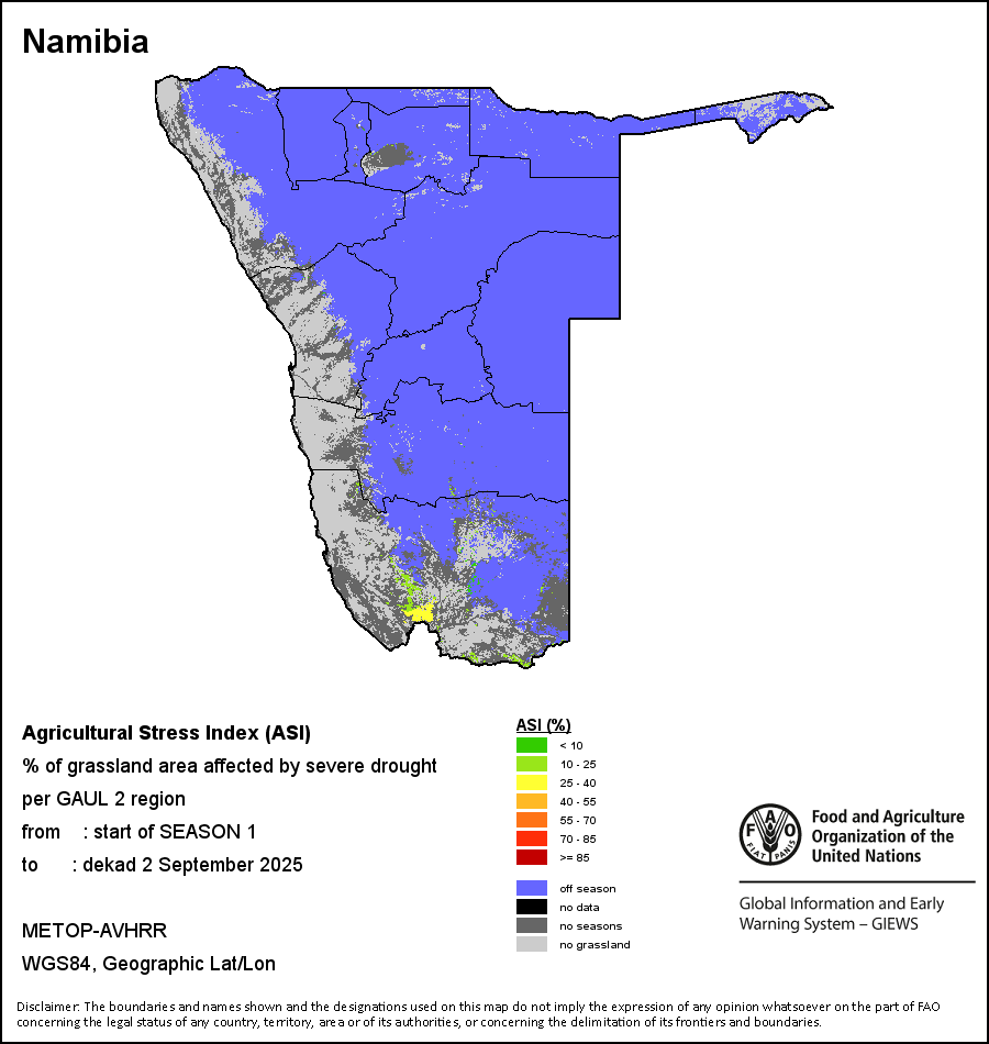 农业干旱胁迫指数(ASI)是一项速览指数,有助于在早期甄别较大可能发生水胁迫(干旱)的耕地。 该指数通过整合植被健康指数(VHI)在评估农业旱情方面具有关键意义的两个维度,即时间和空间维度,而得出。计算农业干旱胁迫指数的第一步是求植被健康指数的时间平均值,对作物周期内旱情的强度和时长进行像素级评估;这项计算包括采用作物系数衡量某种作物在各物候阶段对干旱胁迫的敏感度。第二步是确定旱情的空间广度,方法是计算植被健康指数值低于35%(Kogan前期研究将这一数值确定为评估干旱程度的临界值,1995年)的耕地的像素百分比。然后把各个行政区域根据受影响面积的百分比进行划分,便于对结果进行快速解读。