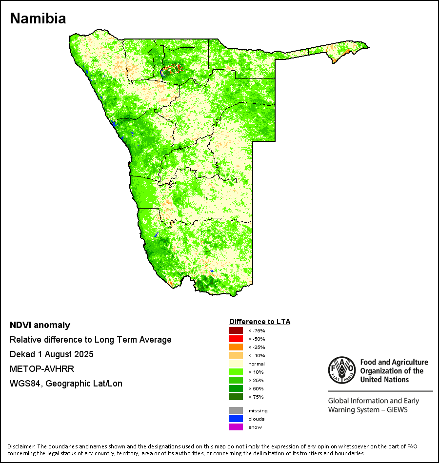 归一化差异植被指数(NDVI)衡量的是地表覆被的绿色程度,以此代表植被的密度和健康度情况。NDVI值的区间从+1至-1,正值越高代表植被的密度和健康度越高,NDVI低值和/或负值则显示植被状况不佳或稀疏。NDVI异常值显示的是当前10天与长期平均值之间的变量,正值(例如20%)就代表植被状况好于平均水平,而负值(如-40%)则代表植被状况相对较差。