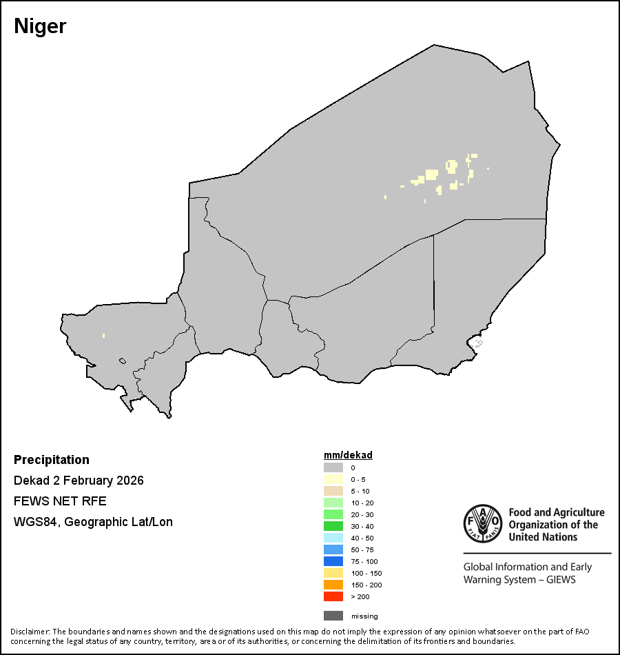 该图谱显示了每一旬(十天)的累积降水量。 所有非洲国家的降水量估算(除佛得角和毛里求斯外)均取自NOAA/FEWSNet,其他国家则取自ECMWF。