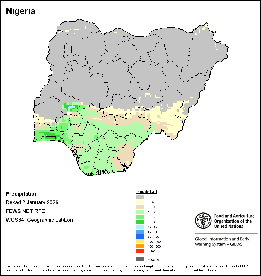 The map depicts cumulative rainfall volumes over a dekad (a 10-day period). Precipitation estimates for all African countries (except Cabo Verde and Mauritius) are taken from NOAA/FEWSNet, while for the remaining countries data is obtained from ECMWF.