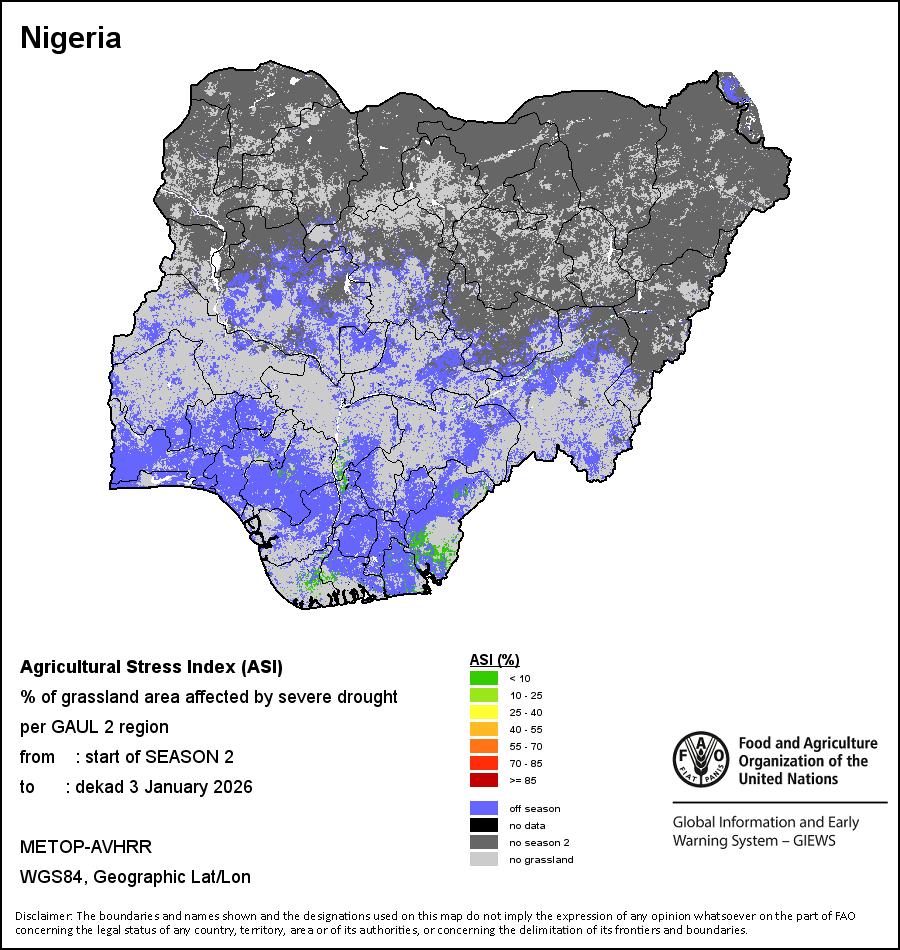 El Índice de Estrés Agrícola (ASI, por sus siglas en inglés) es un indicador que facilita la identificación temprana de tierras cultivadas con alta probabilidad de estrés hídrico (sequía) de un vistazo rápido. El Índice de Estrés Agrícola (ASI) integra el Índice de Salud de la Vegetación (VHI, por sus siglas en inglés) en dos dimensiones fundamentales para evaluar un episodio de sequía en la agricultura: la temporal y la espacial. El primer paso para calcular el ASI consiste en determinar la media temporal del VHI, evaluando la intensidad y duración de los períodos secos que se producen durante el ciclo de cultivo a nivel de píxel; este cálculo incluye la utilización de coeficientes del cultivo, que introducen la sensibilidad de éste al estrés hídrico durante cada fase fenológica. El segundo paso radica en determinar la extensión espacial de las sequías calculando el porcentaje de píxeles en zonas cultivables con un VHI por debajo del 35 por ciento (una investigación anterior -Kogan, 1995- identificó este valor como umbral crítico para evaluar el alcance de una sequía). Cada zona administrativa se clasifica en función del porcentaje de superficie afectada por la sequía para facilitar una interpretación rápida de los resultados.