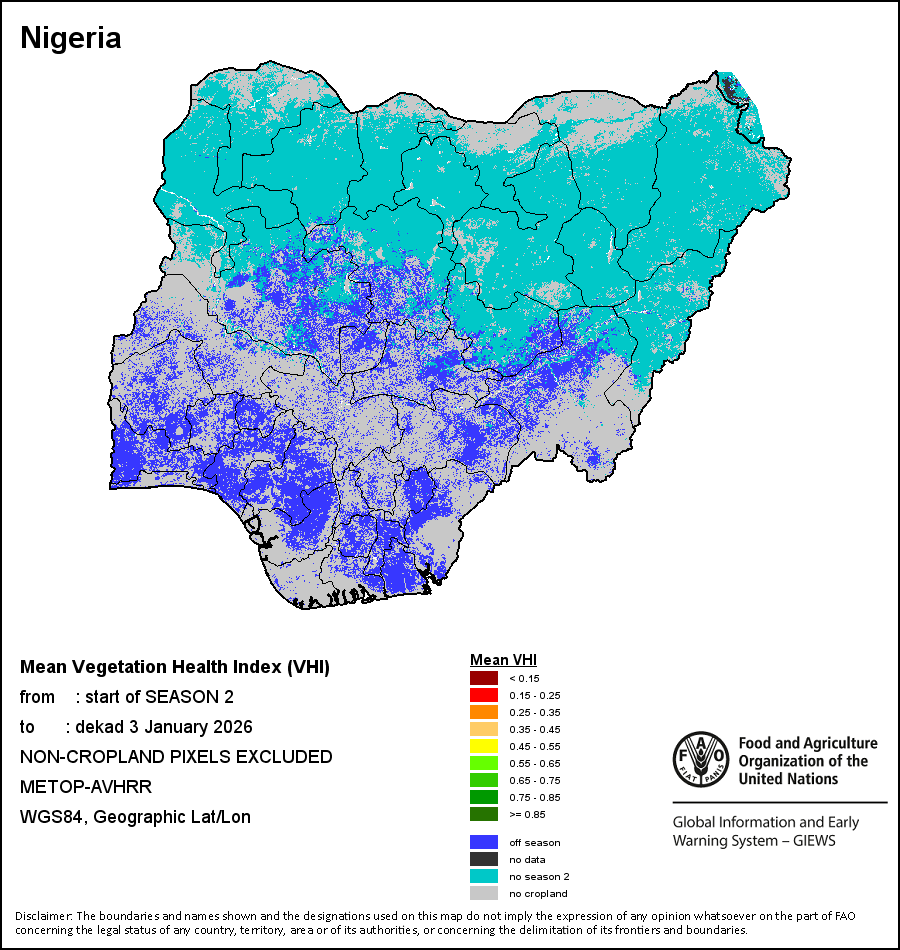 El Índice de Salud de la Vegetación Medio ponderada (VHI medio ponderada) permite al usuario evaluar la gravedad de la sequía desde el inicio del período vegetativo, analizar la salud de la vegetación y estudiar la influencia de la temperatura en las condiciones de las plantas. El VHI medio ponderada es el promedio de los valores del VHI registrados cada diez días durante todo el periodo vegetativo del cultivo (desde el inicio hasta el último período de 10 días analizado), ponderado por los coeficientes de cultivo (Kc), asignados a los valores del VHI en los registros correspondientes al inicio de la temporada (SOS), al máximo de la temporada (MOS) y al final de la temporada (EOS). El coeficiente de cultivo se aplica con el fin de reflejar la sensibilidad al agua del cultivo en las diferentes etapas fenológicas.