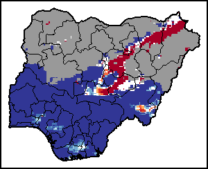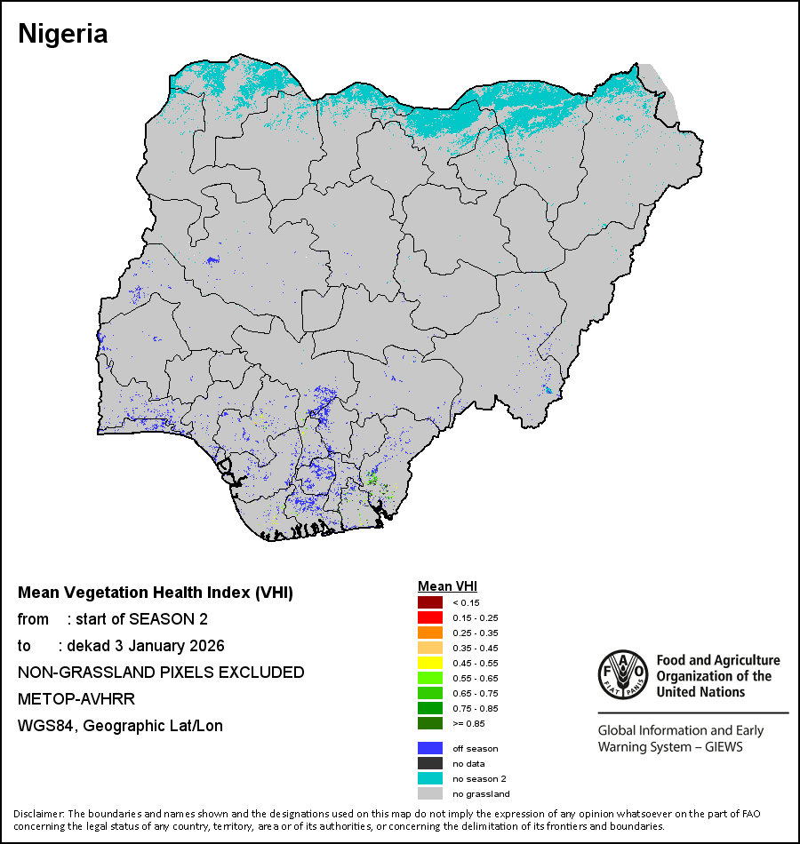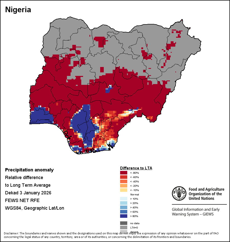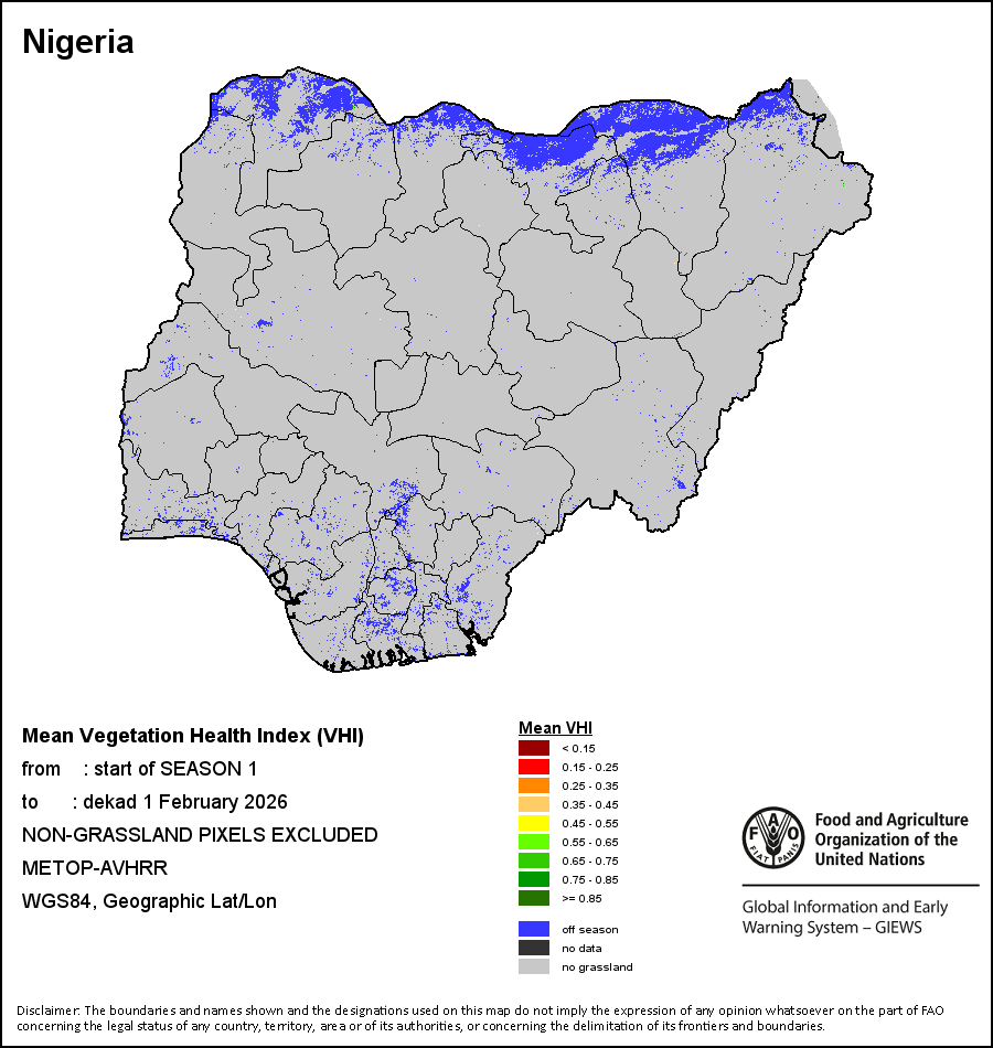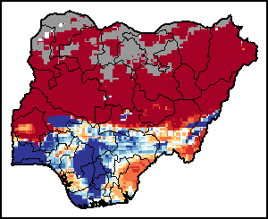El Índice Normalizado Diferencial de la Vegetación (NDVI, por sus siglas en inglés) mide el “verdor” de la cubierta vegetal, y se utiliza como indicador de la densidad y salud de la vegetación. Los valores del NDVI oscilan entre +1 y -1. Los valores positivos elevados corresponden a vegetación densa y saludable, mientras que los valores bajos y/o negativos reflejan condiciones deficientes de vegetación o cubierta vegetal escasa. La anomalía del NDVI representa la variación del periodo actual de 10 días con respecto al valor medio a largo plazo. Un valor positivo (por ejemplo, 20 por ciento) implicaría mejores condiciones de vegetación con respecto a la media, mientras que un valor negativo (por ejemplo, -40 por ciento) indicaría condiciones de vegetación comparativamente peores.