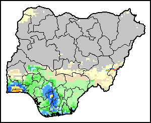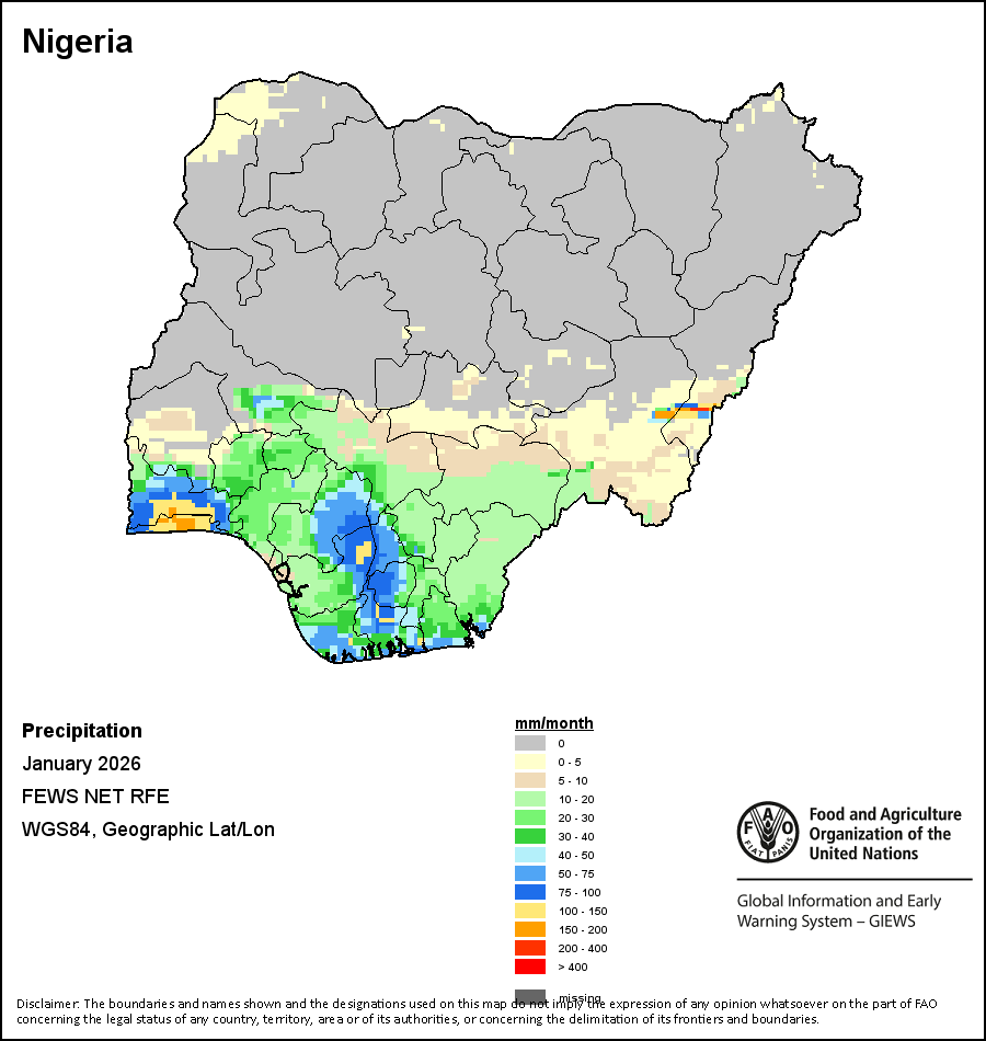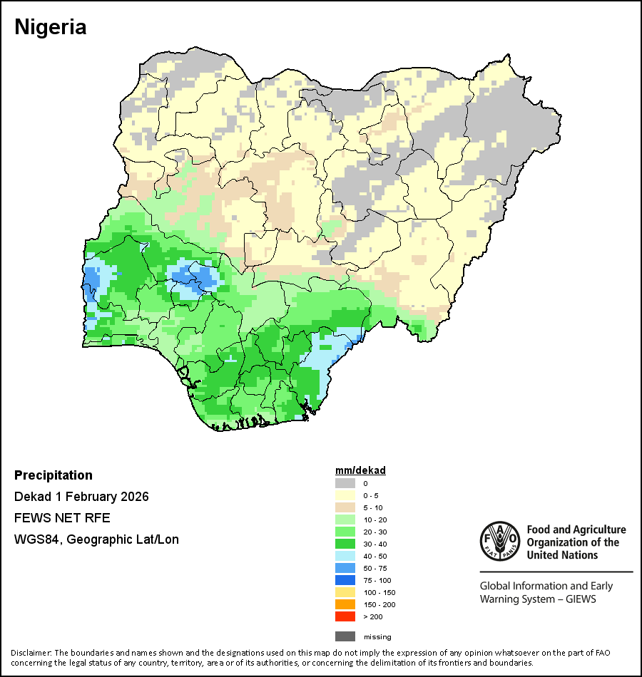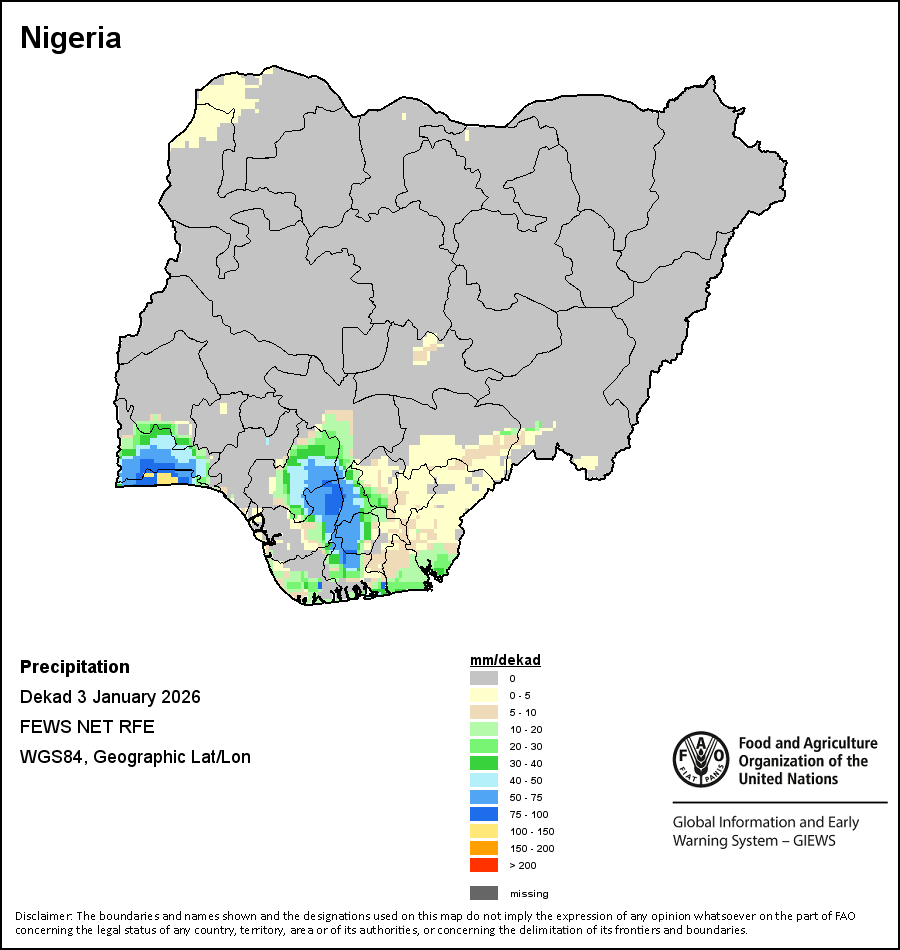 El mapa muestra el volumen de precipitaciones acumuladas durante un periodo de 10 días.>/b> Las estimaciones de precipitación de todos los países africanos (excepto Cabo Verde y Mauricio) se obtienen de NOAA/FEWSNet, mientras que para los restantes países los datos se obtienen Centro Europeo de Predicción Meteorológica a Plazo Medio, ECMWF siglas en Inglés).