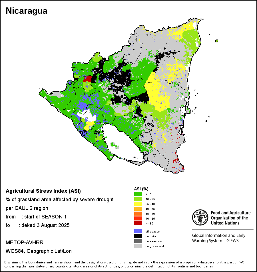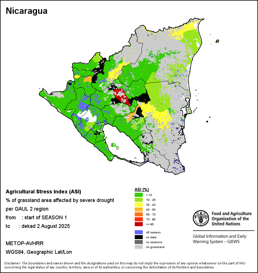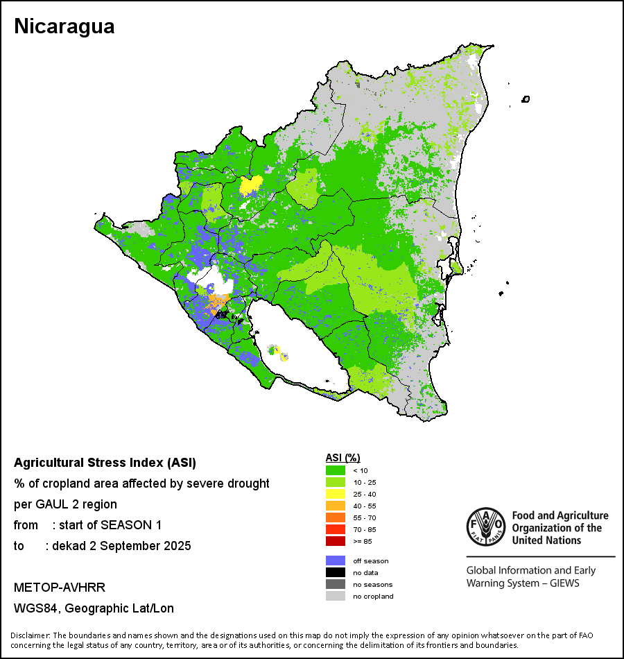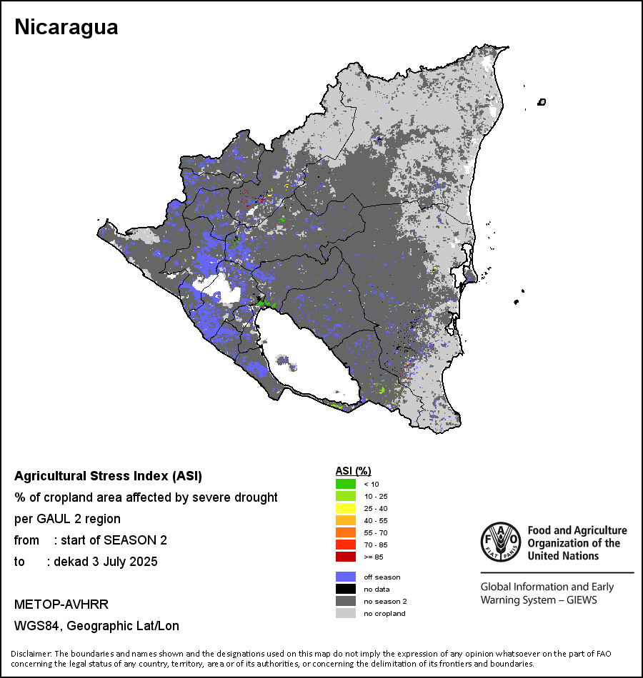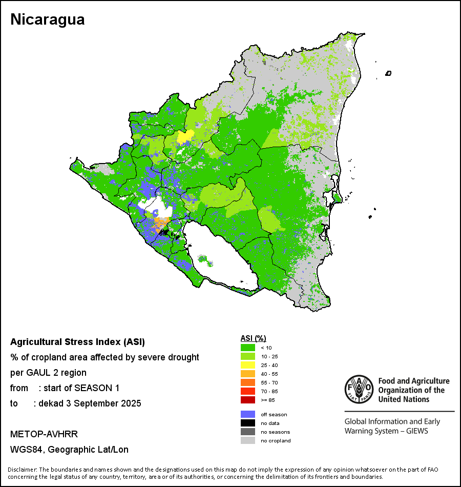 The Agricultural Stress Index (ASI) is a quick-look indicator that facilitates the early identification of cropped land with a high likelihood of water stress (drought). The Index is based on the integration of the Vegetation Health Index (VHI) in two dimensions that are critical in the assessment of a drought event in agriculture: temporal and spatial. The first step of the ASI calculation is a temporal averaging of the VHI, assessing the intensity and duration of dry periods occurring during the crop cycle at the pixel level; this calculation includes the use of crop coefficients, which introduces sensitivity of a crop to water stress during each phenological phase. The second step determines the spatial extent of drought events by calculating the percentage of pixels in arable areas with a VHI value below 35 percent (this value was identified as a critical threshold in assessing the extent of drought in previous research by Kogan, 1995). Each administrative area is classified according to the percentage of the affected area to facilitate the quick interpretation of results.