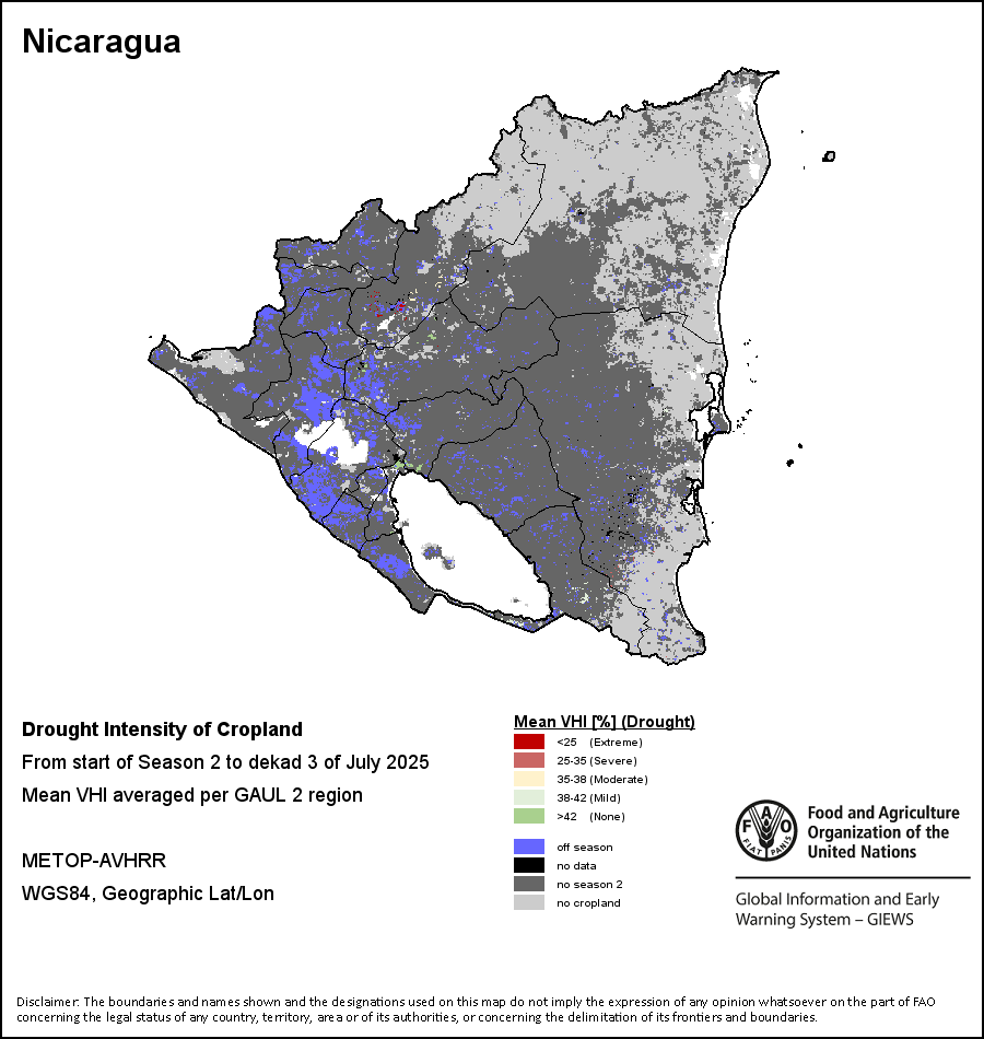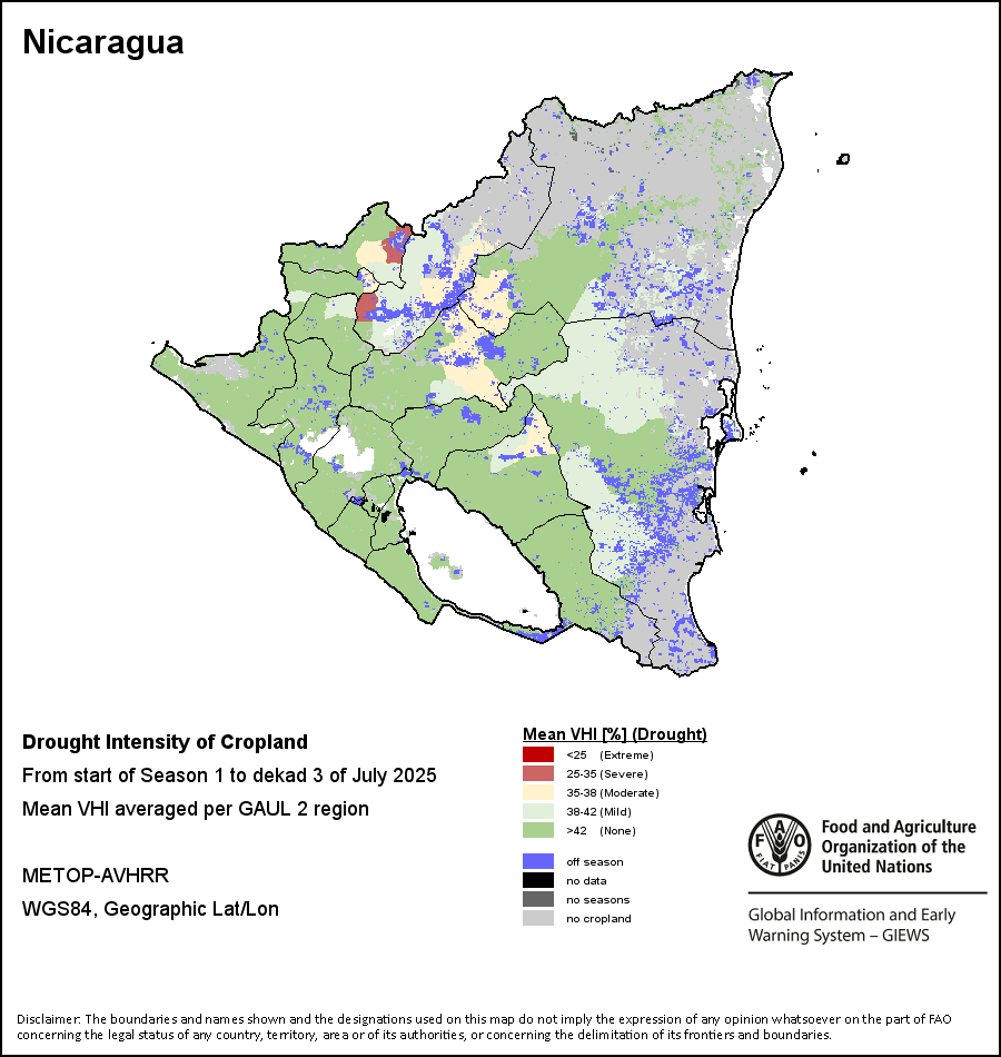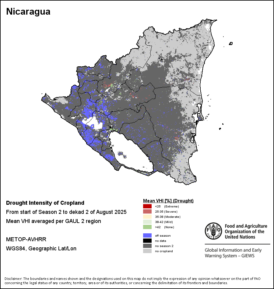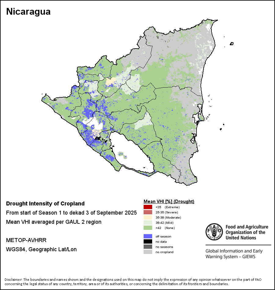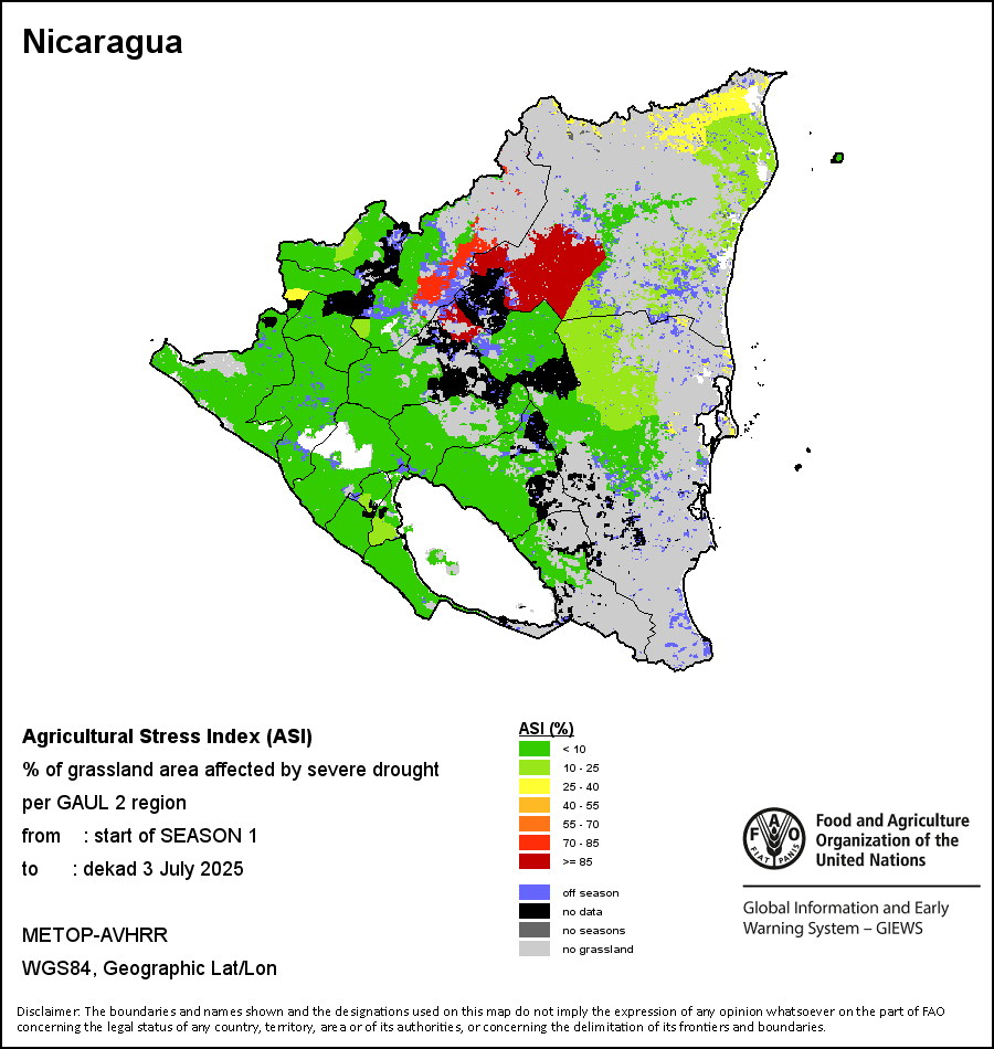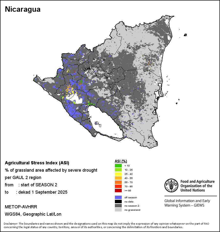 The Agricultural Stress Index (ASI) is a quick-look indicator that facilitates the early identification of cropped land with a high likelihood of water stress (drought). The Index is based on the integration of the Vegetation Health Index (VHI) in two dimensions that are critical in the assessment of a drought event in agriculture: temporal and spatial. The first step of the ASI calculation is a temporal averaging of the VHI, assessing the intensity and duration of dry periods occurring during the crop cycle at the pixel level; this calculation includes the use of crop coefficients, which introduces sensitivity of a crop to water stress during each phenological phase. The second step determines the spatial extent of drought events by calculating the percentage of pixels in arable areas with a VHI value below 35 percent (this value was identified as a critical threshold in assessing the extent of drought in previous research by Kogan, 1995). Each administrative area is classified according to the percentage of the affected area to facilitate the quick interpretation of results.
