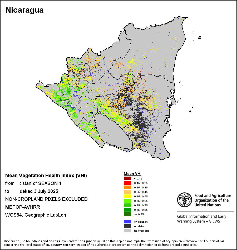 The country level maps and graphs depict the latest 36-month period of the seasonal, vegetation and precipitation indicators. The data is presented by dekad and month.   More