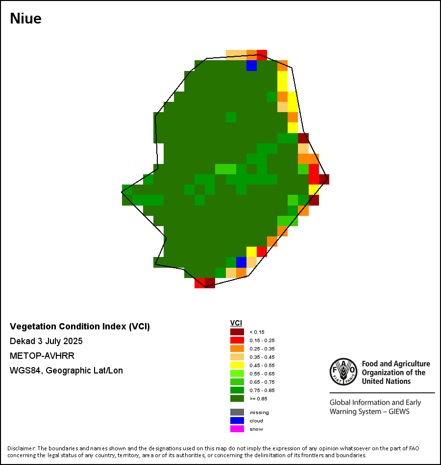 植被状况指数(VCI)评价的是与历史趋势相比当前的植被健康状况。 VCI指数考查的是当前一旬归一化差异植被指数(NDVI)与其长期最小值和最大值之间的关系,使用同一旬的历史NDVI值范围进行归一化计算。VCI的目的是把NDVI中与天气相关的成分从生态要素中分离出来。