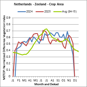 End of Season (EOS) indicates when crop/grass has reached physiological maturity, defined as the date when the descending NDVI-curve crosses NDVIe, This date does not necessarily correspond to the harvest period.