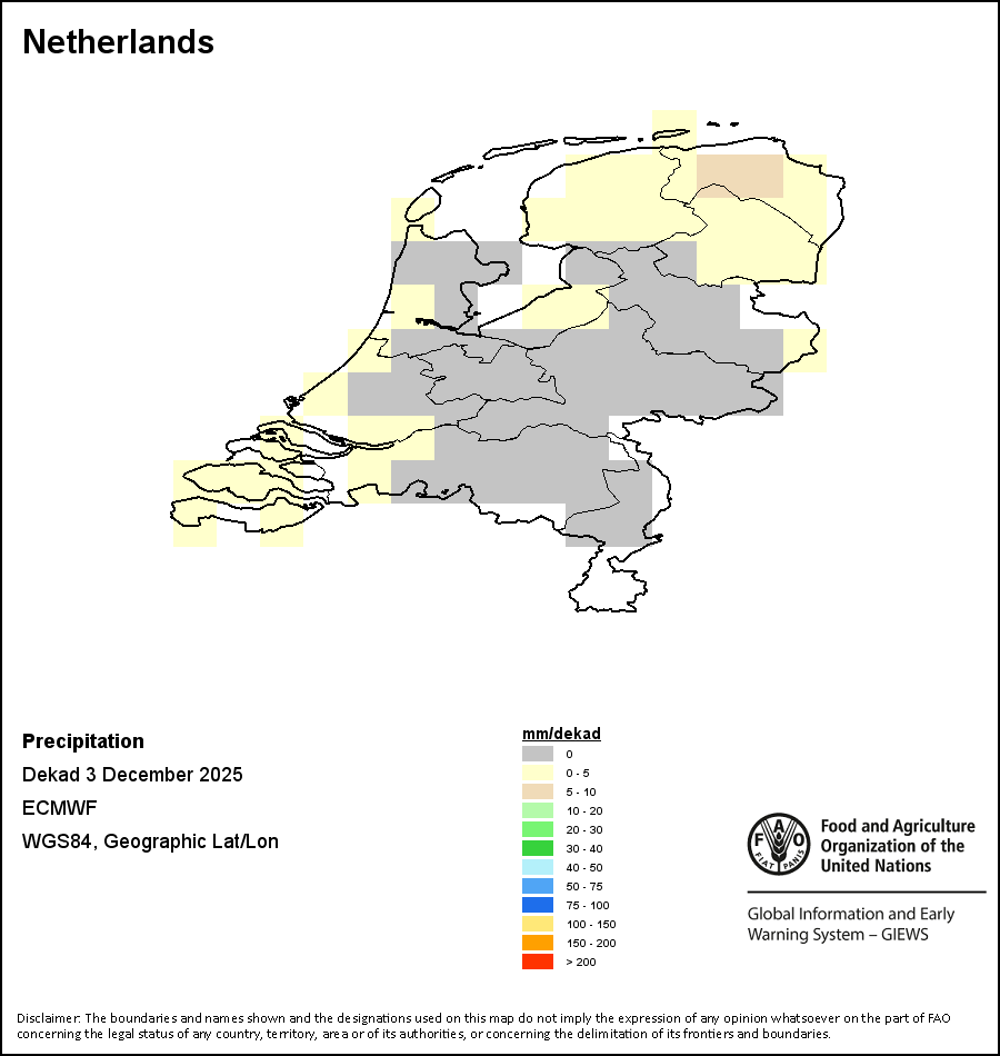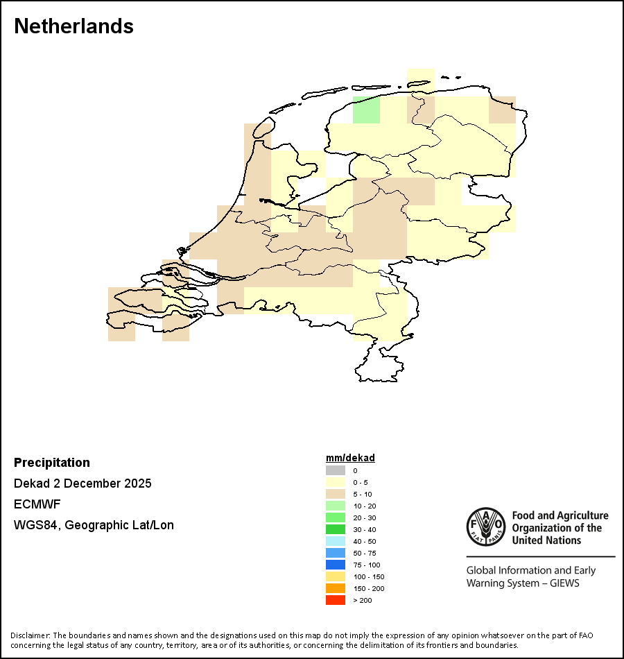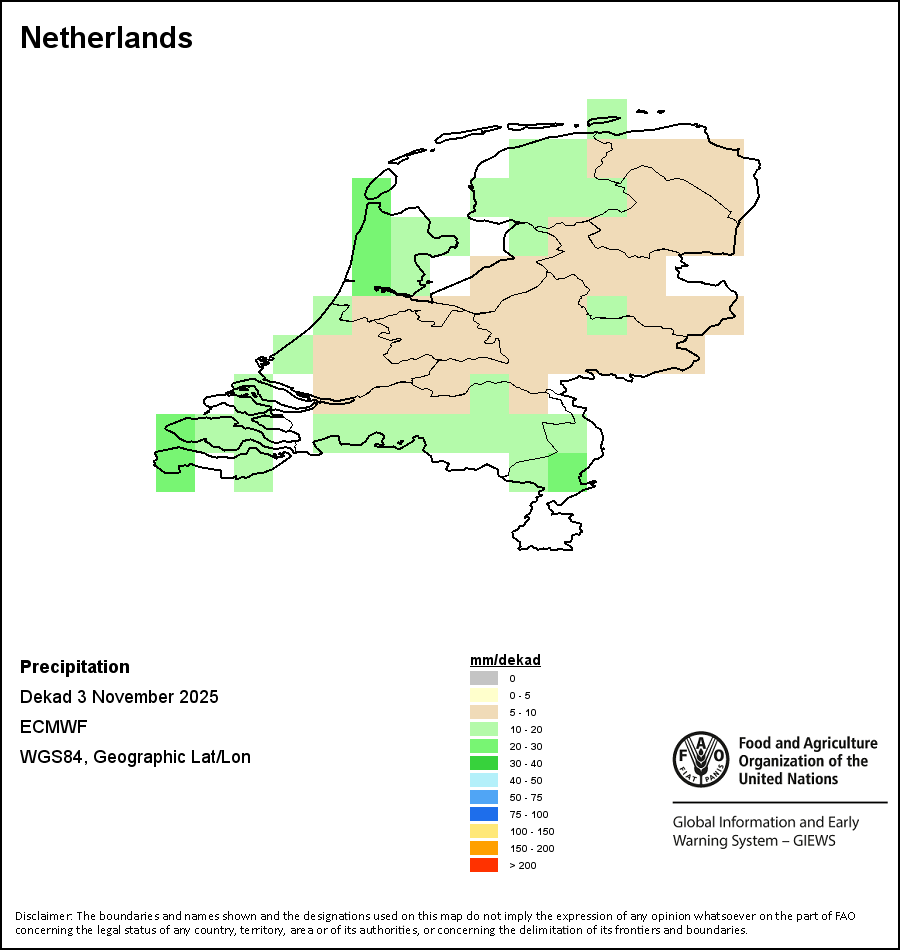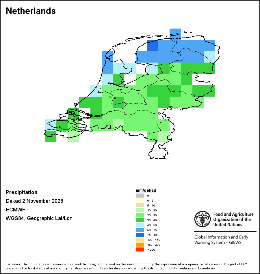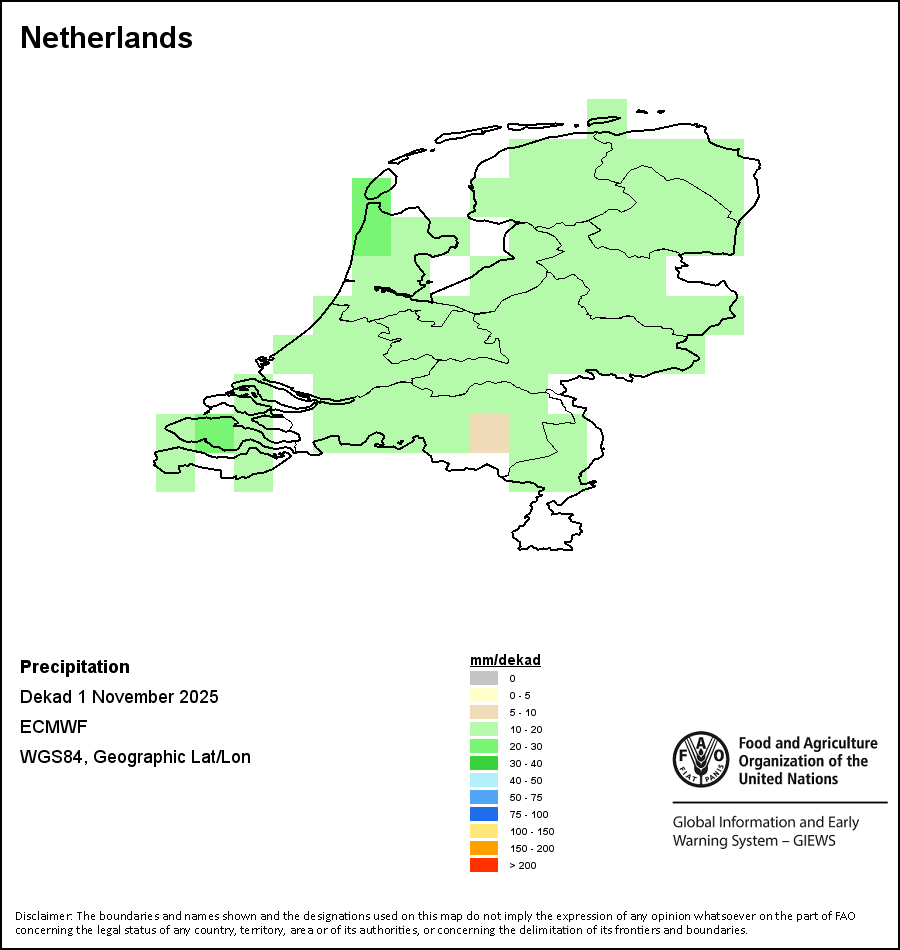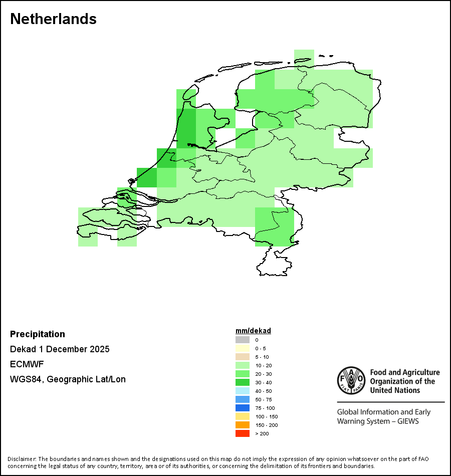 The map depicts cumulative rainfall volumes over a dekad (a 10-day period). Precipitation estimates for all African countries (except Cabo Verde and Mauritius) are taken from NOAA/FEWSNet, while for the remaining countries data is obtained from ECMWF.