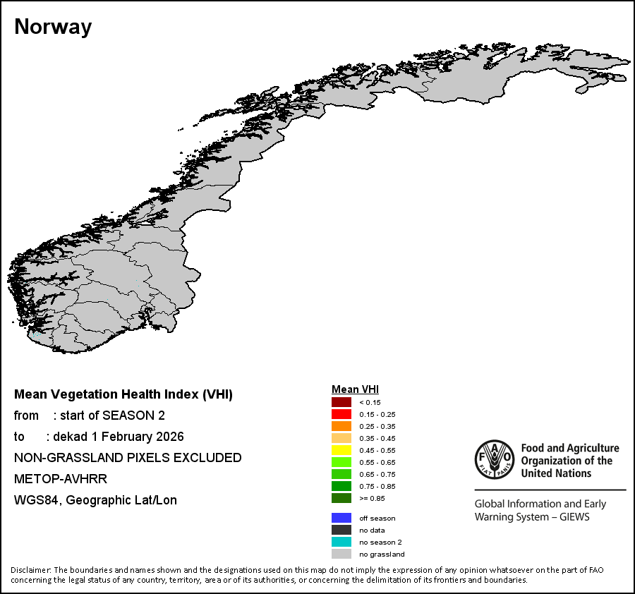 The country level maps and graphs depict the latest 36-month period of the seasonal, vegetation and precipitation indicators. The data is presented by dekad and month. All three vegetation indicators are based on 10-day (dekadal) vegetation data from the METOP-AVHRR sensor at 1 km resolution (2007 and after). Data at 1 km resolution for the period 1984-2006 are derived from the NOAA-AVHRR dataset at 16 km resolution. Precipitation estimates for all African countries (except Cabo Verde and Mauritius) are taken from NOAA/FEWSNet (16 km resolution), while for the remaining countries data is obtained from ECMWF (25 km resolution). Owing to the higher resolution of vegetation indicators (e.g., NDVI, VHI) compared to coarser precipitation indicators, the number of sub-national units for which valid zonal statistics can be generated for vegetation indices is greater than the number of units for precipitation indicators for certain countries.