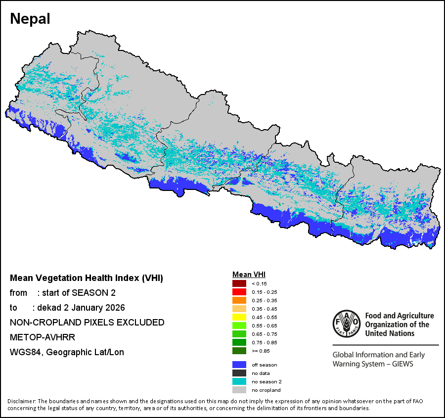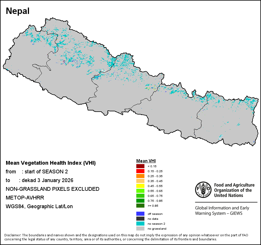 The Normalized Difference Vegetation Index (NDVI) measures the “greenness” of ground cover and is used as a proxy to indicate the density and health of vegetation. NDVI values range from +1 to -1, with high positive values corresponding to dense and healthy vegetation, and low and/or negative NDVI values indicating poor vegetation conditions or sparse vegetative cover. The NDVI anomaly indicates the variation of the current dekad to the long-term average, where a positive value (for example 20 percent) would signify enhanced vegetation conditions compared to the average, while a negative value (for instance -40 percent) would indicate comparatively poor vegetation conditions.