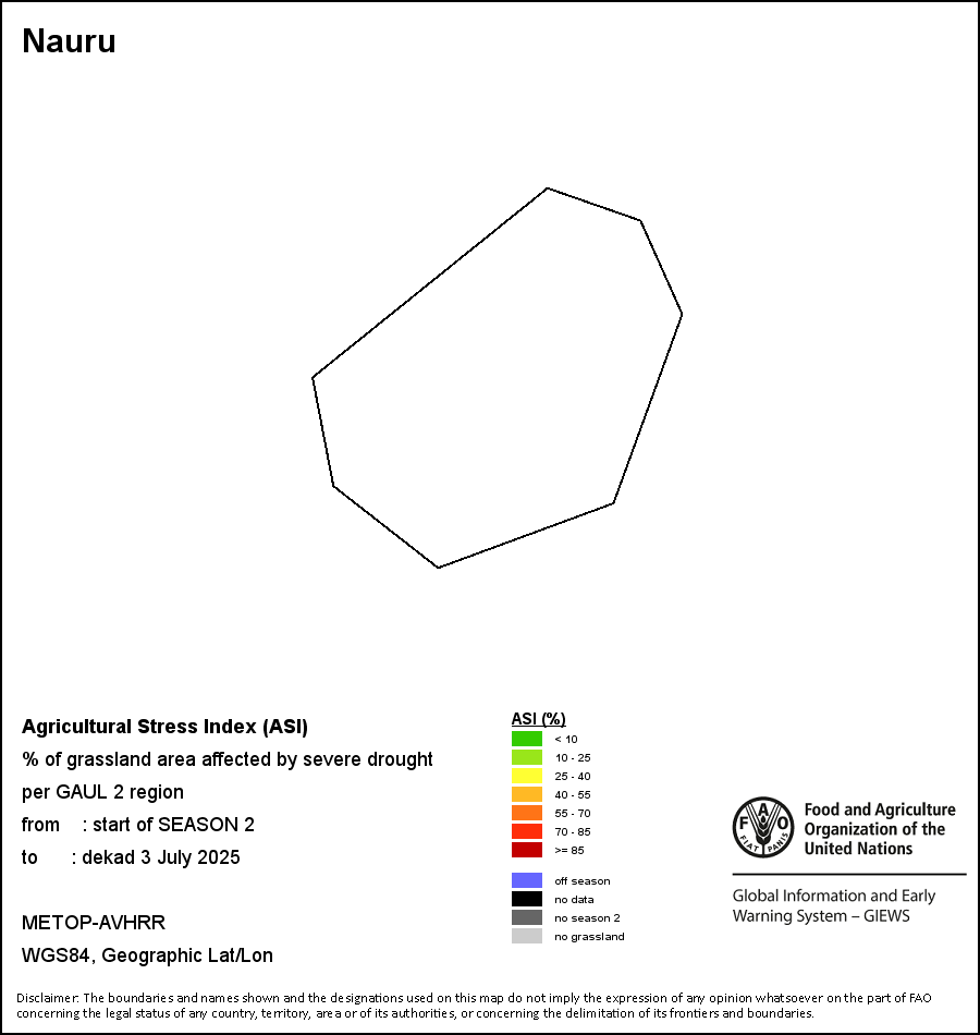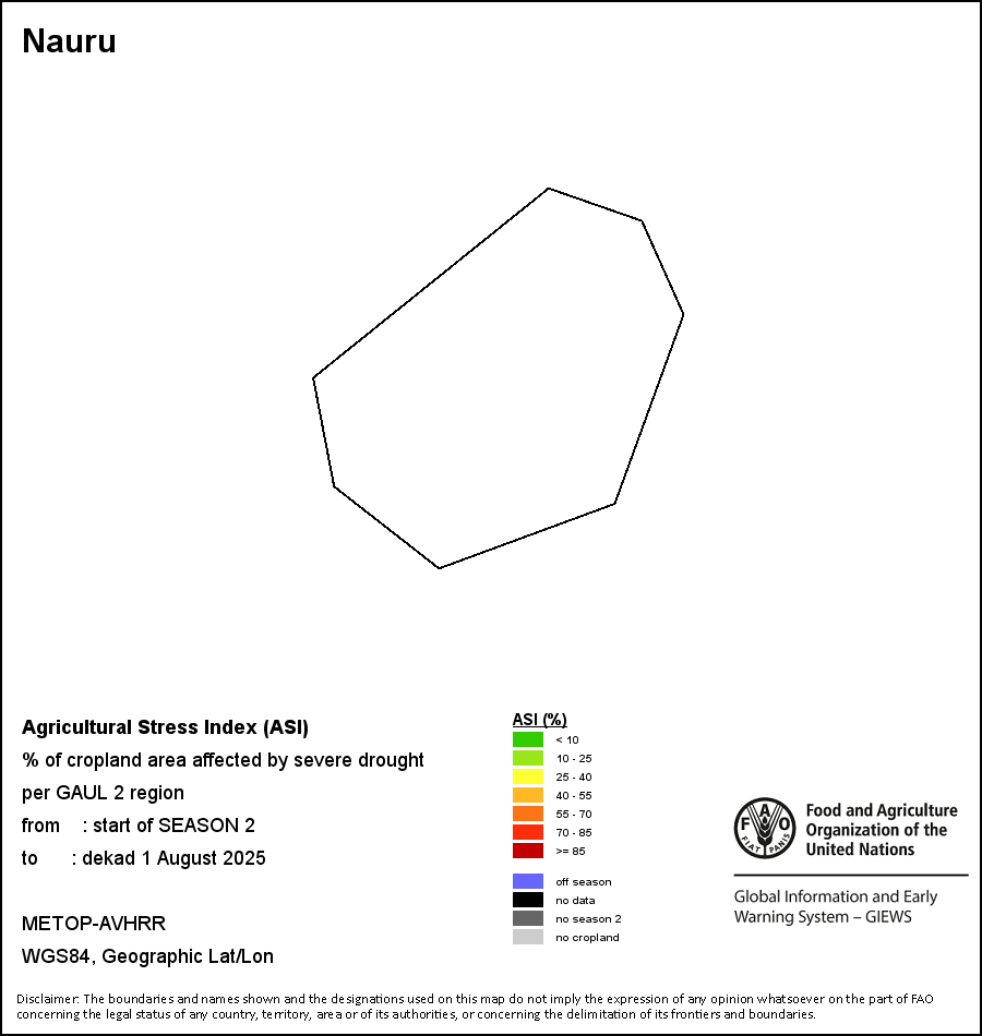 The Agricultural Stress Index (ASI) is a quick-look indicator that facilitates the early identification of cropped land with a high likelihood of water stress (drought). The Index is based on the integration of the Vegetation Health Index (VHI) in two dimensions that are critical in the assessment of a drought event in agriculture: temporal and spatial. The first step of the ASI calculation is a temporal averaging of the VHI, assessing the intensity and duration of dry periods occurring during the crop cycle at the pixel level; this calculation includes the use of crop coefficients, which introduces sensitivity of a crop to water stress during each phenological phase. The second step determines the spatial extent of drought events by calculating the percentage of pixels in arable areas with a VHI value below 35 percent (this value was identified as a critical threshold in assessing the extent of drought in previous research by Kogan, 1995). Each administrative area is classified according to the percentage of the affected area to facilitate the quick interpretation of results.