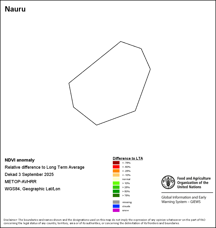 The Normalized Difference Vegetation Index (NDVI) measures the “greenness” of ground cover and is used as a proxy to indicate the density and health of vegetation. NDVI values range from +1 to -1, with high positive values corresponding to dense and healthy vegetation, and low and/or negative NDVI values indicating poor vegetation conditions or sparse vegetative cover. The NDVI anomaly indicates the variation of the current dekad to the long-term average, where a positive value (for example 20 percent) would signify enhanced vegetation conditions compared to the average, while a negative value (for instance -40 percent) would indicate comparatively poor vegetation conditions.
