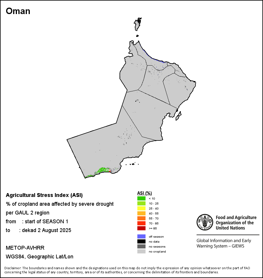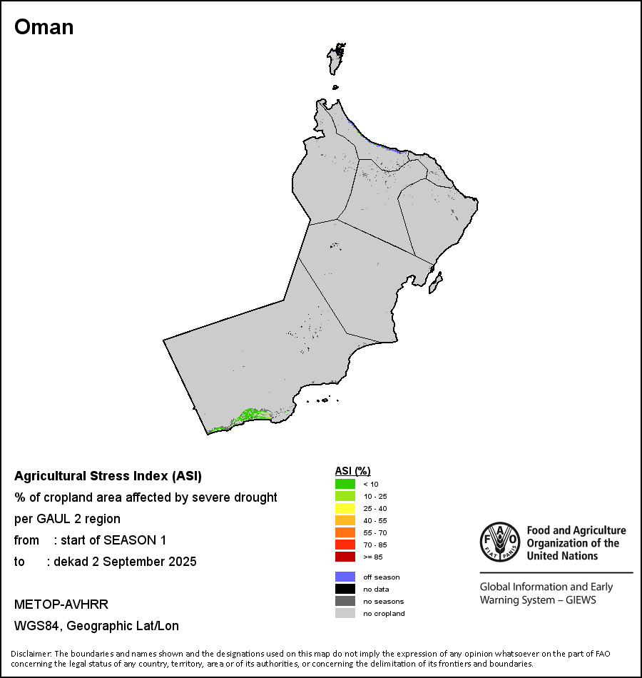 农业干旱胁迫指数(ASI)是一项速览指数,有助于在早期甄别较大可能发生水胁迫(干旱)的耕地。 该指数通过整合植被健康指数(VHI)在评估农业旱情方面具有关键意义的两个维度,即时间和空间维度,而得出。计算农业干旱胁迫指数的第一步是求植被健康指数的时间平均值,对作物周期内旱情的强度和时长进行像素级评估;这项计算包括采用作物系数衡量某种作物在各物候阶段对干旱胁迫的敏感度。第二步是确定旱情的空间广度,方法是计算植被健康指数值低于35%(Kogan前期研究将这一数值确定为评估干旱程度的临界值,1995年)的耕地的像素百分比。然后把各个行政区域根据受影响面积的百分比进行划分,便于对结果进行快速解读。