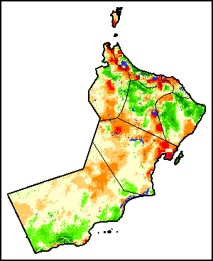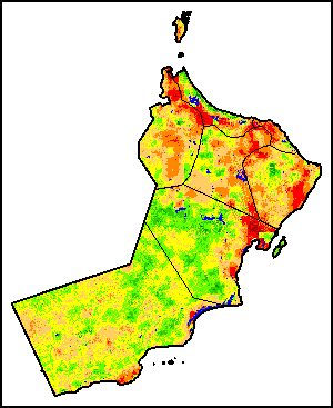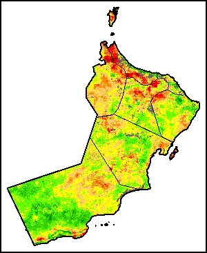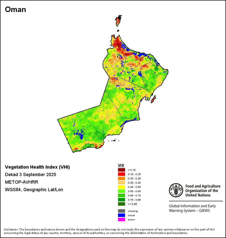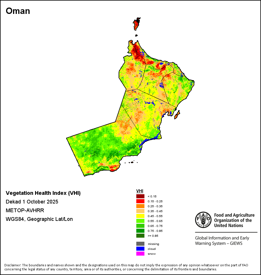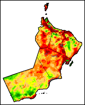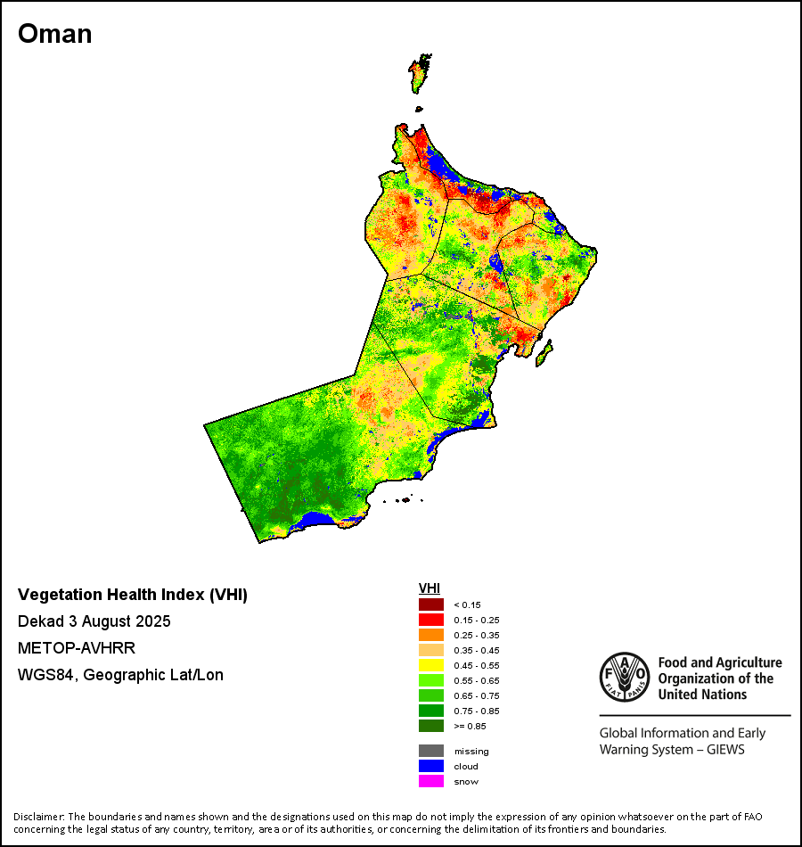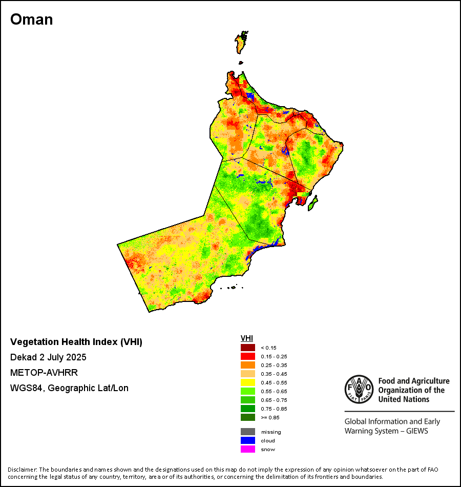 植被健康指数(VHI)根据植被健康状况以及气温对作物状况的影响情况显示干旱的严重程度。 VHI是一项综合指数,是用于计算ASI的基础性指标。它结合了植被状况指数(VCI)和气温状况指数(TCI)。TCI的计算采用了与VCI类似的方程,但它把当前气温与长期最高和最低值联系起来,因为一个假定前提是气温越高就倾向于造成植被状况恶化。比方说,VHI指数下降就意味着植被状况相对较差,而气温越高则意味着植被状况受到胁迫,较长时间延续则成为干旱的指征。VHI映像针对两个主要季节进行计算并分为三种时间模式:旬度、月度和年度。