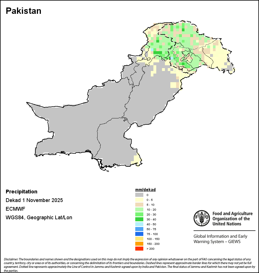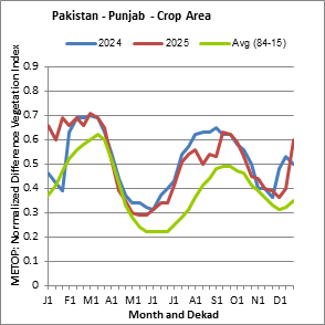 The Normalized Difference Vegetation Index (NDVI) measures the “greenness” of ground cover and is used as a proxy to indicate the density and health of vegetation. NDVI values range from +1 to -1, with high positive values corresponding to dense and healthy vegetation, and low and/or negative NDVI values indicating poor vegetation conditions or sparse vegetative cover. The NDVI anomaly indicates the variation of the current dekad to the long-term average, where a positive value (for example 20 percent) would signify enhanced vegetation conditions compared to the average, while a negative value (for instance -40 percent) would indicate comparatively poor vegetation conditions.