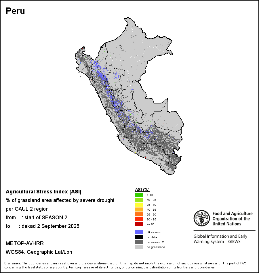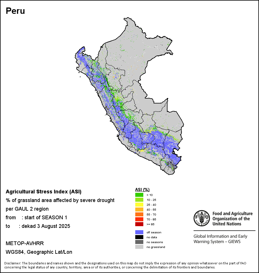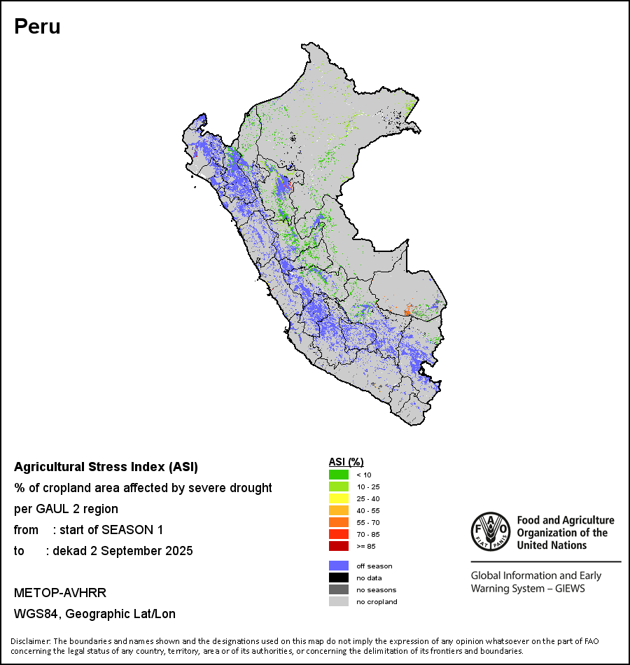 农业干旱胁迫指数(ASI)是一项速览指数,有助于在早期甄别较大可能发生水胁迫(干旱)的耕地。 该指数通过整合植被健康指数(VHI)在评估农业旱情方面具有关键意义的两个维度,即时间和空间维度,而得出。计算农业干旱胁迫指数的第一步是求植被健康指数的时间平均值,对作物周期内旱情的强度和时长进行像素级评估;这项计算包括采用作物系数衡量某种作物在各物候阶段对干旱胁迫的敏感度。第二步是确定旱情的空间广度,方法是计算植被健康指数值低于35%(Kogan前期研究将这一数值确定为评估干旱程度的临界值,1995年)的耕地的像素百分比。然后把各个行政区域根据受影响面积的百分比进行划分,便于对结果进行快速解读。