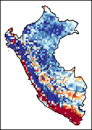 该图谱显示了当前降水量与平均水平之间的差异。 由降水量水平与长期平均值(LTA)进行比较得出,长期平均值系指1989-2015年期间的数值。暖色调指示的是降水量低于平均水平的地区,而冷色调指示的则是降水量高于平均水平的地区。降雨量估算数据来自欧洲中期天气预报这些(ECMWF)。