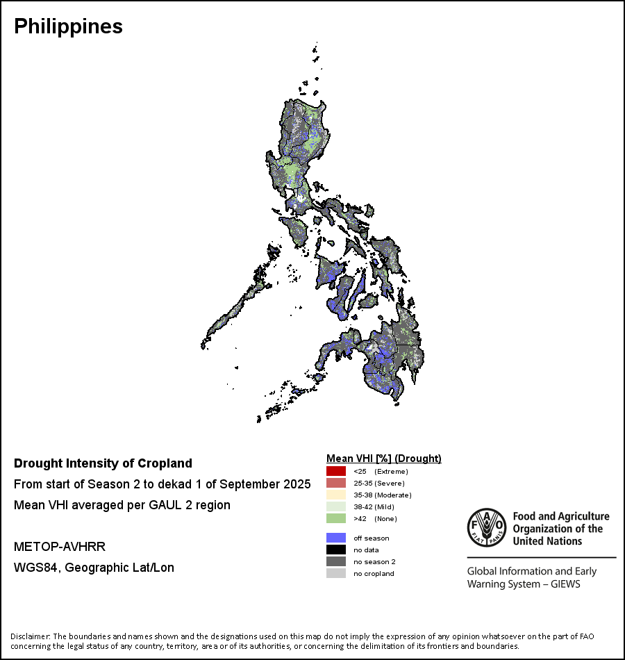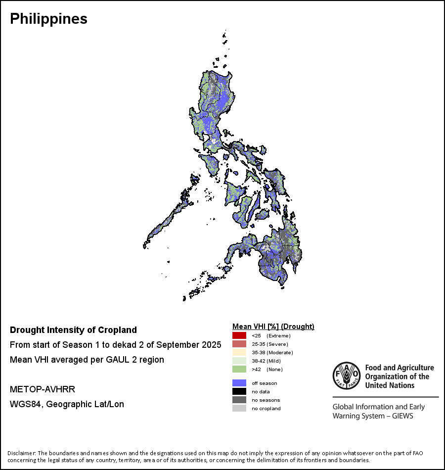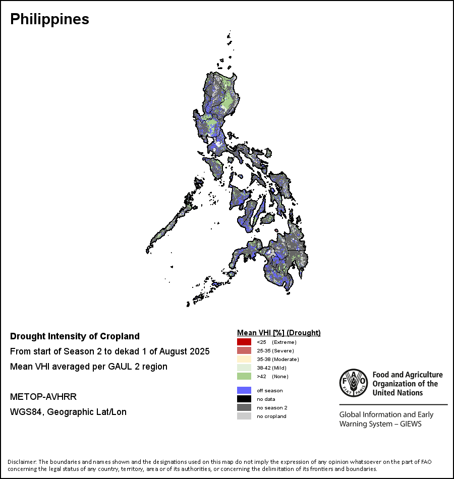 Agricultural droughts are classified by their intensity and are categorized into four classes: Extreme, Severe, Moderate or Mild. The intensity of the drought is calculated through the Weighted Mean Vegetation Health Index aggregated per GAUL 2 region, indicating that the poorer the vegetation health the more severe the drought.