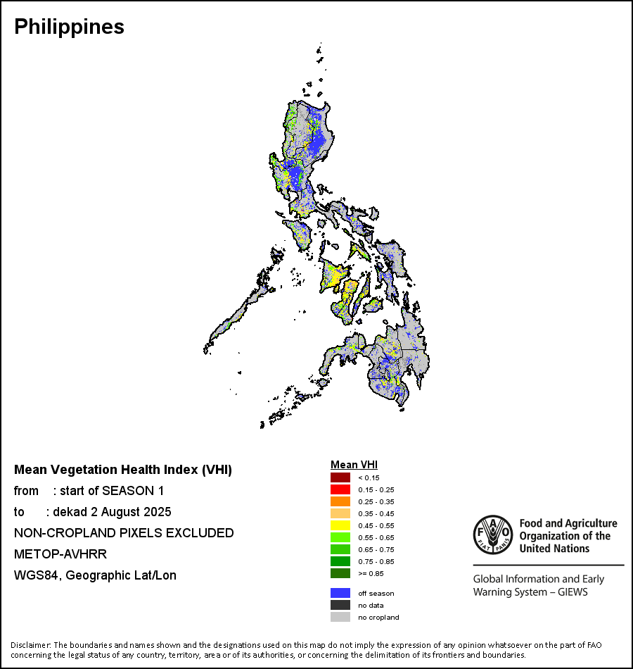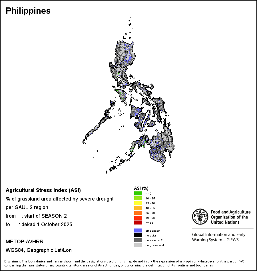 The Agricultural Stress Index (ASI) is a quick-look indicator that facilitates the early identification of cropped land with a high likelihood of water stress (drought). The Index is based on the integration of the Vegetation Health Index (VHI) in two dimensions that are critical in the assessment of a drought event in agriculture: temporal and spatial. The first step of the ASI calculation is a temporal averaging of the VHI, assessing the intensity and duration of dry periods occurring during the crop cycle at the pixel level; this calculation includes the use of crop coefficients, which introduces sensitivity of a crop to water stress during each phenological phase. The second step determines the spatial extent of drought events by calculating the percentage of pixels in arable areas with a VHI value below 35 percent (this value was identified as a critical threshold in assessing the extent of drought in previous research by Kogan, 1995). Each administrative area is classified according to the percentage of the affected area to facilitate the quick interpretation of results.