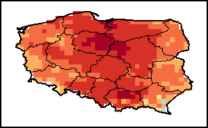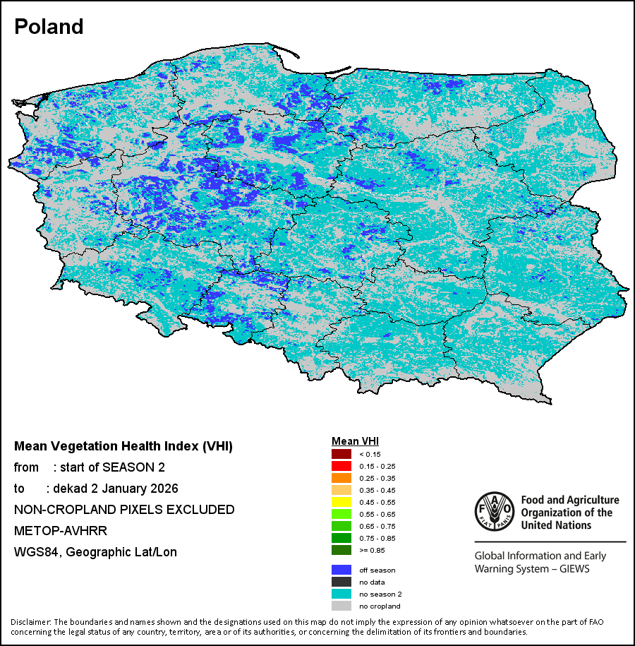植被健康指数(VHI)根据植被健康状况以及气温对作物状况的影响情况显示干旱的严重程度。 VHI是一项综合指数,是用于计算ASI的基础性指标。它结合了植被状况指数(VCI)和气温状况指数(TCI)。TCI的计算采用了与VCI类似的方程,但它把当前气温与长期最高和最低值联系起来,因为一个假定前提是气温越高就倾向于造成植被状况恶化。比方说,VHI指数下降就意味着植被状况相对较差,而气温越高则意味着植被状况受到胁迫,较长时间延续则成为干旱的指征。VHI映像针对两个主要季节进行计算并分为三种时间模式:旬度、月度和年度。