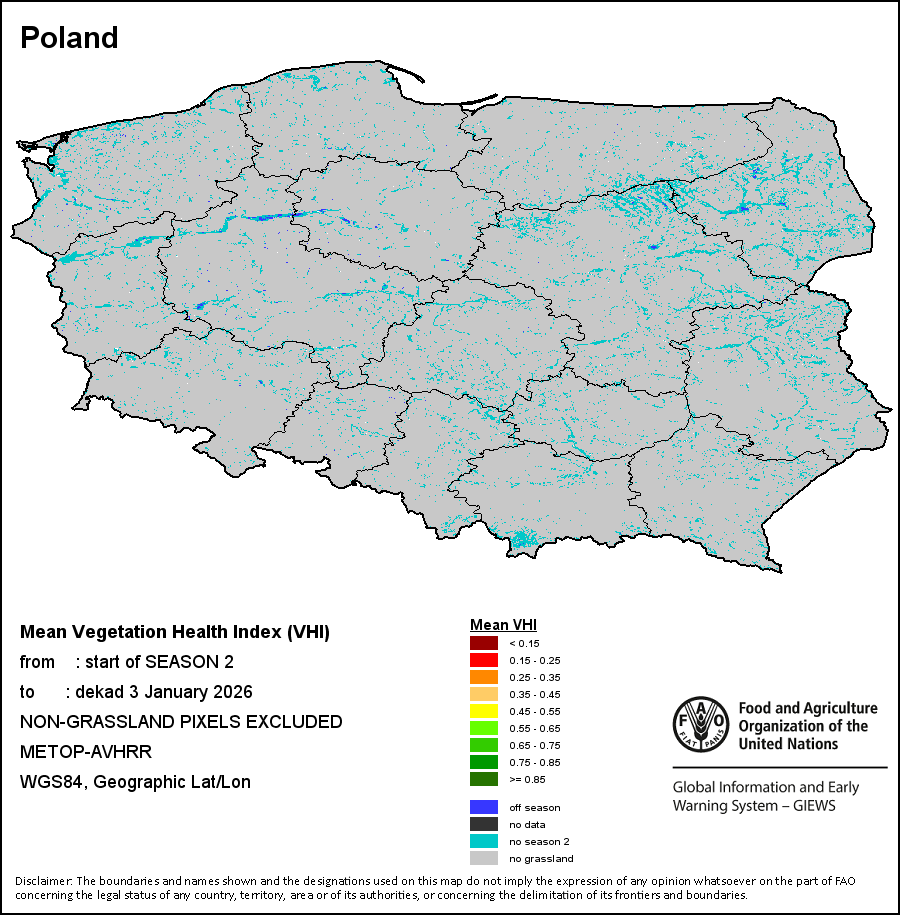 国别地图和图表显示的是最近36个月期间的季节、植被和降水指标。数据按每10天和每月呈现。 所有三项植被指标都是基于来自METOP-AVHRR遥感卫星分辨率1千米的10天(旬)植被数据(2007年及以后)得出的。1984-2006年期间的1千米分辨率数据得自NOAA-AVHRR16千米分辨率数据集。所有非洲国家的降水量估算(除佛得角和毛里求斯外)均取自NOAA/FEWSNet (16千米分辨率),其他国家则取自ECMWF(25千米分辨率)。 由于植被指标(如NDVI、VHI)的空间分辨率高于降水指标,因此,在部分国家能够通过有效分区统计数据计算植被指标的次国家级单元数量,超过能够以相同方式计算降水指标的次国家级单元数量。