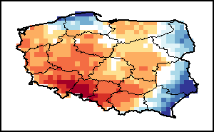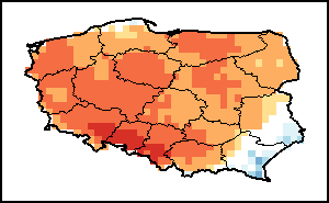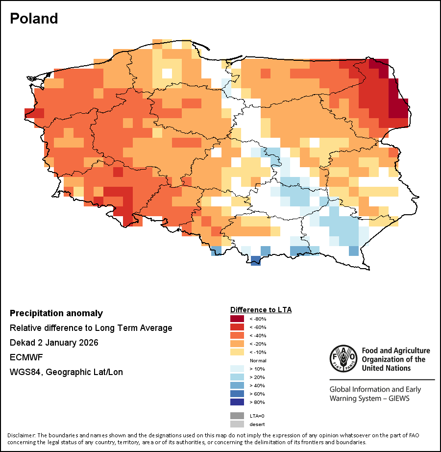 该图谱显示了当前降水量与平均水平之间的差异。 由降水量水平与长期平均值(LTA)进行比较得出,长期平均值系指1989-2015年期间的数值。暖色调指示的是降水量低于平均水平的地区,而冷色调指示的则是降水量高于平均水平的地区。降雨量估算数据来自欧洲中期天气预报这些(ECMWF)。