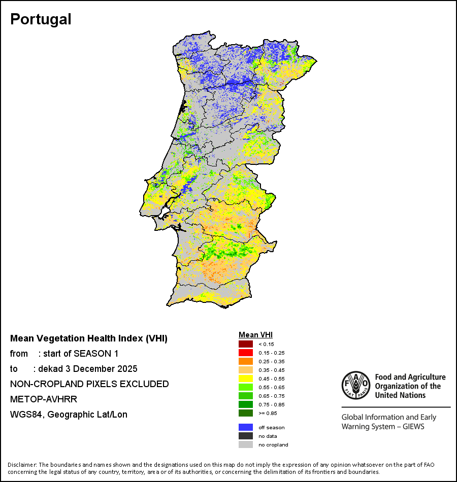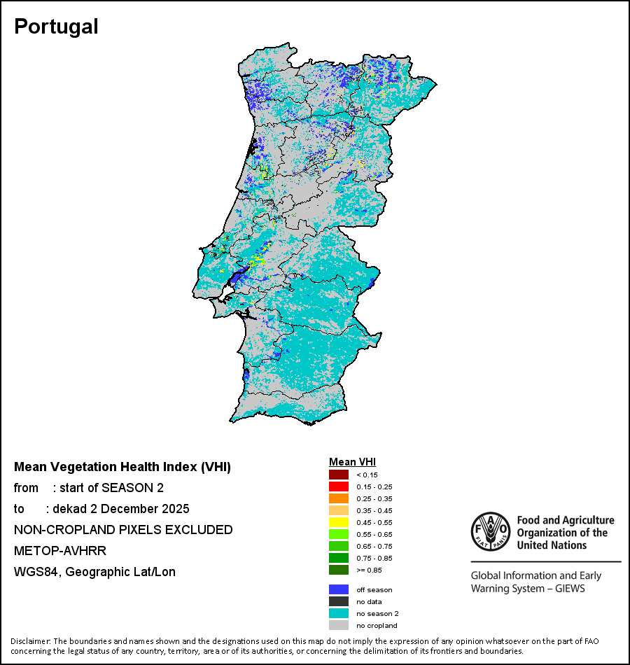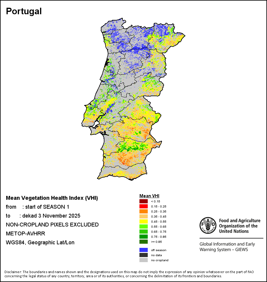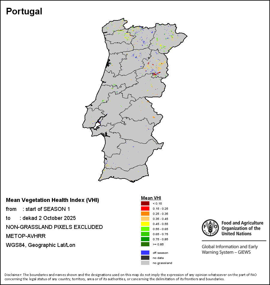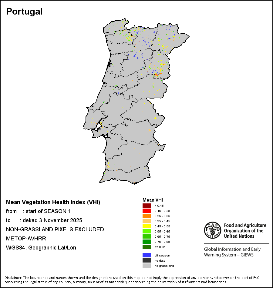 The country level maps and graphs depict the latest 36-month period of the seasonal, vegetation and precipitation indicators. The data is presented by dekad and month. All three vegetation indicators are based on 10-day (dekadal) vegetation data from the METOP-AVHRR sensor at 1 km resolution (2007 and after). Data at 1 km resolution for the period 1984-2006 are derived from the NOAA-AVHRR dataset at 16 km resolution. Precipitation estimates for all African countries (except Cabo Verde and Mauritius) are taken from NOAA/FEWSNet (16 km resolution), while for the remaining countries data is obtained from ECMWF (25 km resolution). Owing to the higher resolution of vegetation indicators (e.g., NDVI, VHI) compared to coarser precipitation indicators, the number of sub-national units for which valid zonal statistics can be generated for vegetation indices is greater than the number of units for precipitation indicators for certain countries.