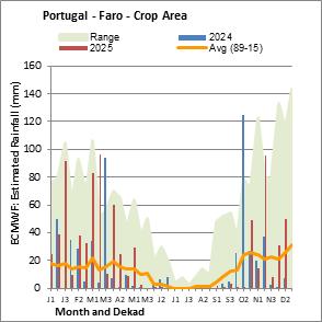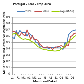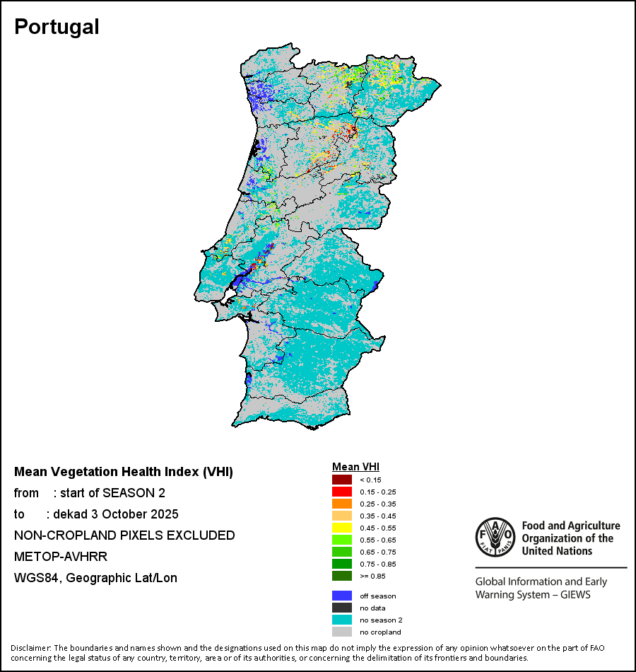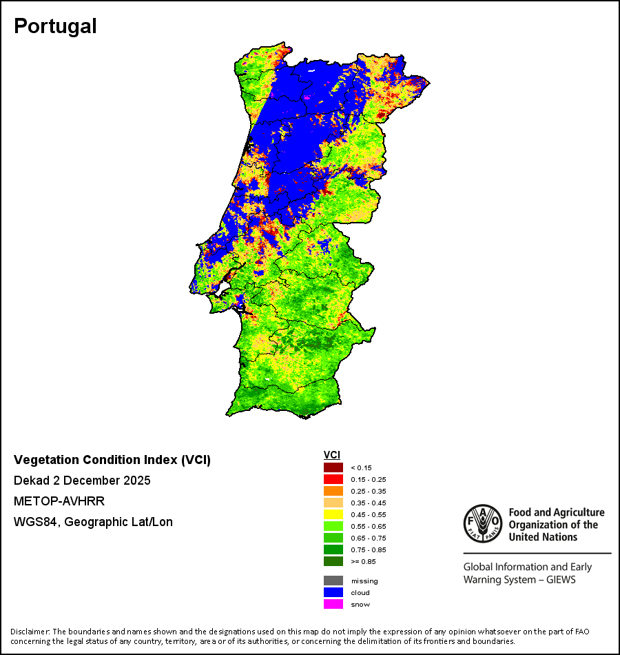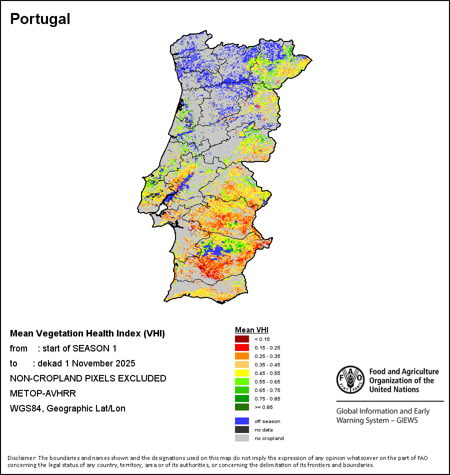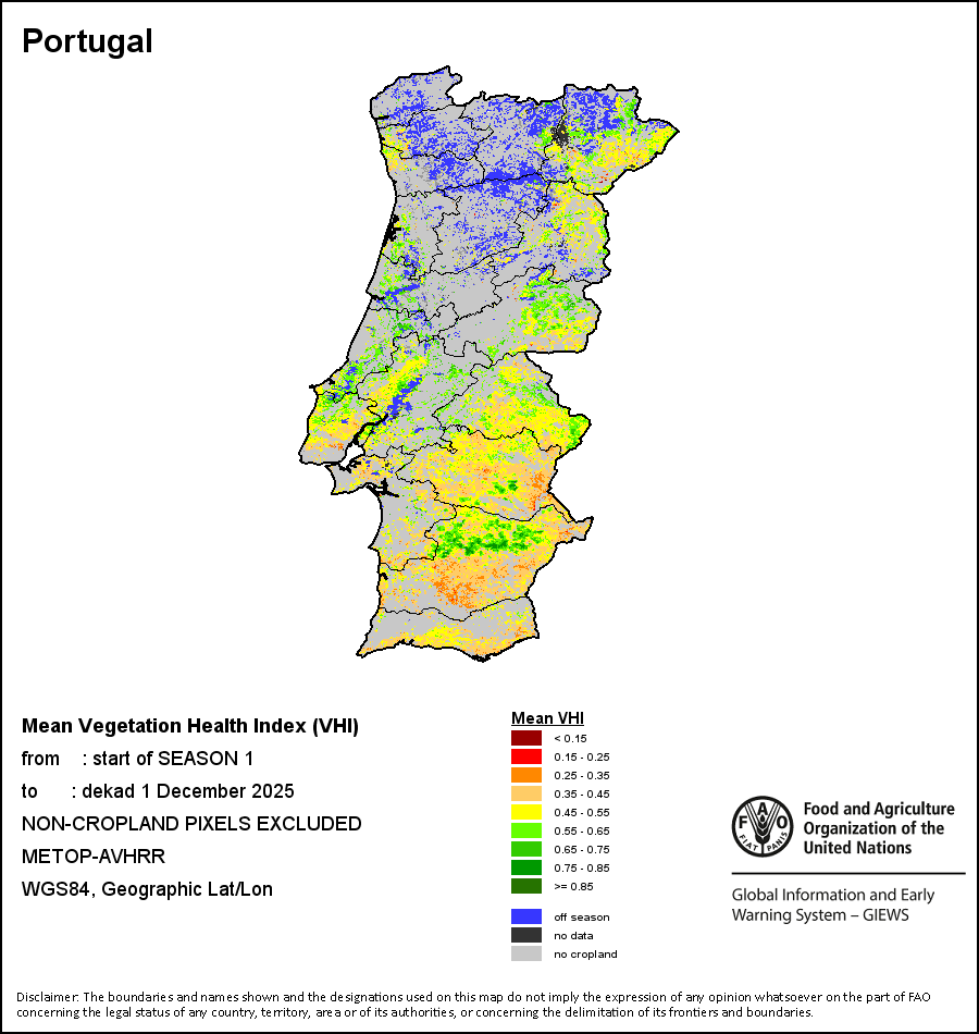 The country level maps and graphs depict the latest 36-month period of the seasonal, vegetation and precipitation indicators. The data is presented by dekad and month. All three vegetation indicators are based on 10-day (dekadal) vegetation data from the METOP-AVHRR sensor at 1 km resolution (2007 and after). Data at 1 km resolution for the period 1984-2006 are derived from the NOAA-AVHRR dataset at 16 km resolution. Precipitation estimates for all African countries (except Cabo Verde and Mauritius) are taken from NOAA/FEWSNet (16 km resolution), while for the remaining countries data is obtained from ECMWF (25 km resolution). Owing to the higher resolution of vegetation indicators (e.g., NDVI, VHI) compared to coarser precipitation indicators, the number of sub-national units for which valid zonal statistics can be generated for vegetation indices is greater than the number of units for precipitation indicators for certain countries.