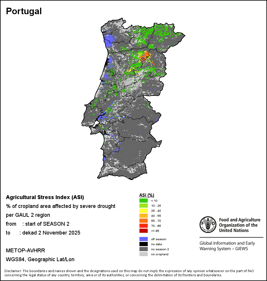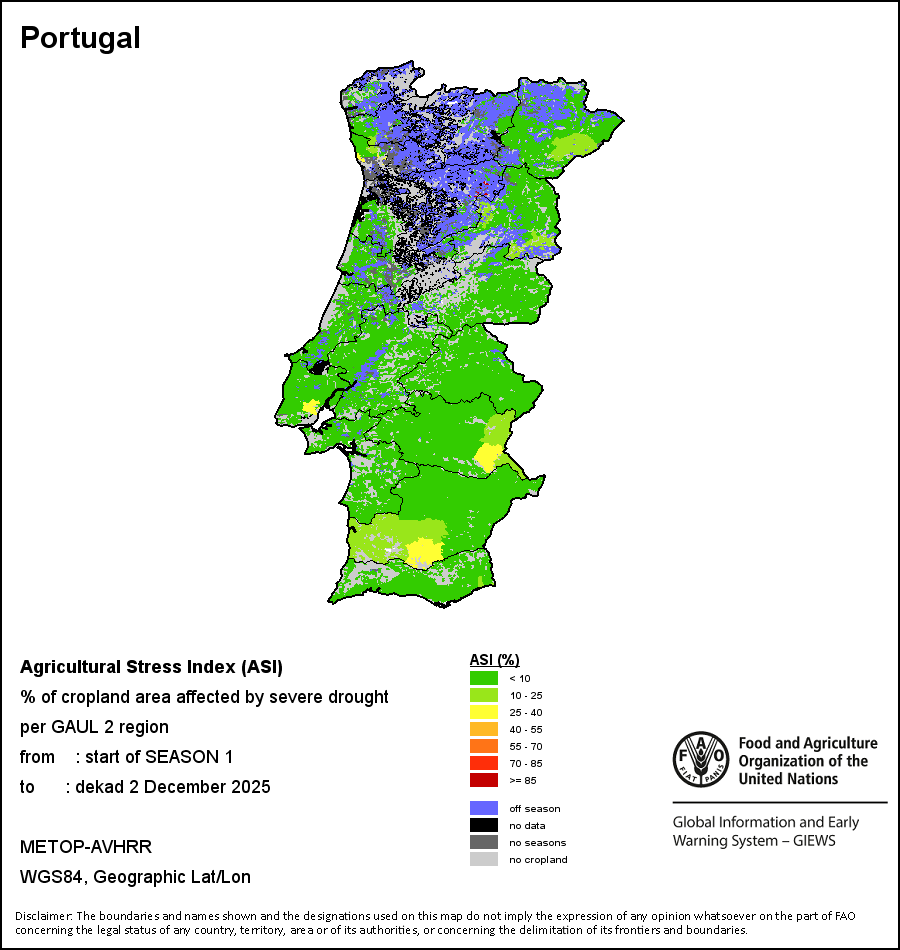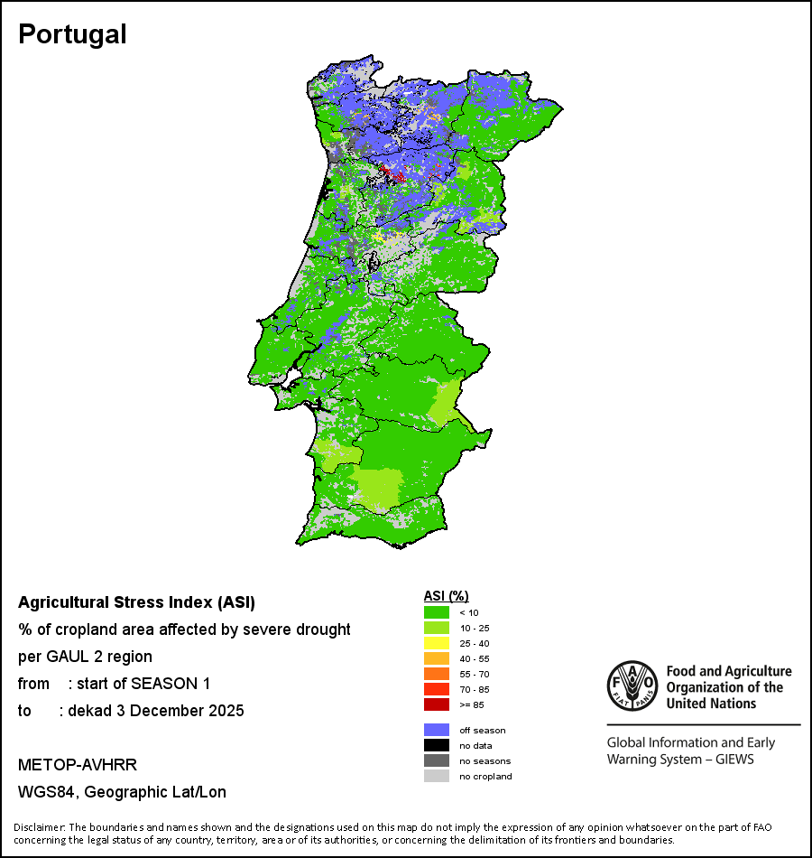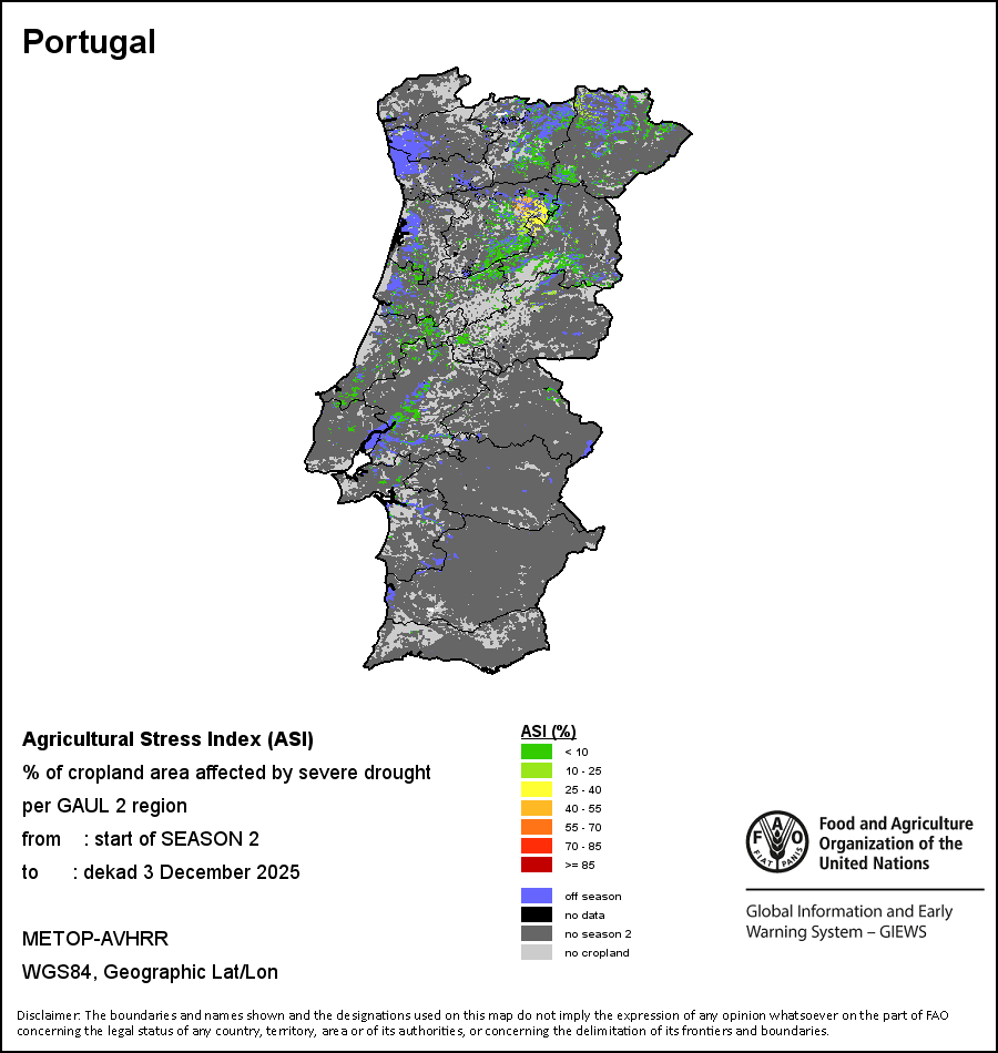 The Agricultural Stress Index (ASI) is a quick-look indicator that facilitates the early identification of cropped land with a high likelihood of water stress (drought). The Index is based on the integration of the Vegetation Health Index (VHI) in two dimensions that are critical in the assessment of a drought event in agriculture: temporal and spatial. The first step of the ASI calculation is a temporal averaging of the VHI, assessing the intensity and duration of dry periods occurring during the crop cycle at the pixel level; this calculation includes the use of crop coefficients, which introduces sensitivity of a crop to water stress during each phenological phase. The second step determines the spatial extent of drought events by calculating the percentage of pixels in arable areas with a VHI value below 35 percent (this value was identified as a critical threshold in assessing the extent of drought in previous research by Kogan, 1995). Each administrative area is classified according to the percentage of the affected area to facilitate the quick interpretation of results.