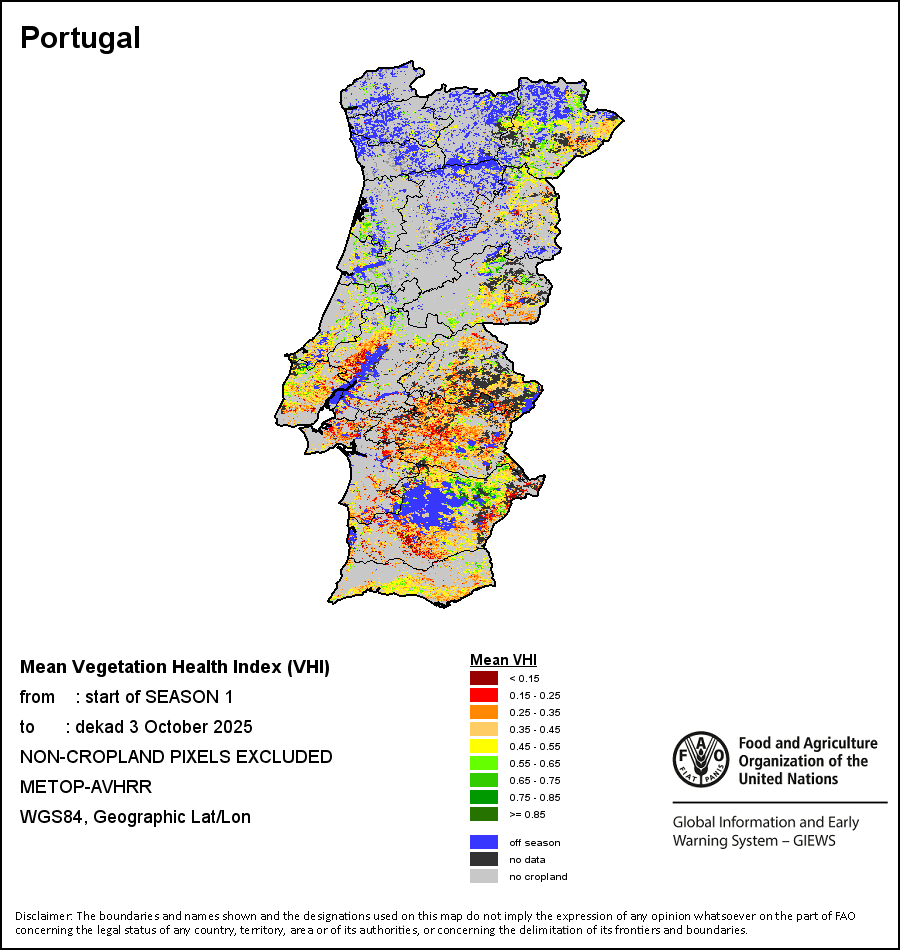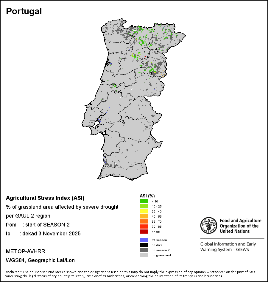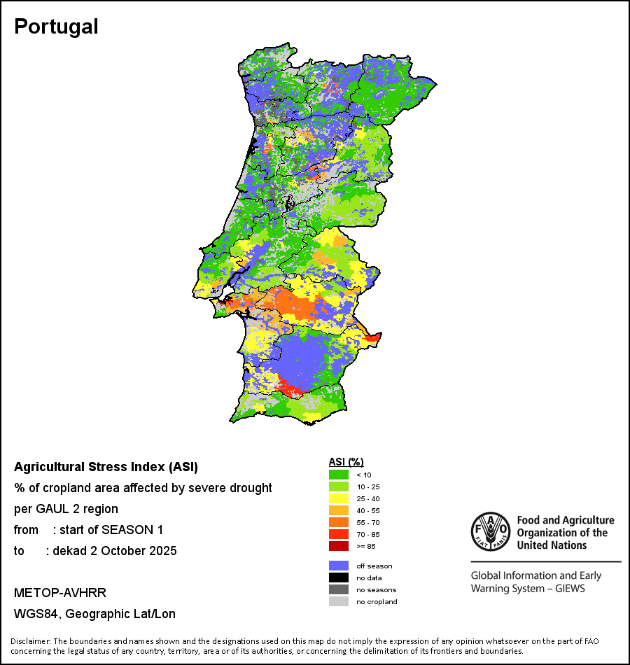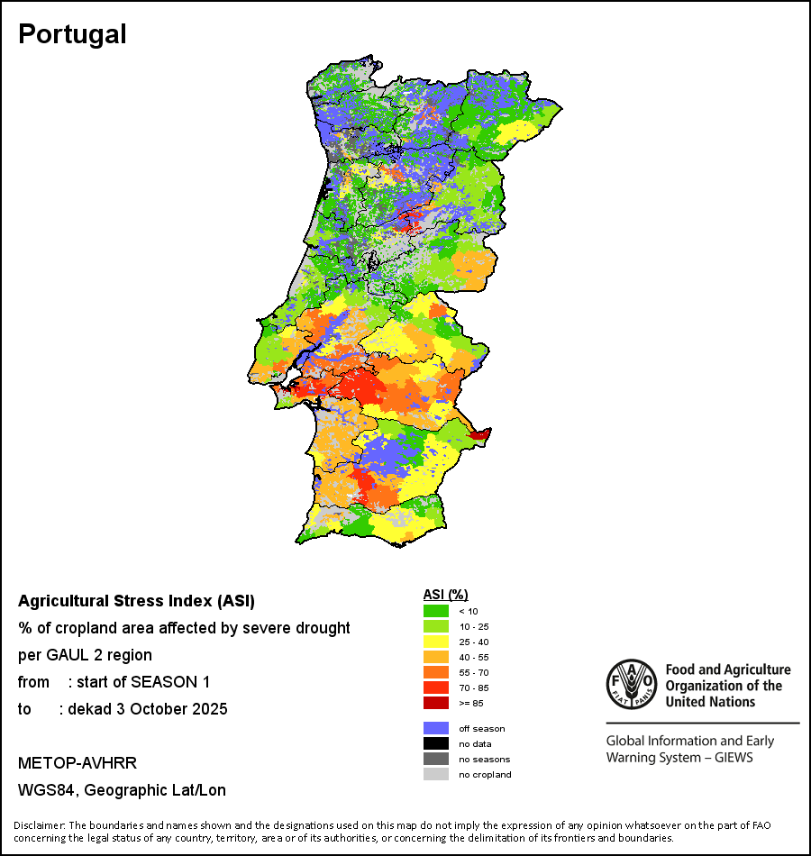 The Agricultural Stress Index (ASI) is a quick-look indicator that facilitates the early identification of cropped land with a high likelihood of water stress (drought). The Index is based on the integration of the Vegetation Health Index (VHI) in two dimensions that are critical in the assessment of a drought event in agriculture: temporal and spatial. The first step of the ASI calculation is a temporal averaging of the VHI, assessing the intensity and duration of dry periods occurring during the crop cycle at the pixel level; this calculation includes the use of crop coefficients, which introduces sensitivity of a crop to water stress during each phenological phase. The second step determines the spatial extent of drought events by calculating the percentage of pixels in arable areas with a VHI value below 35 percent (this value was identified as a critical threshold in assessing the extent of drought in previous research by Kogan, 1995). Each administrative area is classified according to the percentage of the affected area to facilitate the quick interpretation of results.