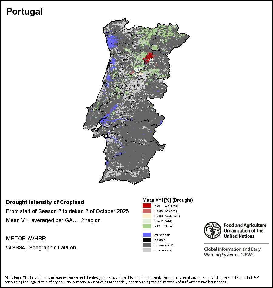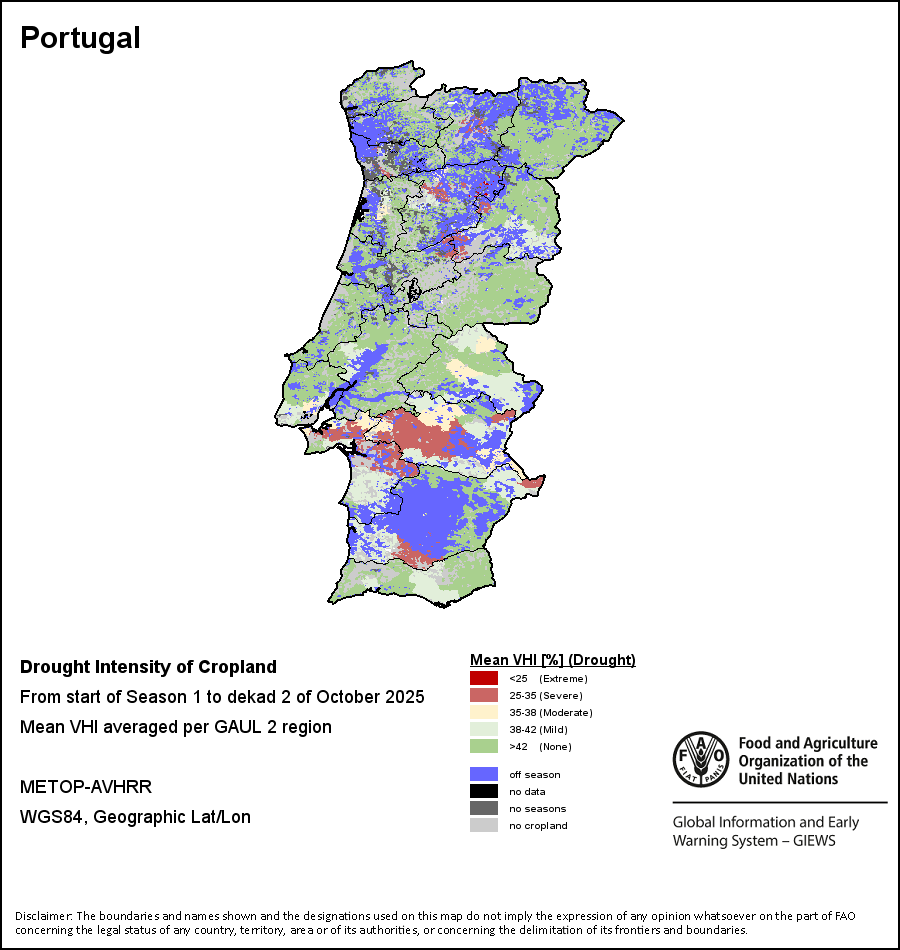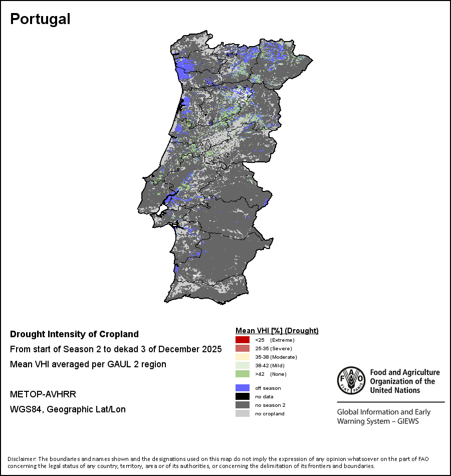 Agricultural droughts are classified by their intensity and are categorized into four classes: Extreme, Severe, Moderate or Mild. The intensity of the drought is calculated through the Weighted Mean Vegetation Health Index aggregated per GAUL 2 region, indicating that the poorer the vegetation health the more severe the drought.