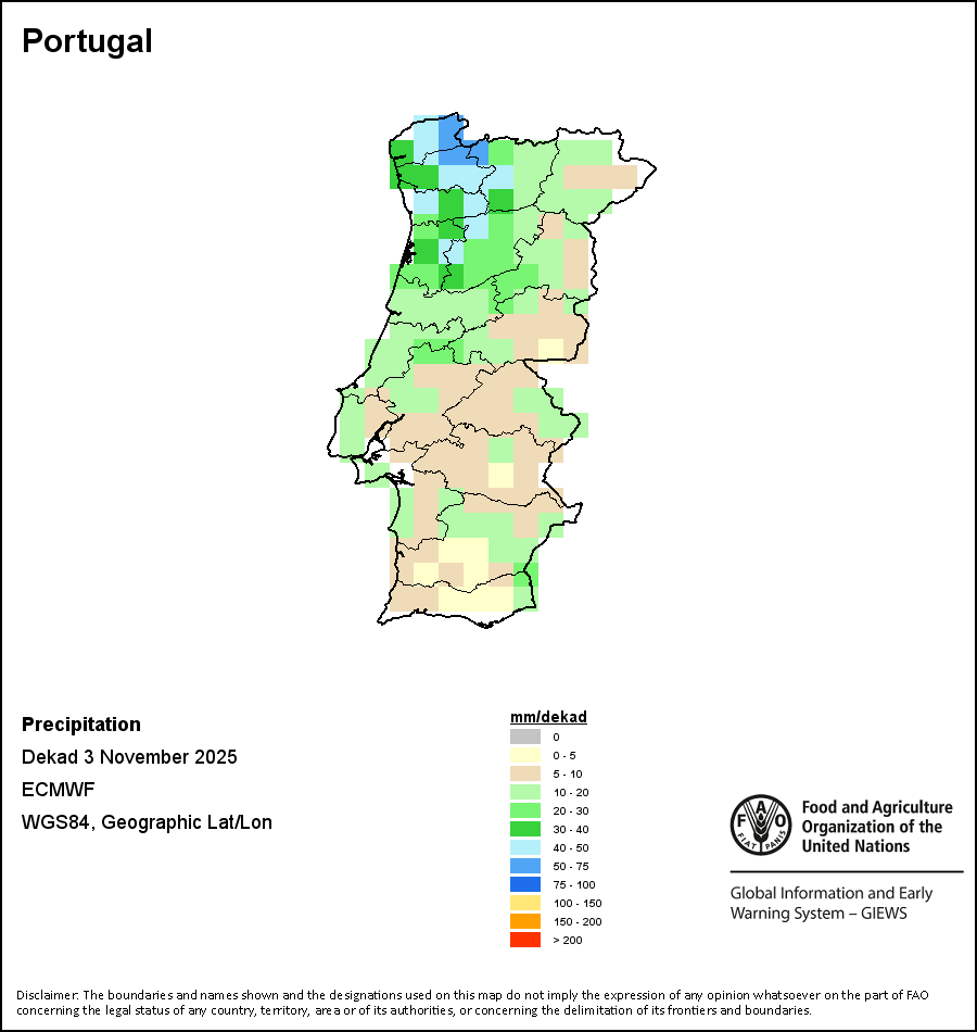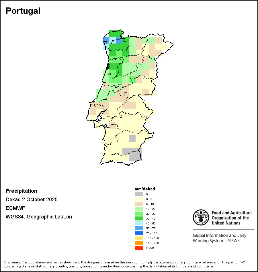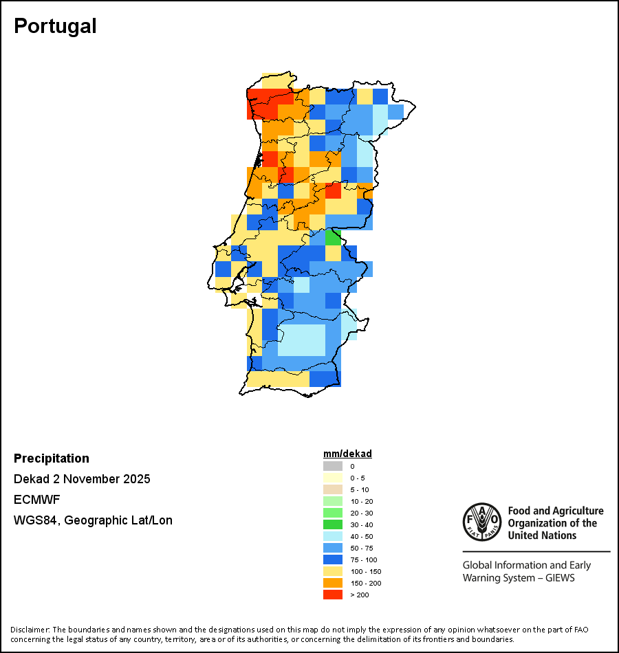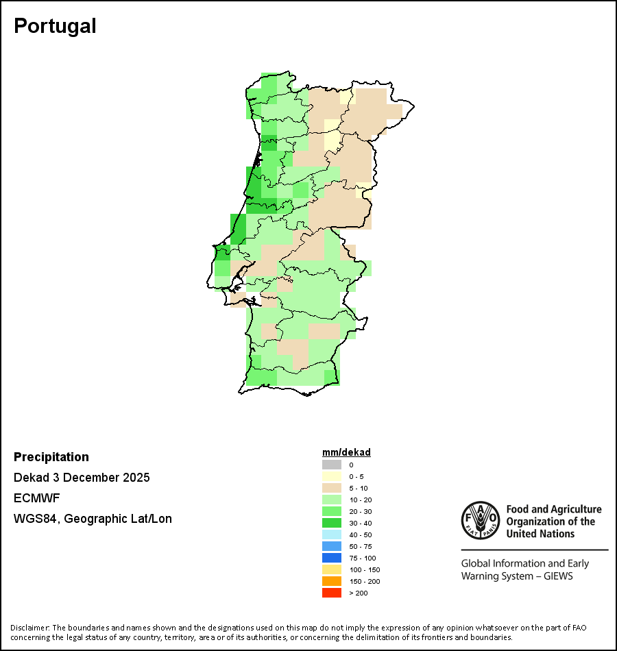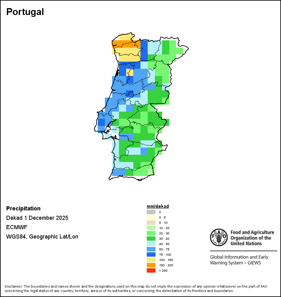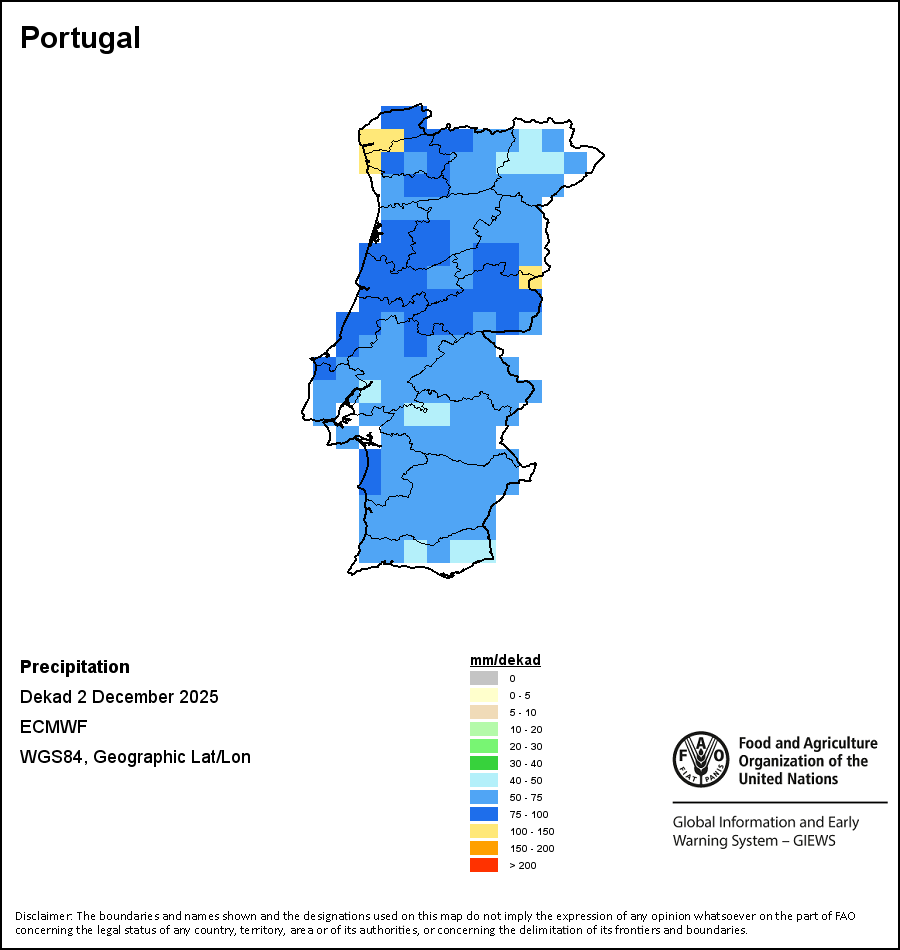 The map depicts cumulative rainfall volumes over a dekad (a 10-day period). Precipitation estimates for all African countries (except Cabo Verde and Mauritius) are taken from NOAA/FEWSNet, while for the remaining countries data is obtained from ECMWF.
