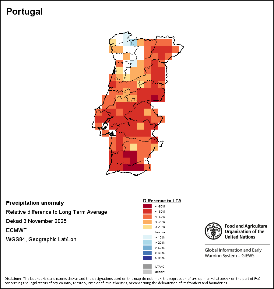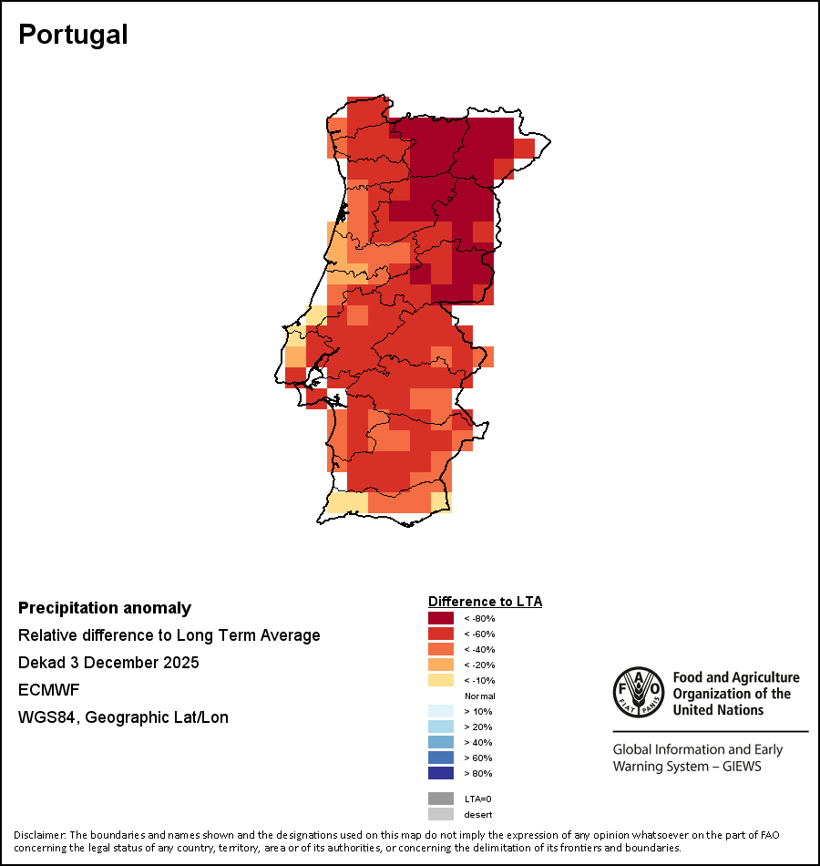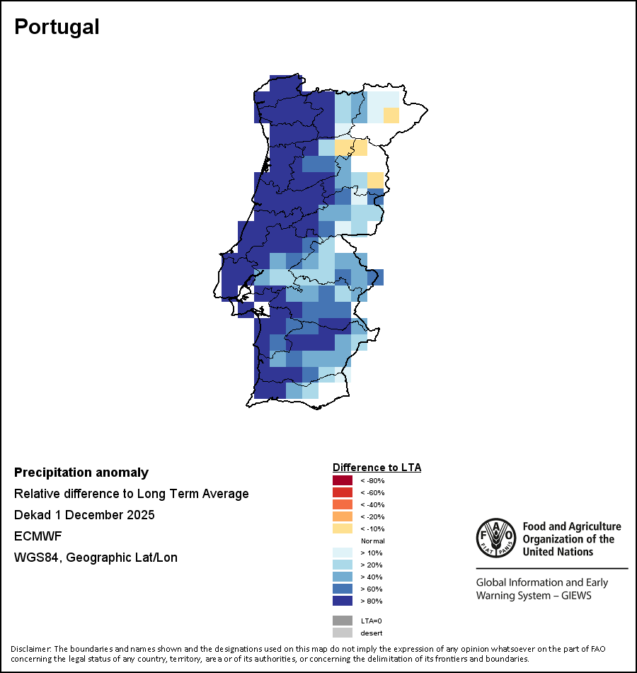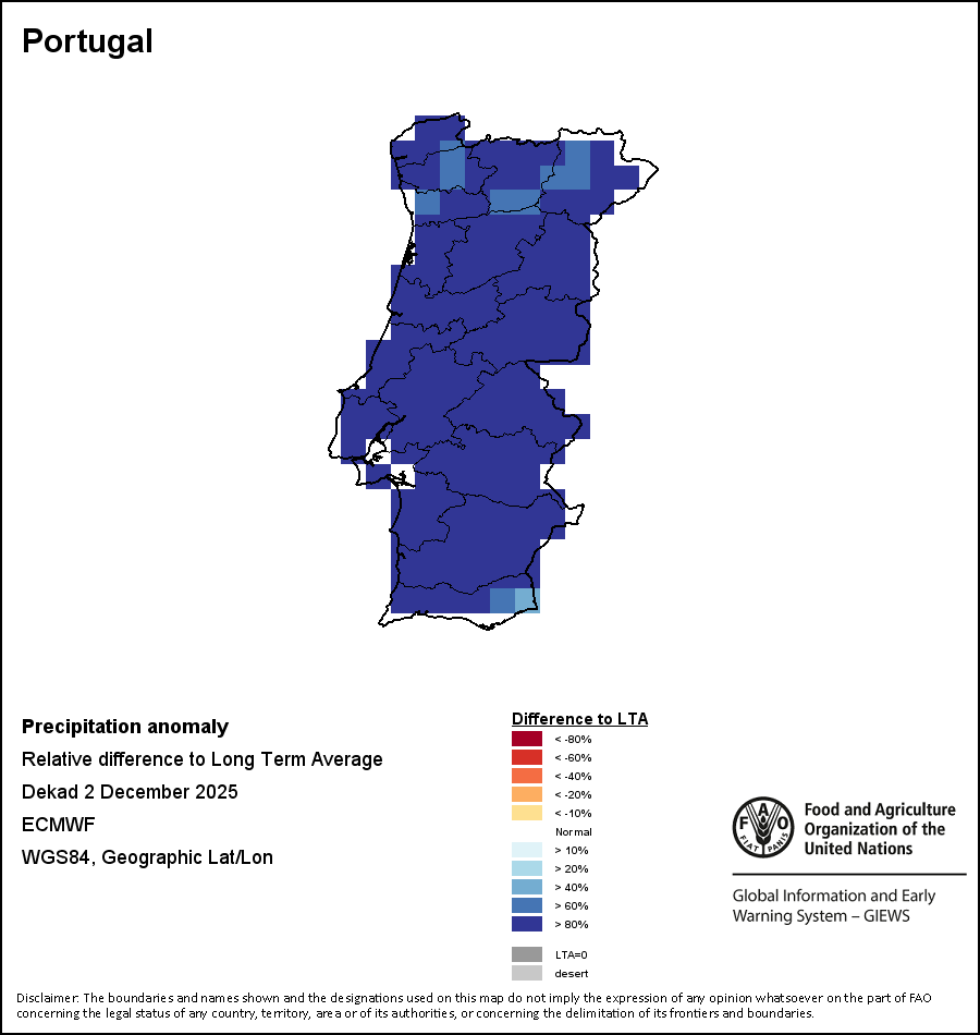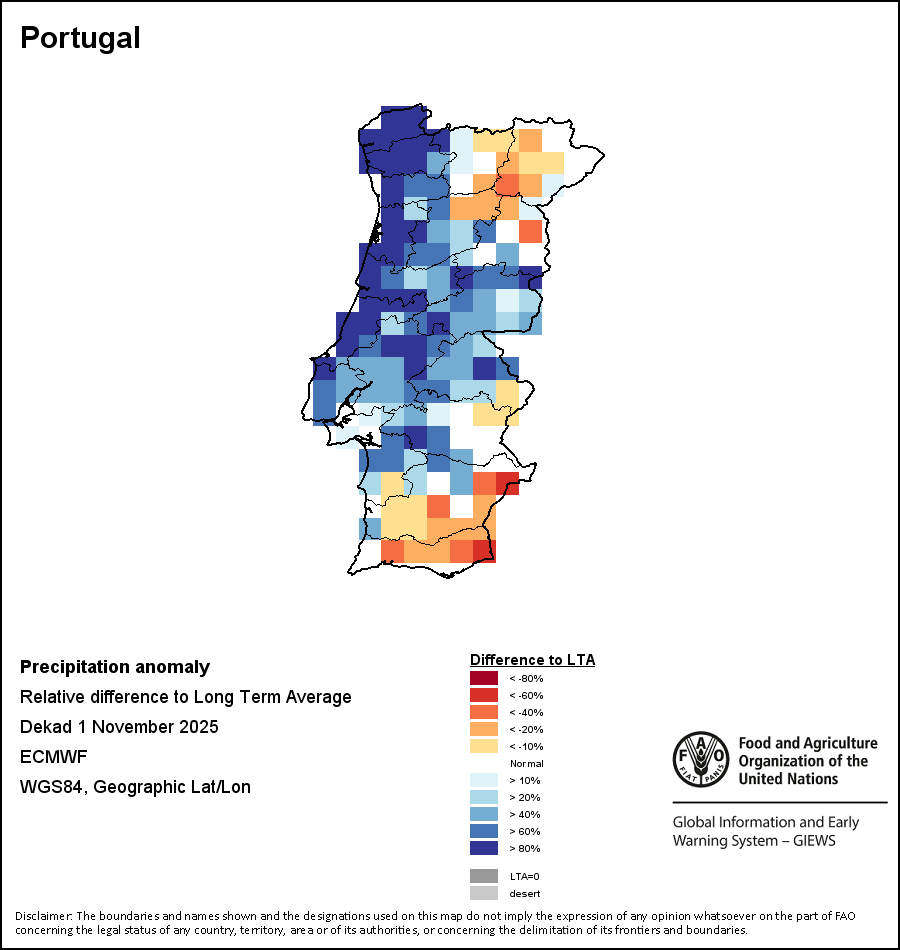 The map illustrates the difference between the current rainfall volume and the average level. Rainfall levels are compared with the Long-Term Average (LTA), which refers to the period 1989-2015. Warmer colours identify areas which have received lower-than-average rainfall, while colder colours are given to areas where precipitation has been above average.