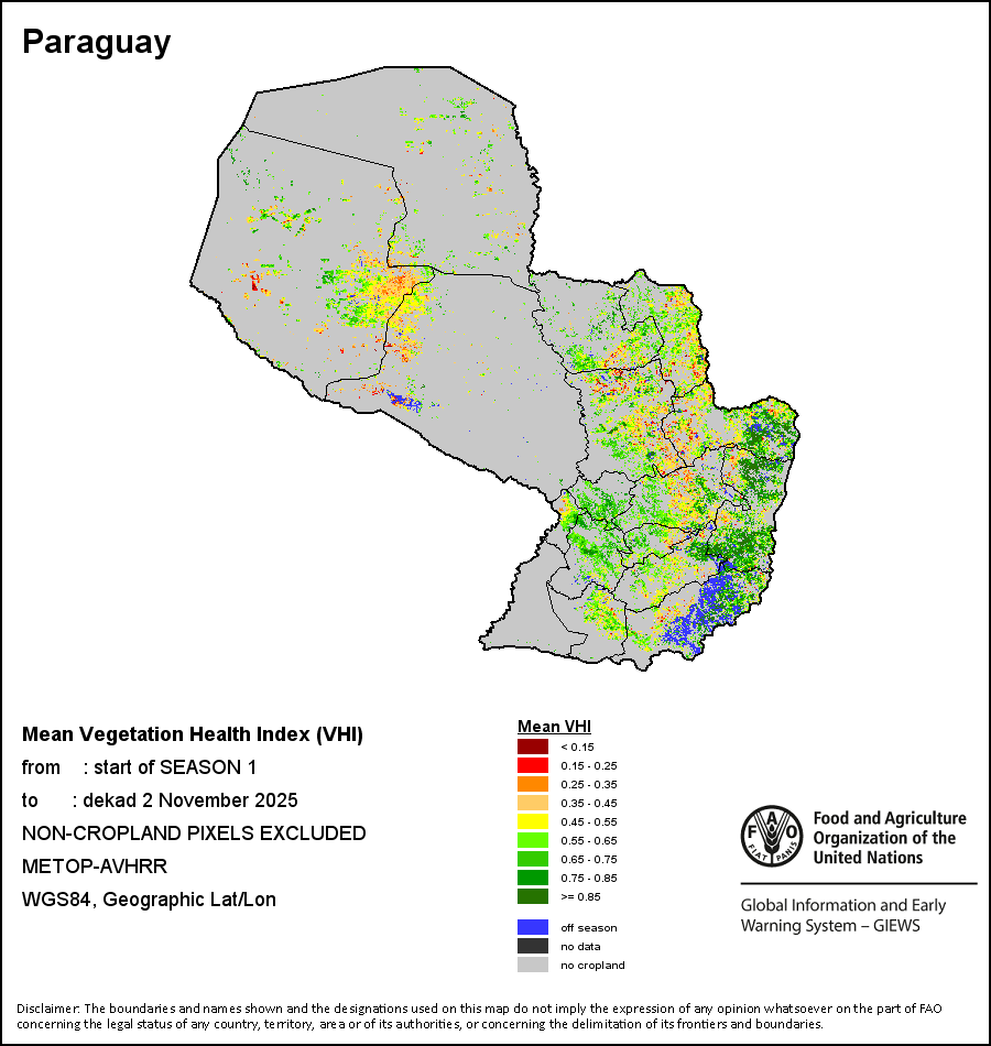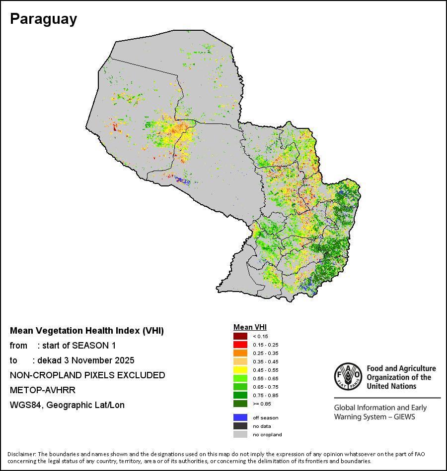 The country level maps and graphs depict the latest 36-month period of the seasonal, vegetation and precipitation indicators. The data is presented by dekad and month. All three vegetation indicators are based on 10-day (dekadal) vegetation data from the METOP-AVHRR sensor at 1 km resolution (2007 and after). Data at 1 km resolution for the period 1984-2006 are derived from the NOAA-AVHRR dataset at 16 km resolution. Precipitation estimates for all African countries (except Cabo Verde and Mauritius) are taken from NOAA/FEWSNet (16 km resolution), while for the remaining countries data is obtained from ECMWF (25 km resolution). Owing to the higher resolution of vegetation indicators (e.g., NDVI, VHI) compared to coarser precipitation indicators, the number of sub-national units for which valid zonal statistics can be generated for vegetation indices is greater than the number of units for precipitation indicators for certain countries.