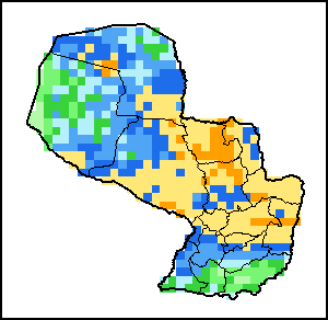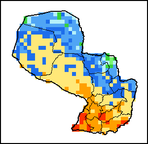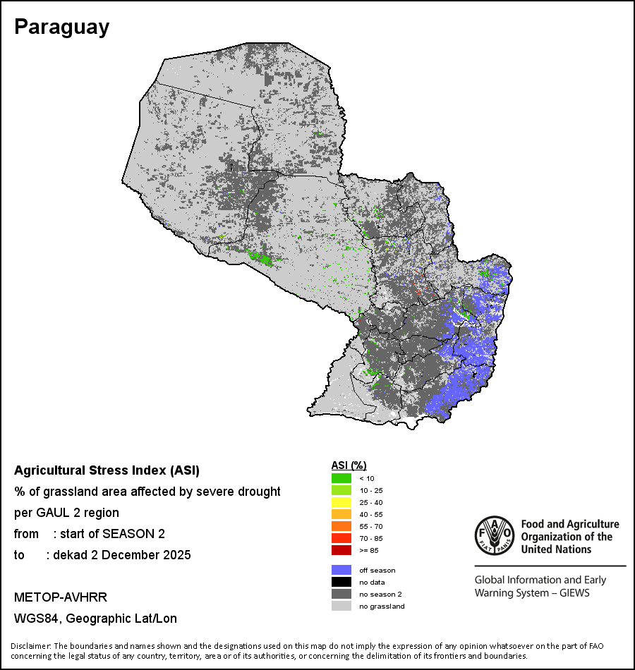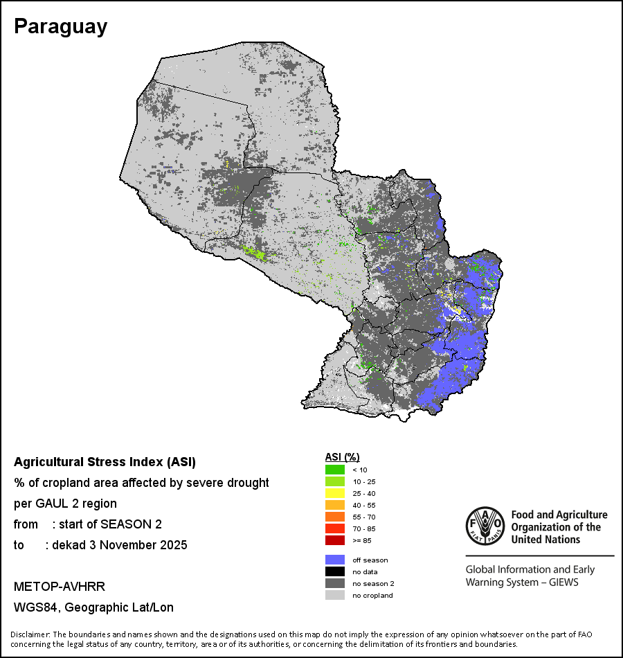 The Agricultural Stress Index (ASI) is a quick-look indicator that facilitates the early identification of cropped land with a high likelihood of water stress (drought). The Index is based on the integration of the Vegetation Health Index (VHI) in two dimensions that are critical in the assessment of a drought event in agriculture: temporal and spatial. The first step of the ASI calculation is a temporal averaging of the VHI, assessing the intensity and duration of dry periods occurring during the crop cycle at the pixel level; this calculation includes the use of crop coefficients, which introduces sensitivity of a crop to water stress during each phenological phase. The second step determines the spatial extent of drought events by calculating the percentage of pixels in arable areas with a VHI value below 35 percent (this value was identified as a critical threshold in assessing the extent of drought in previous research by Kogan, 1995). Each administrative area is classified according to the percentage of the affected area to facilitate the quick interpretation of results.