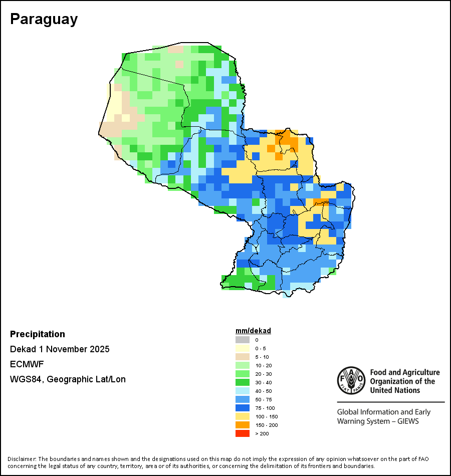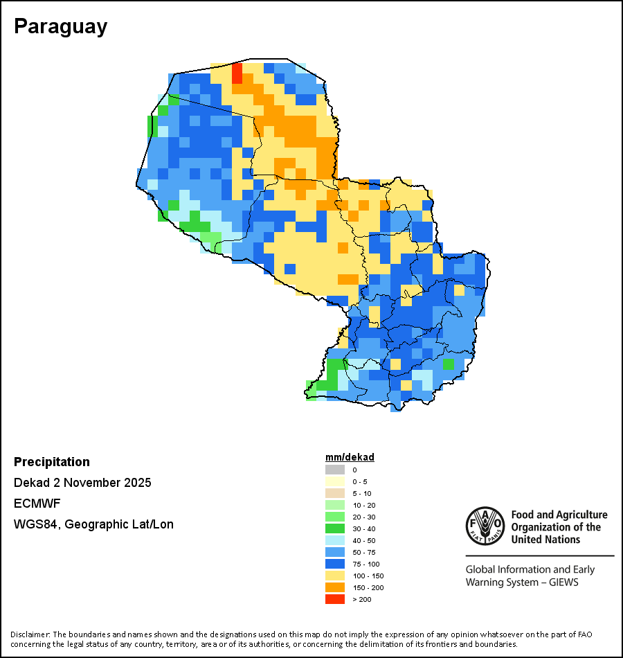 The map depicts cumulative rainfall volumes over a dekad (a 10-day period). Precipitation estimates for all African countries (except Cabo Verde and Mauritius) are taken from NOAA/FEWSNet, while for the remaining countries data is obtained from ECMWF.