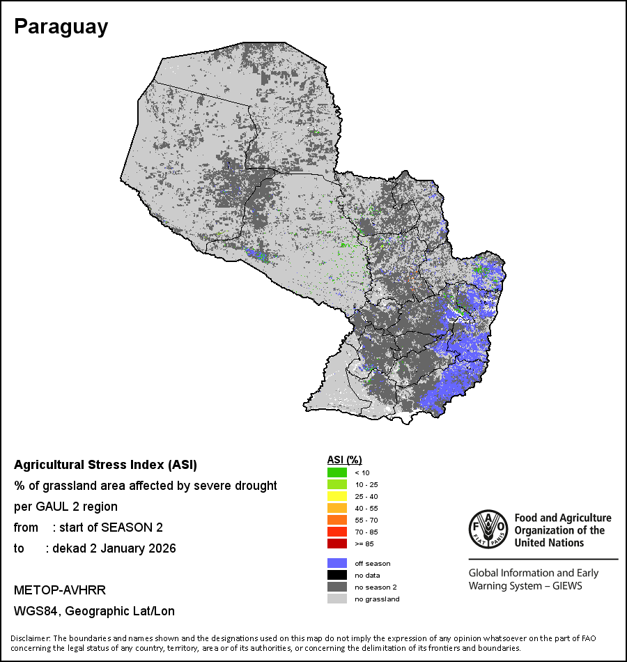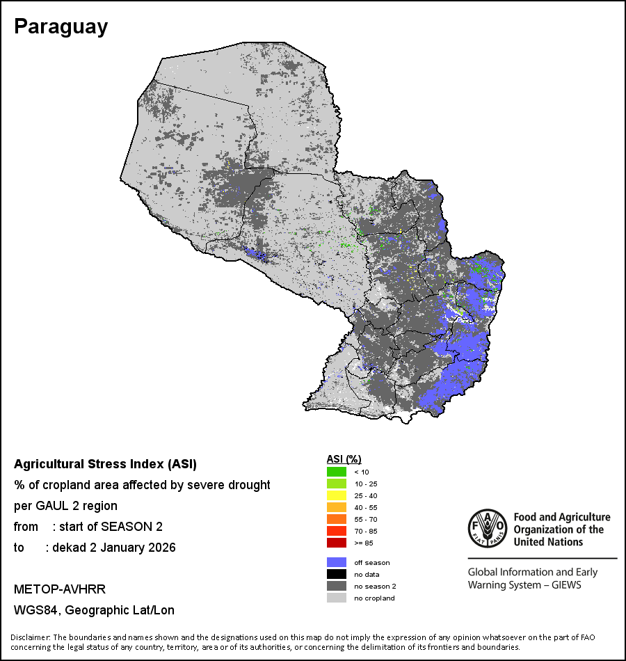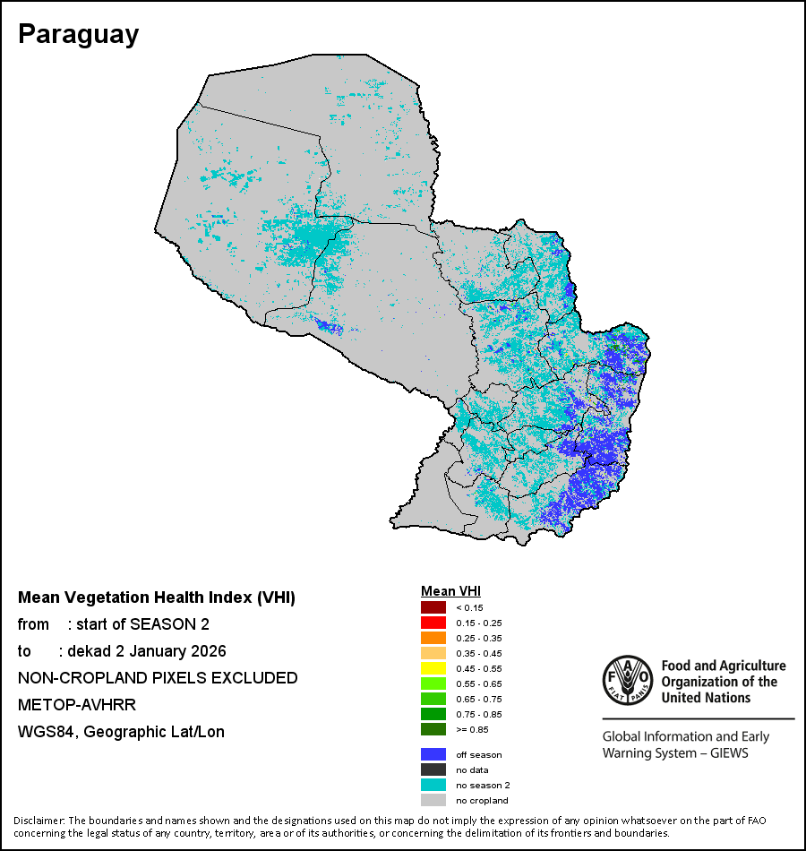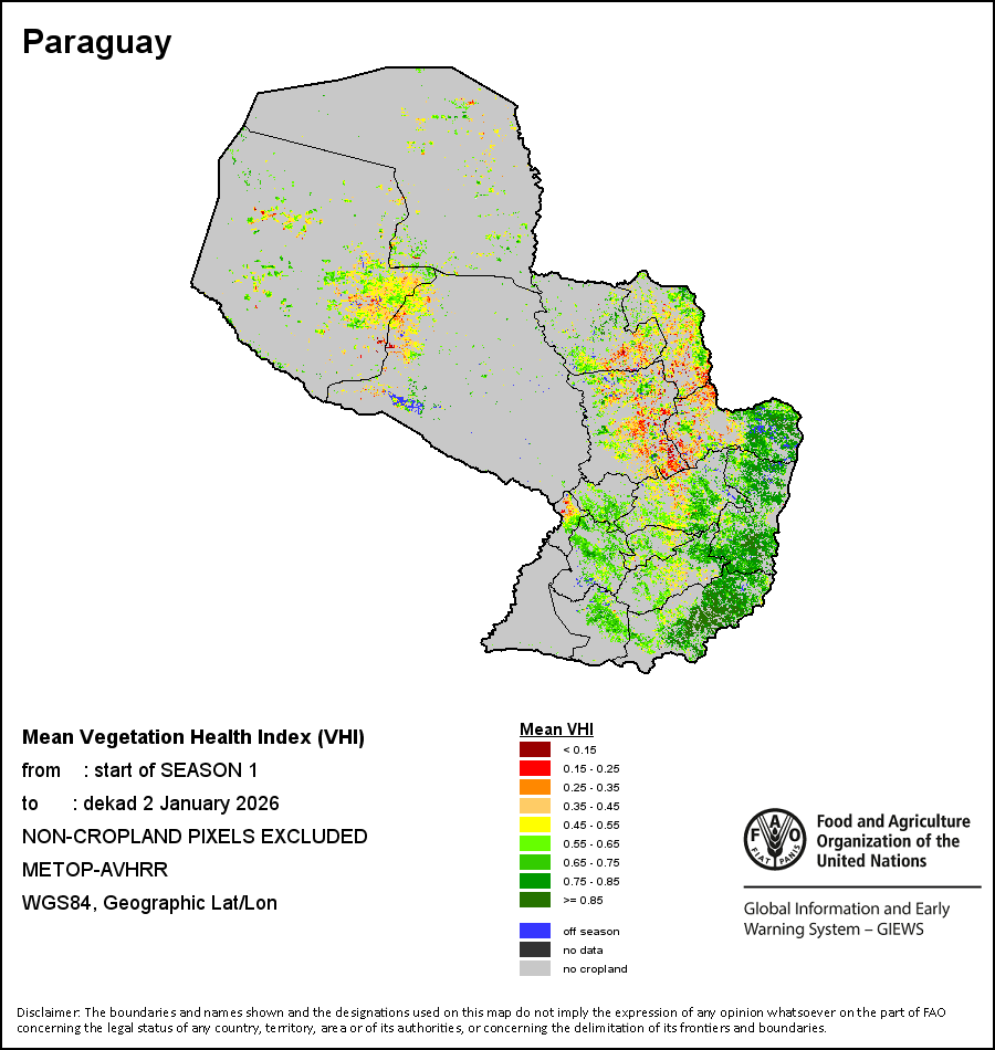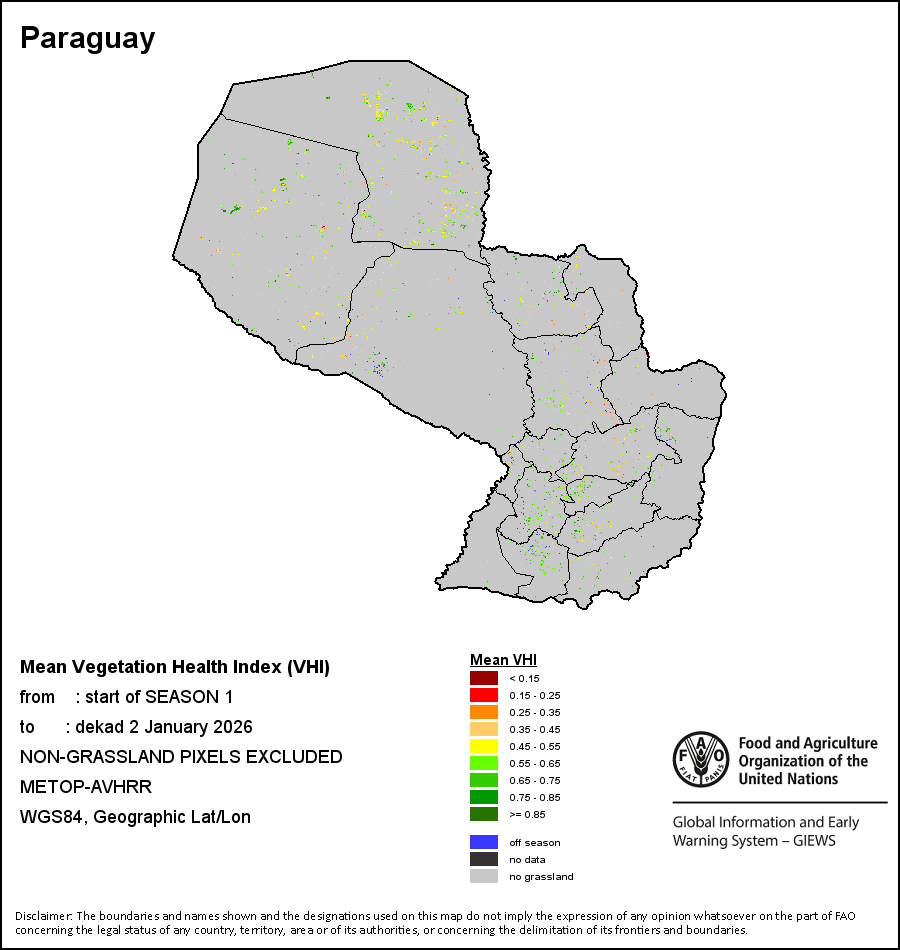 Индекс здоровья растительности (VHI) иллюстрирует серьезность засухи, основанной на здоровье растительности и влиянии температуры на состояние растений. VHI является составным индексом и элементарным индикатором, используемым для вычисления ASI. Он сочетает в себе как Индекс Состояния Растительности (VCI), так и Индекс Состояния Температуры (TCI). TCI рассчитывается с использованием аналогичного уравнения с VCI, но связывает текущую температуру с долгосрочным максимумом и минимумом, так как предполагается, что более высокие температуры, как правило, вызывают ухудшение состояния растительности. Например, уменьшение VHI будет означать относительно слабое состояние растительности и более высокие температуры, означающее ухудшение состояния растительности, что в течение более длительного периода будет свидетельствовать о засухе. Изображения VHI вычисляются для двух основных сезонов и трех модальностей: по-декадный, ежемесячный и годовой. |