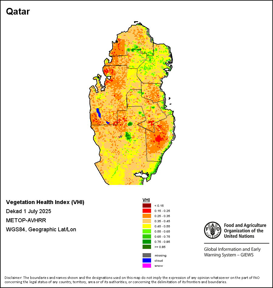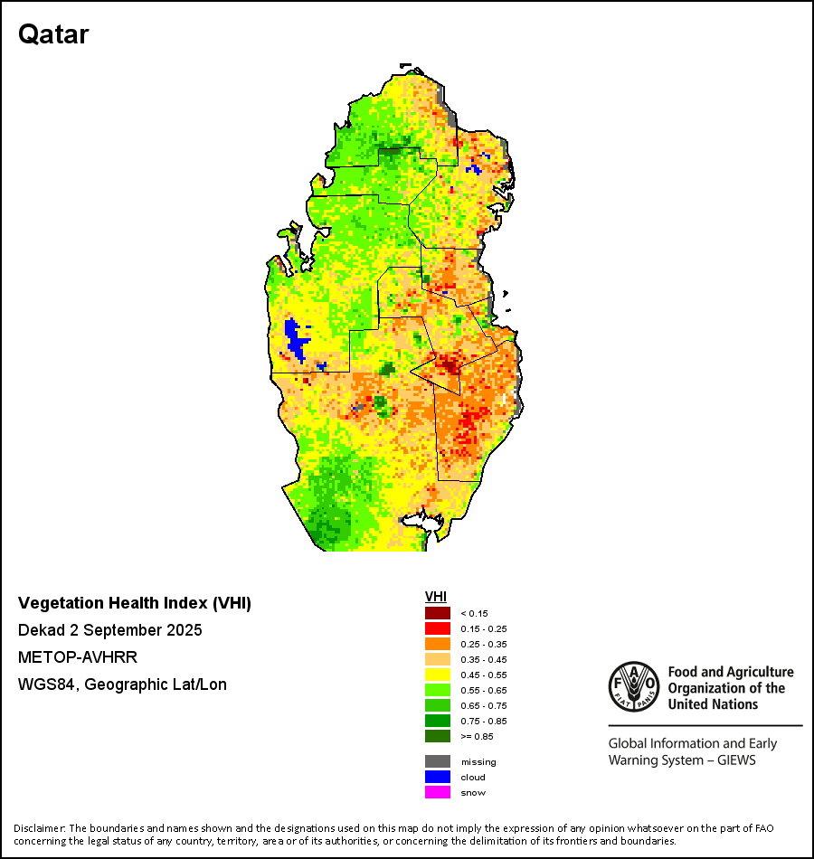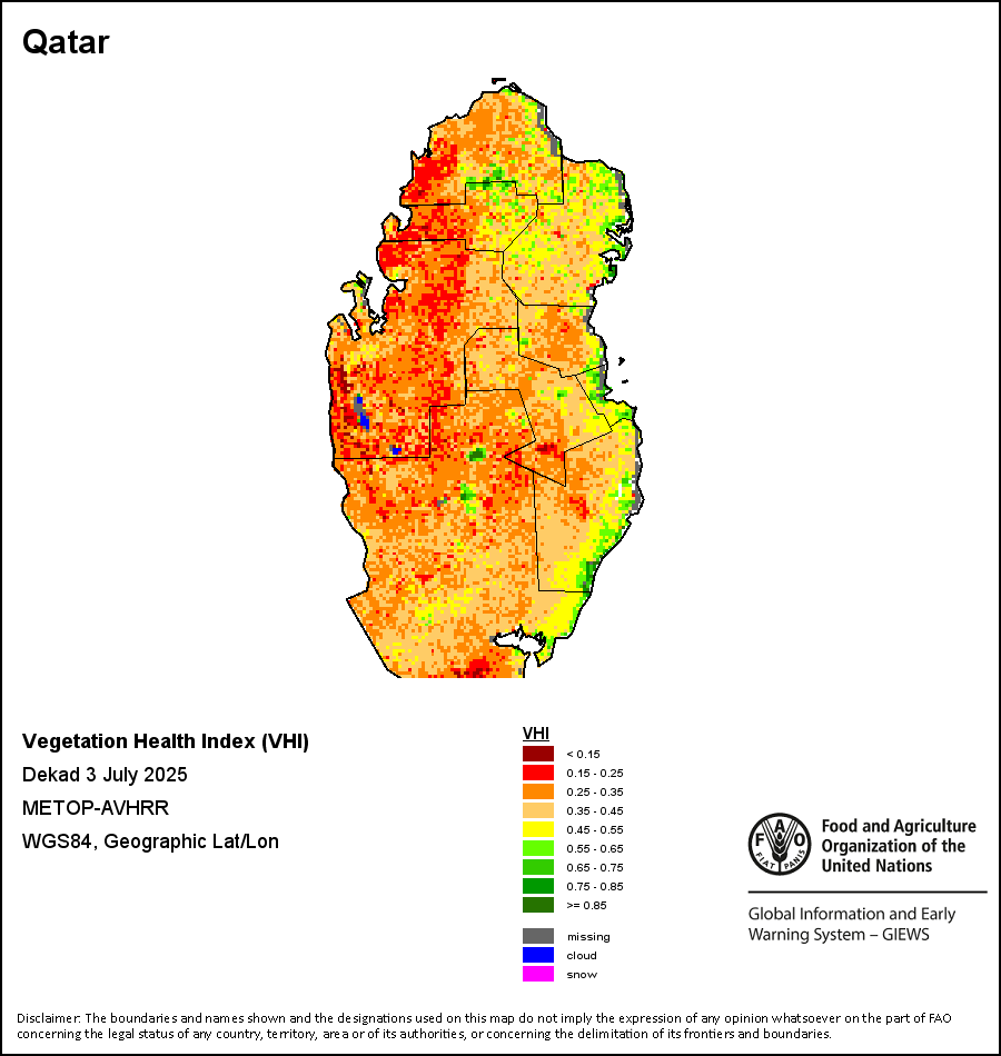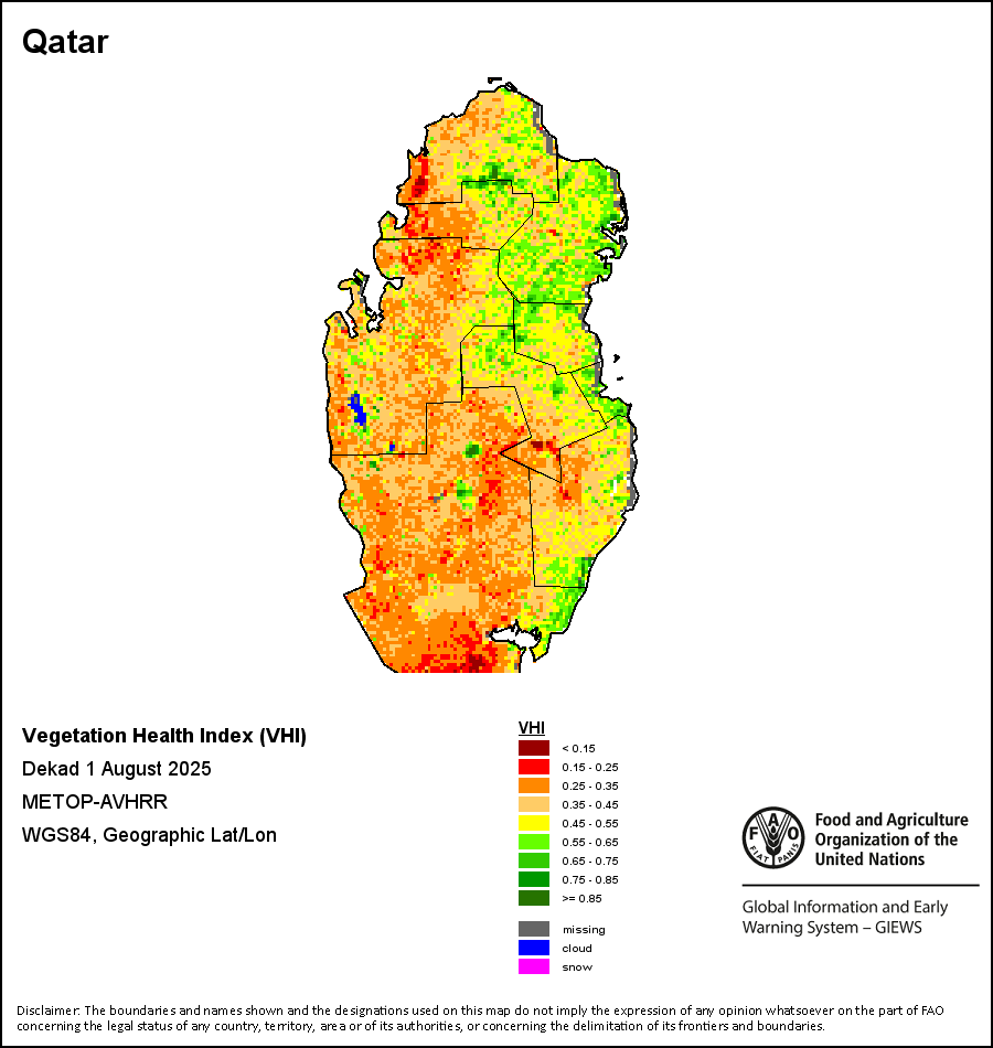 تصور الخرائط والمخططات البيانية المرسومة على مستوى البلد آخر 36 شهراً في للمؤشرات الموسمية والنباتية وتلك المتعلقة بالهطولات. وتمثل البيانات خلال فترة عشرة أيام وشهر.   أكثر