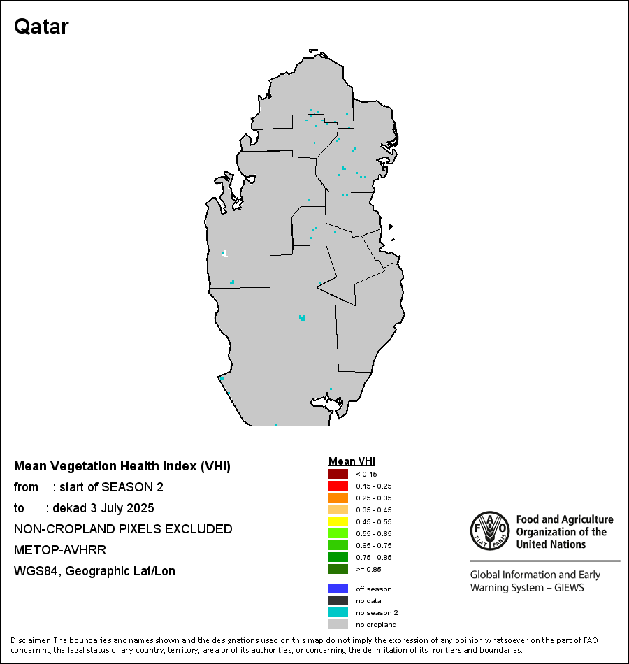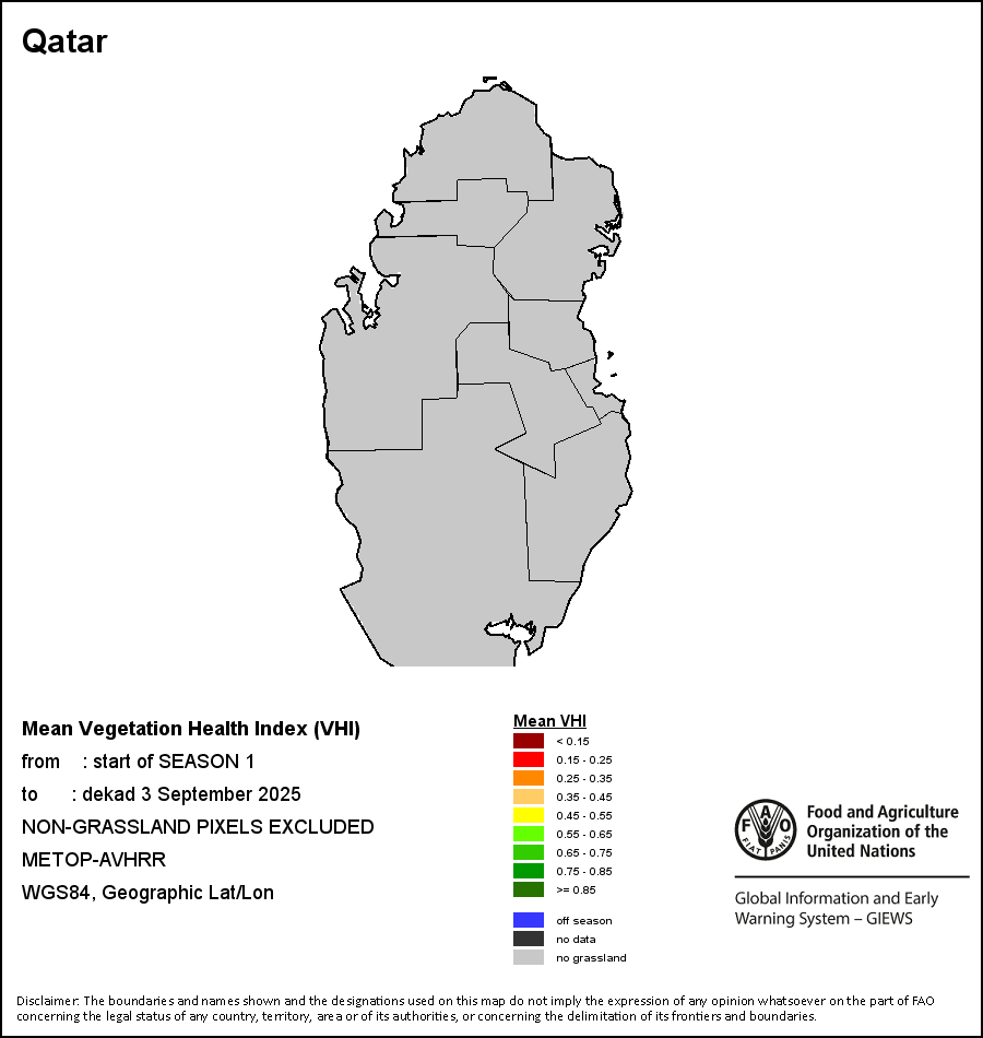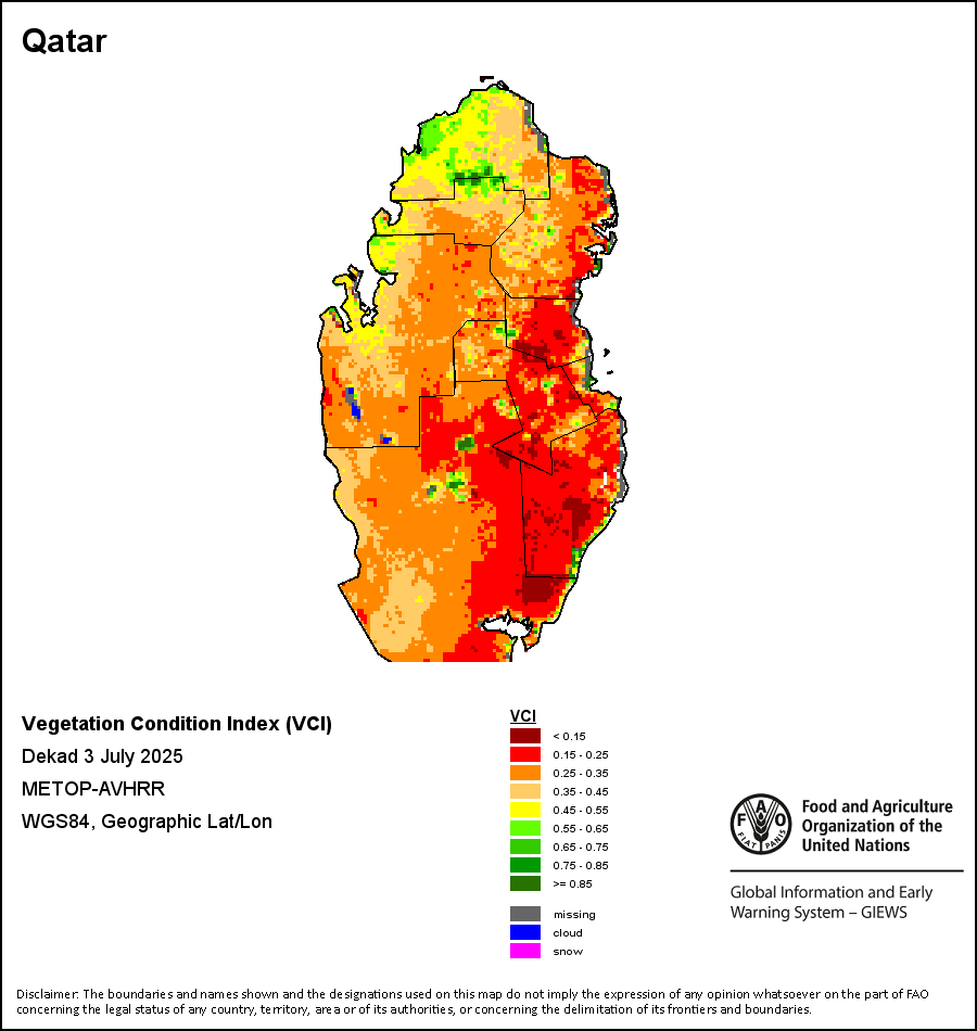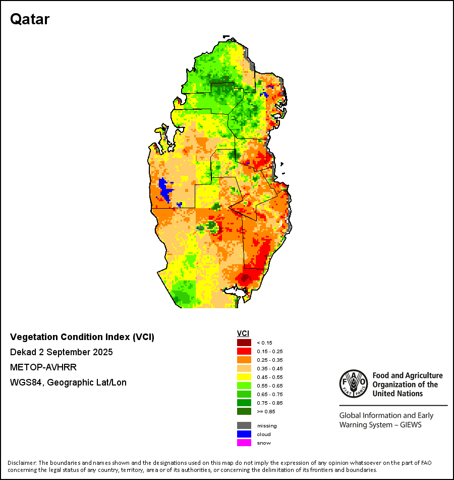 تصور الخرائط والمخططات البيانية المرسومة على مستوى البلد آخر 36 شهراً في للمؤشرات الموسمية والنباتية وتلك المتعلقة بالهطولات. وتمثل البيانات خلال فترة عشرة أيام وشهر.   أكثر